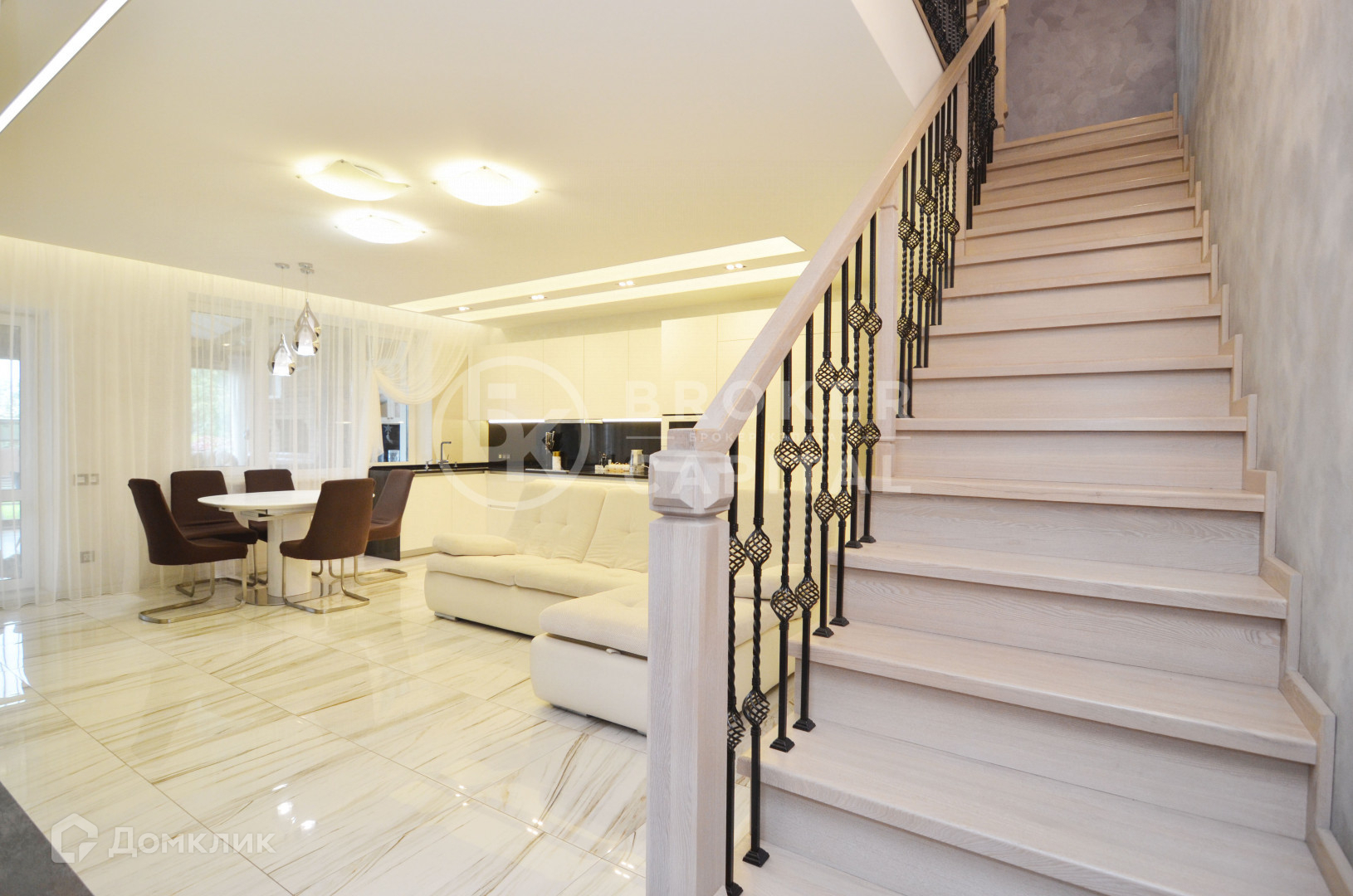 Столешница на кухне из натурального гранита, подоконники во всем доме из натурального мрамора, лестница из  ясеня.