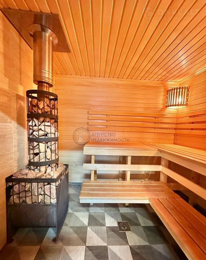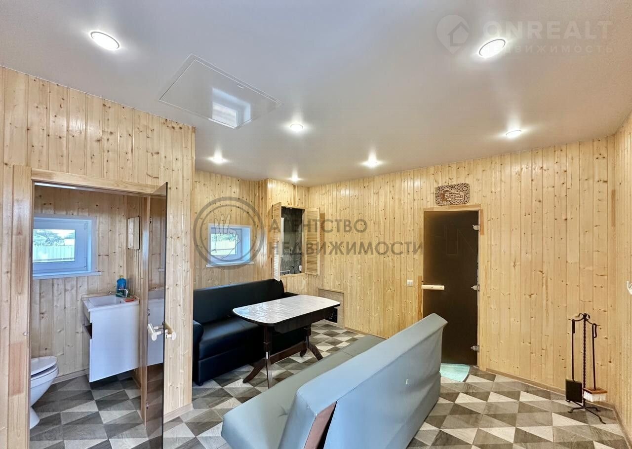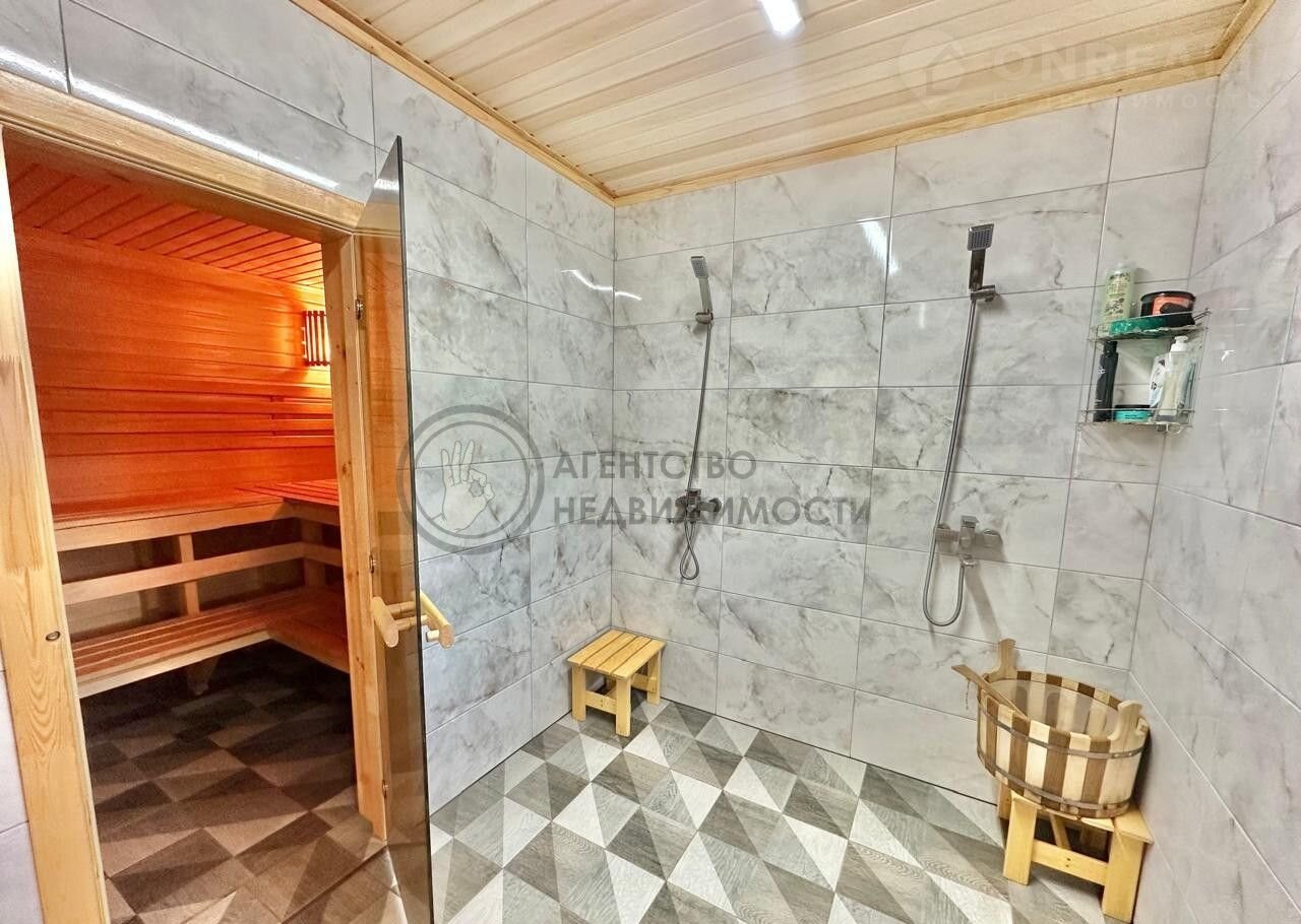 В бане гостевая комната, туалет, сауна и помывочная комната.
