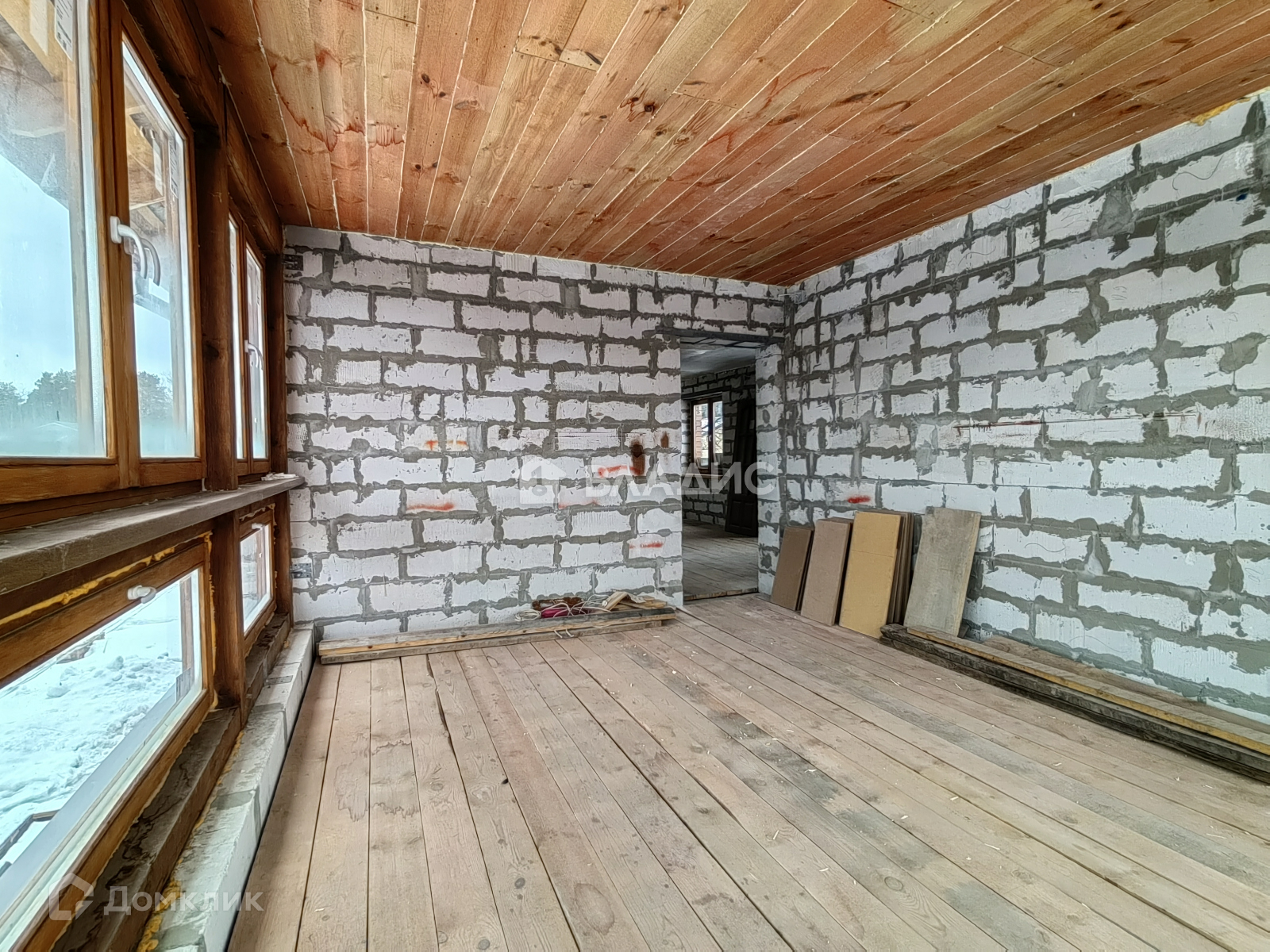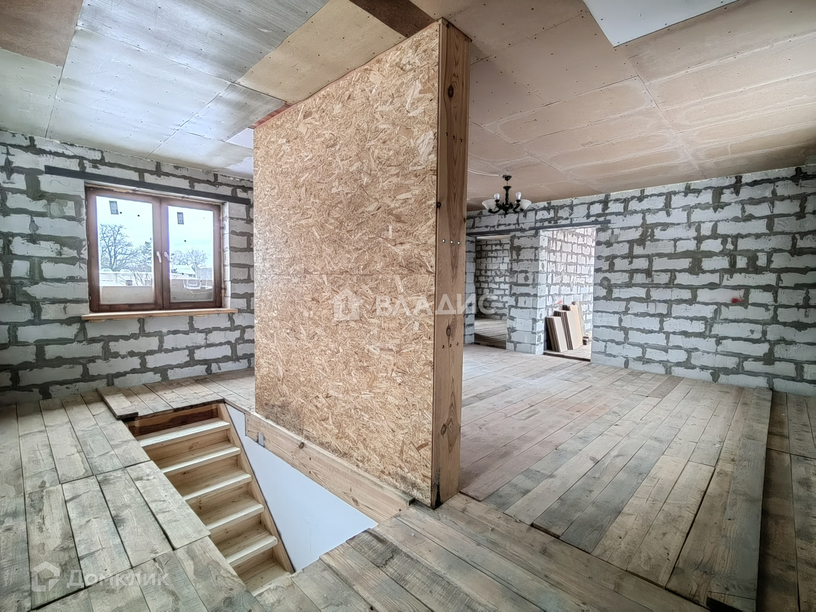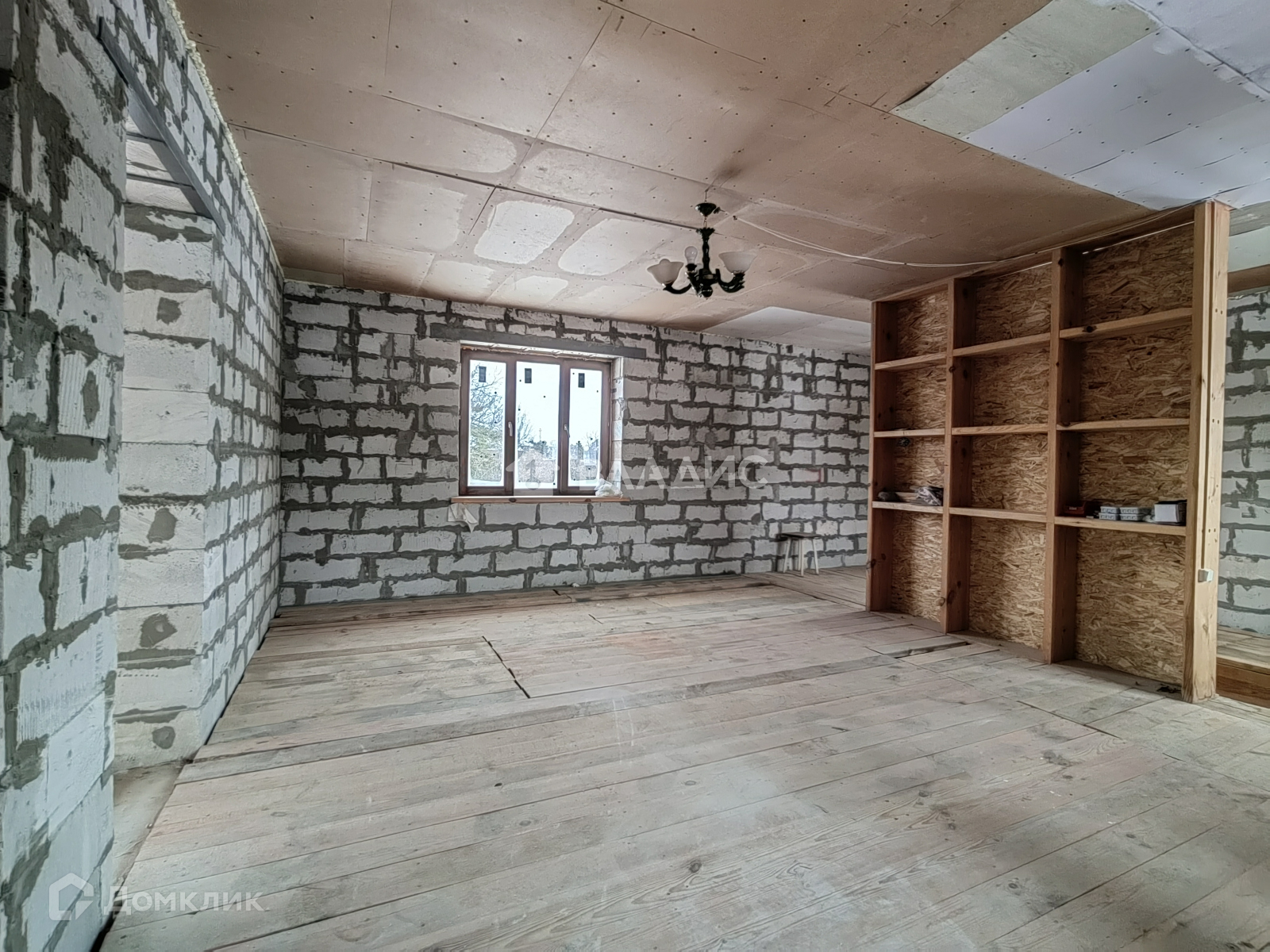 Дом полностью построен, имеет частичную отделку: залит тёплый пол, проведена новая проводка, двери, стеклопакеты, деревянная лестница, стены обшиты гипсокартоном. В доме 2 санузла (на первом и втором этаже). Имеется помещение, у которого две стены выполнены из стеклопакетов, подходящее для зимнего сада. Для удобства жителей, объект имеет несколько выходов: парадный, в сад и в гараж, который пристроен к дому.