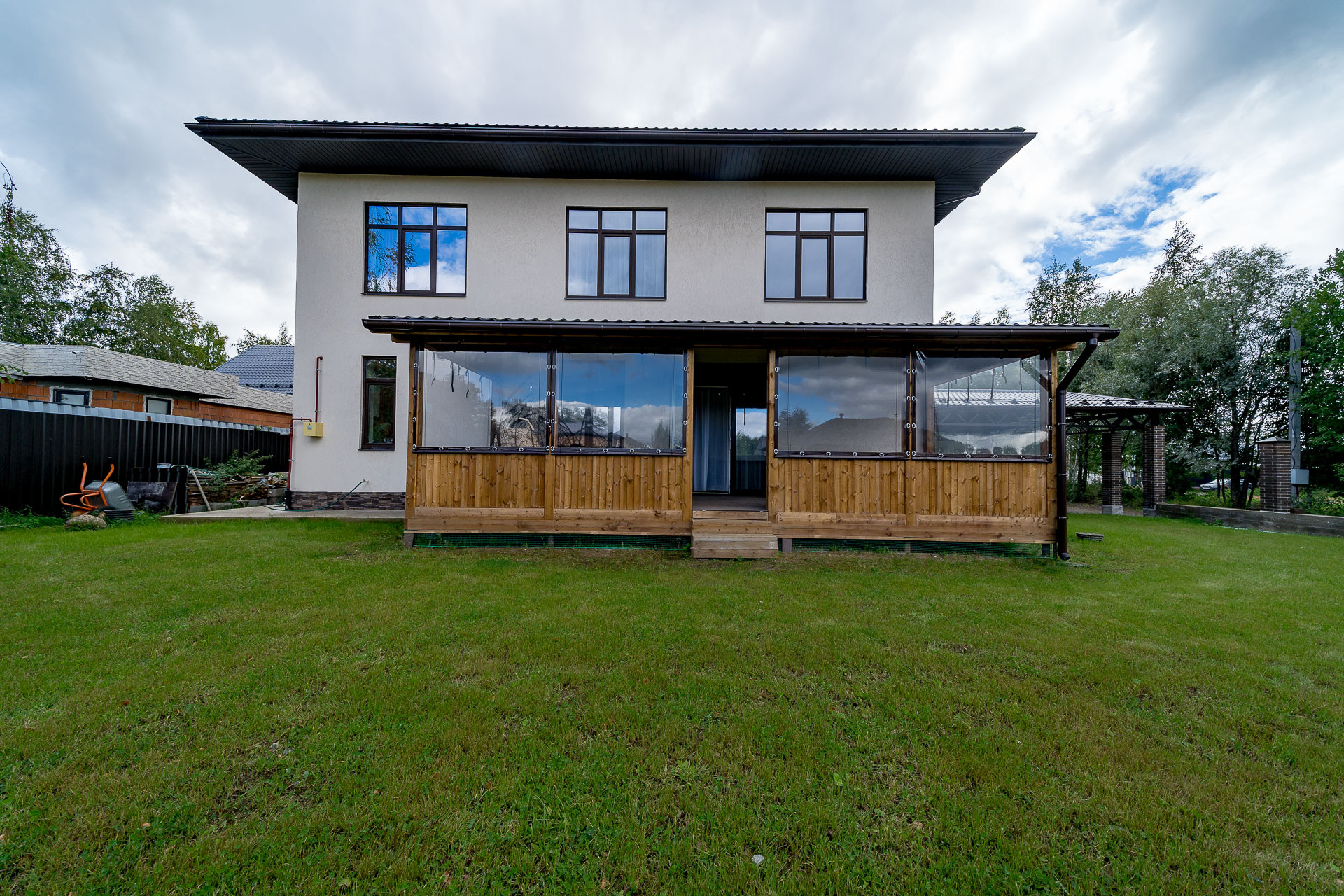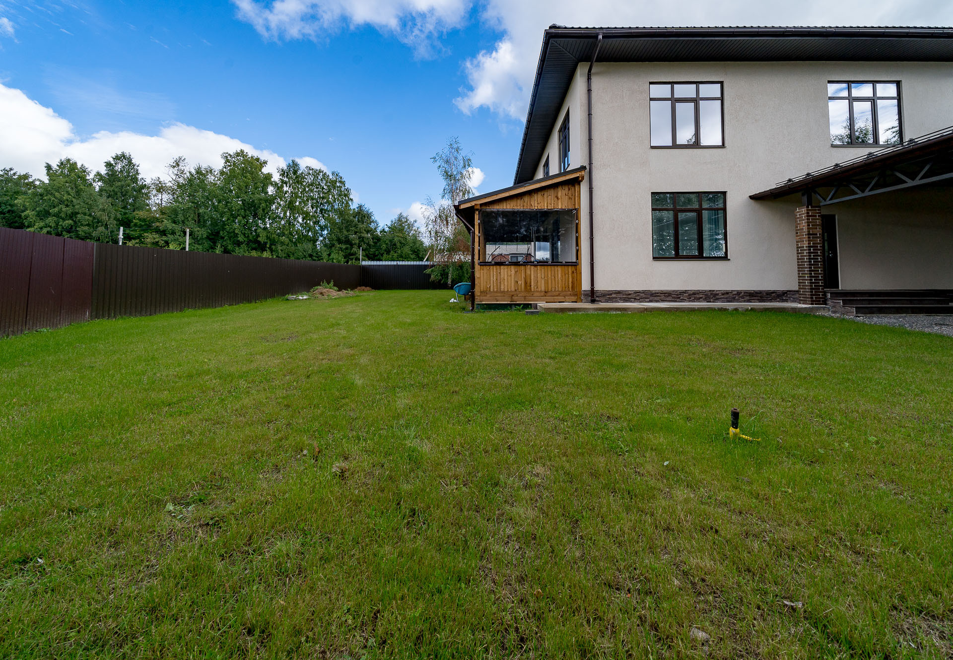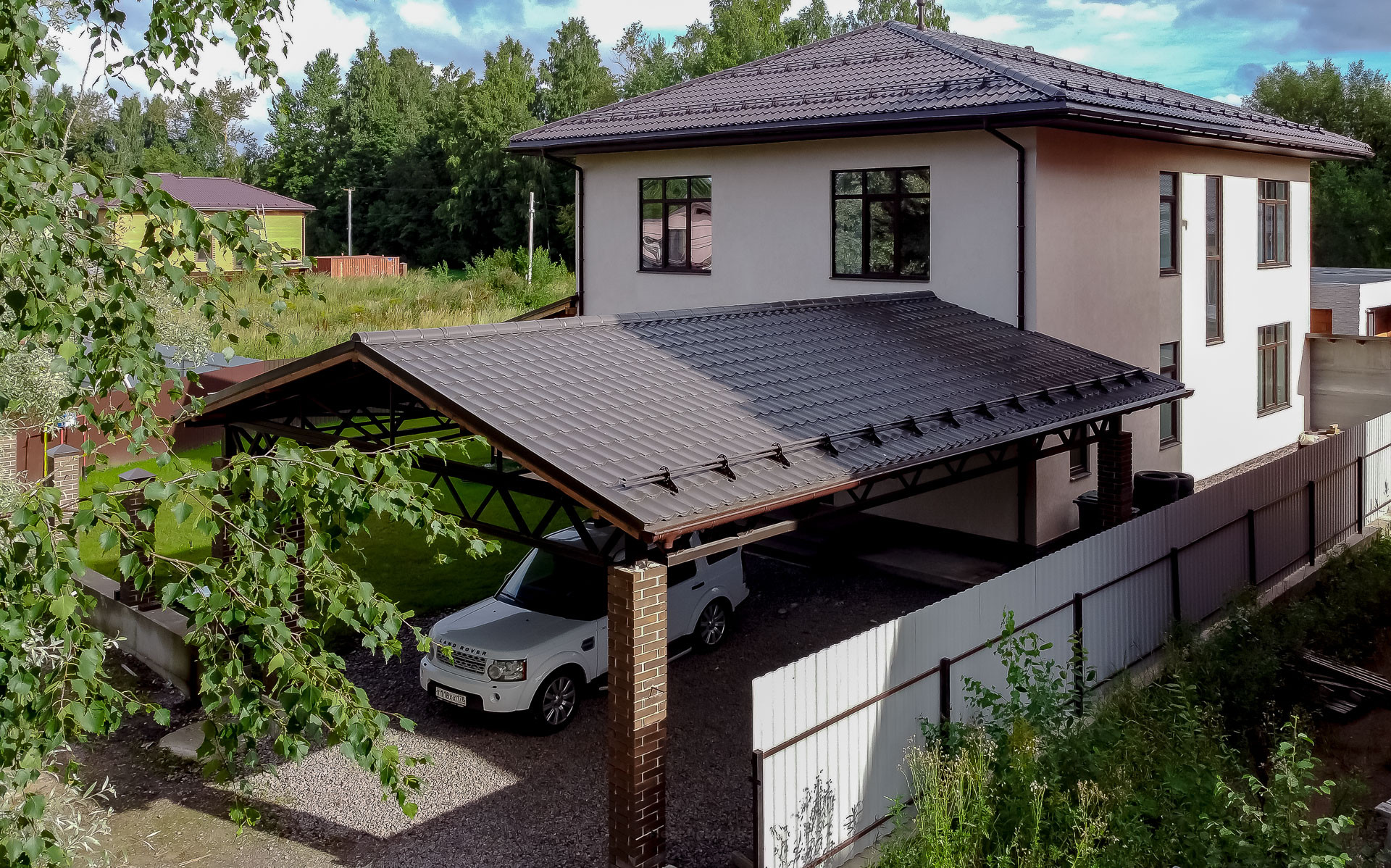 Есть пристроенная терраса, есть огромный навес для ваших автомобилей, защитит вас от снега и дождя, большая лужайка для будущей барбекю зоны, детской зоны и садовых деревьев.
