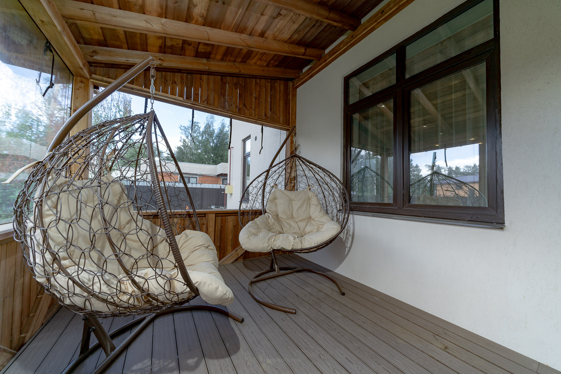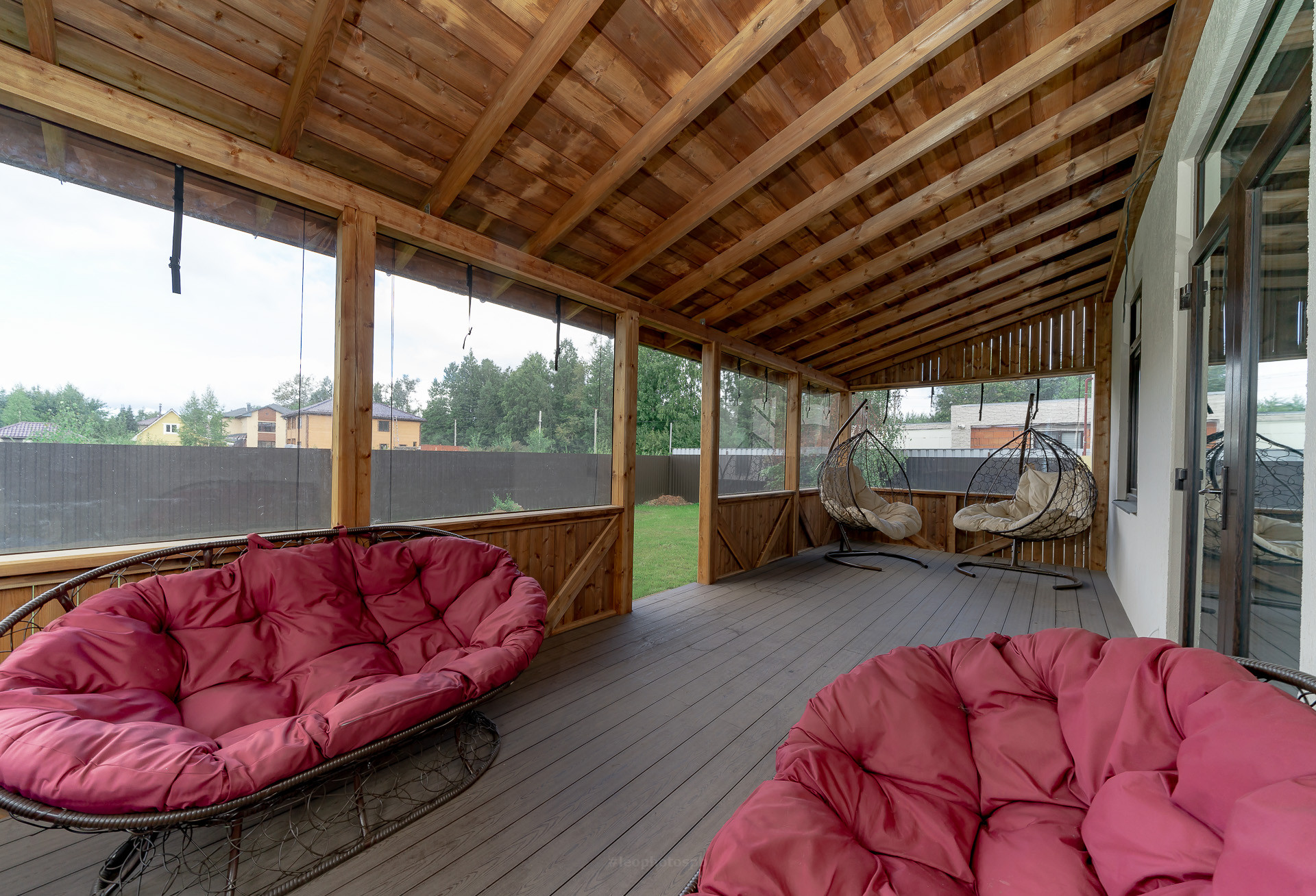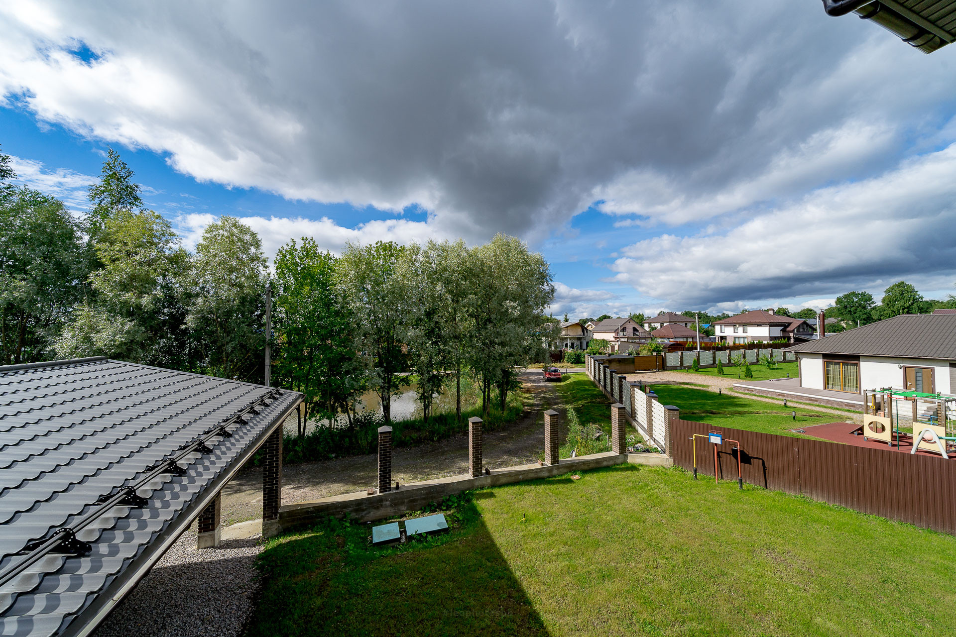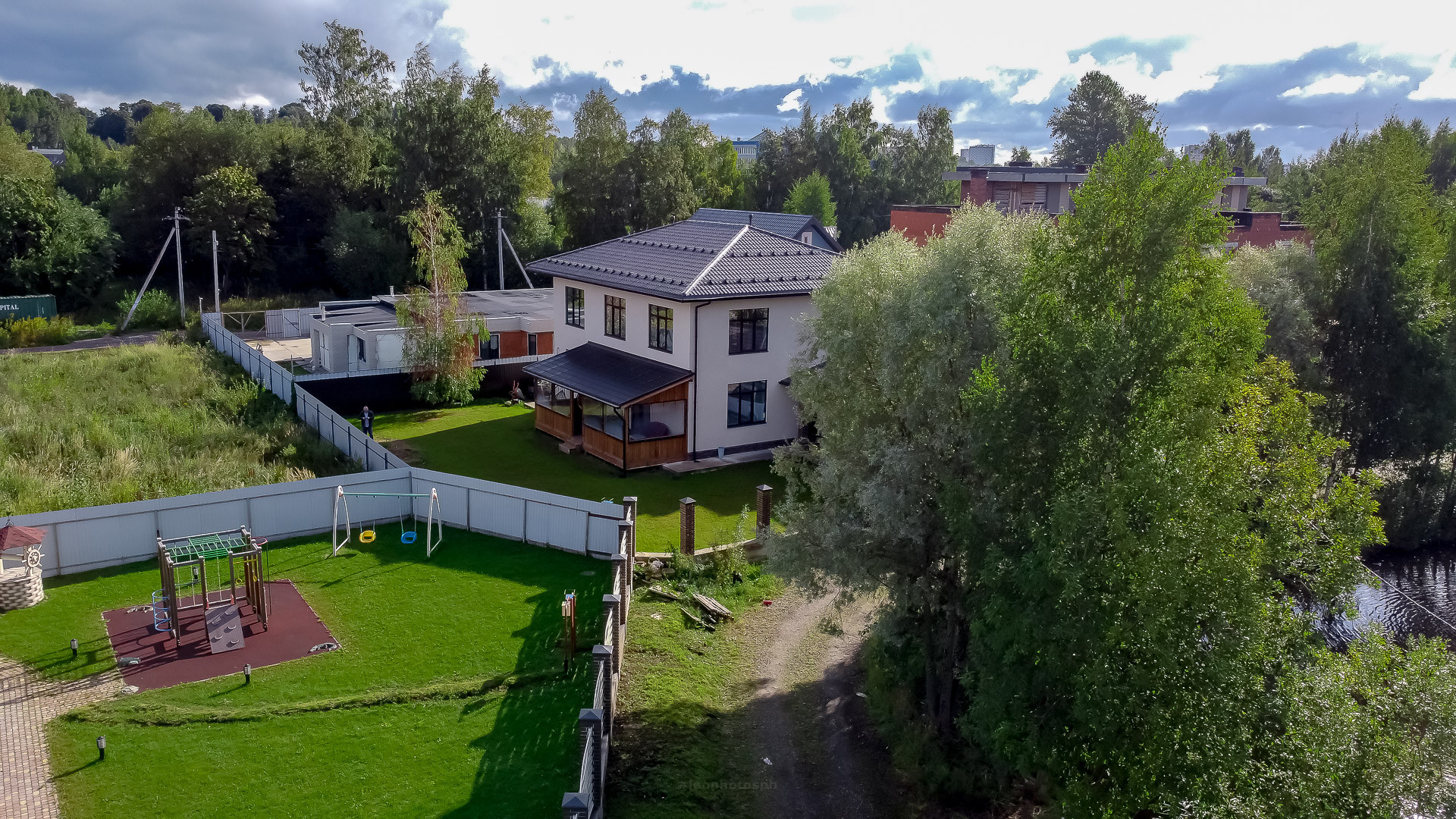 Есть пристроенная терраса, есть огромный навес для ваших автомобилей, защитит вас от снега и дождя, большая лужайка для будущей барбекю зоны, детской зоны и садовых деревьев.