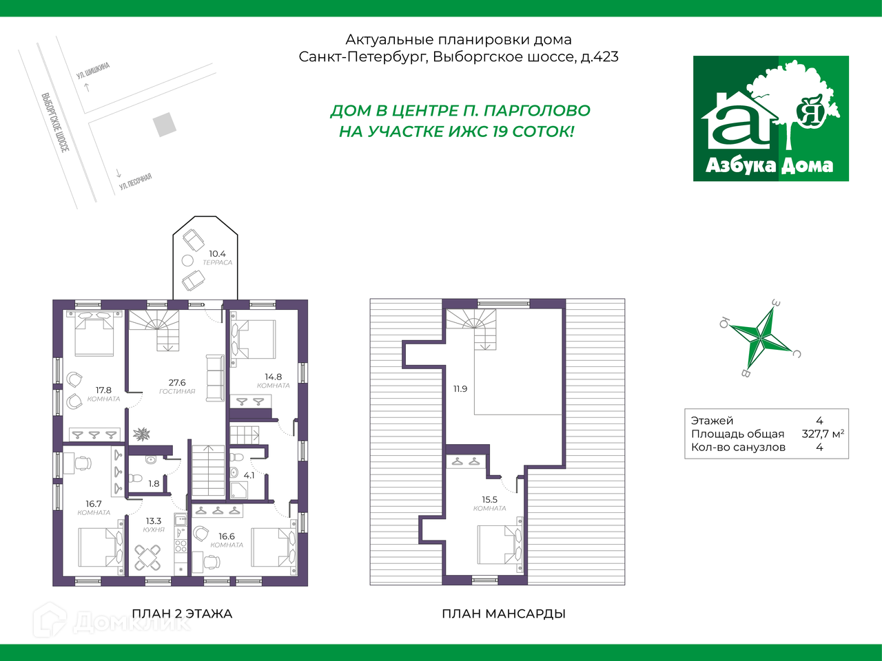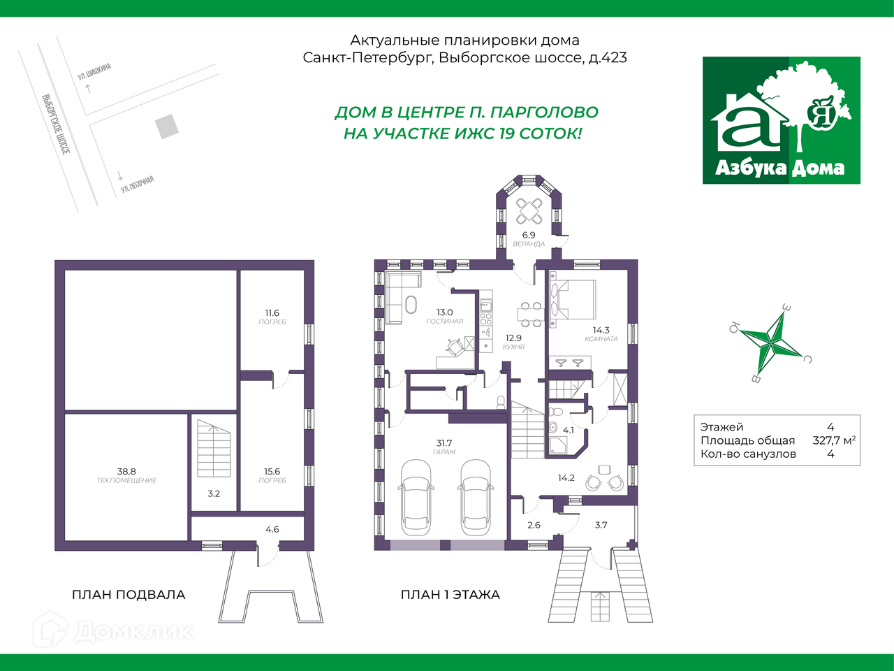 В продаже БОЛЬШОЙ дом в центре п. Парголово, Выборгского р-на, г. Санкт-Петербурга!Участок находится на Выборгском шоссе, но удачное расположение дома на участке, позволило скрыть его из виду, он отделен от дороги вековыми деревьями и кустарниками, что позволяет находясь внутри слышать тишину и пение птиц! О ДОМЕ:Общая площадь 327 кв.м ( подвал+1этаж+2этаж+мансарда).Материал стен кирпич, с деревянными вставками.Фундамент - бетонная плита+цоколь.Дом имеет два входа и может использоваться для двух семей.Подвал: техническое помещение (яма для ремонта машин)+ 2 погребаПервый этаж: гараж на 2 машины, котельная, прихожая, кухня, гостиная (13м2), комната, веранда, санузел.Второй этаж: четыре спальни, кухня, гостиная (28 м2), 2 санузла.Мансарда: спальняВАЖНЫЕ ПРЕИМУЩЕСТВА В доме остается кухонная мебель, встроенная бытовая техника, встроенные шкафы купе.Благодаря удачному расположению, возможно совмещение проживания и бизнеса, по Выборгскому шоссе расположены офисы производственных предприятий, автосервисы, кафе и магазины…Быстрый выход на сделку, к продаже все готово!!! КОММУНИКАЦИИ И ХАРАКТЕРИСТИКИ:централизованное водоснабжение, канализация, электричество,дом газифицирован и отапливается за счет газового котла.ЗЕМЕЛЬНЫЙ УЧАСТОК:огороженный участок 19 сотокна участке расположена БАНЯ на дровахучасток прямоугольной формы, выровнен, вымощены дорожкибольшая теплица, удачно вписанная в ландшафт участка2 въезда на участок, с наличием парковочных мест с тентом, есть отдельный гаражвыделенная мангальная зона и хозяйственные постройкина участке много зелени, больших деревьев, кустов, цветов и садовых растенийТРАНСПОРТНАЯ ДОСТУПНОСТЬ:Идеальная транспортная доступность:от м. пр.Просвещения, Озерки ходят маршрутки и автобусы прямо до дома5-7 минут на автомобиле от метроРядом выезд на КАД, дорога до центра города занимает не более 30 минут!ИНФРАСТРУКТУРА:Вся необходимая социальная инфраструктура в шаговой доступности! ( детский сад, школа, поликлиника, полиция, спортивные комплексы, автосервисы)Строительные и продуктовые сетевые гипермаркеты и магазины рядом с домом!Недалеко от дома расположен Шуваловский парк и несколько озер!ЗВОНИТЕ! ПРОВЕДЕМ ПРОСМОТР В УДОБНОЕ ВРЕМЯ! -