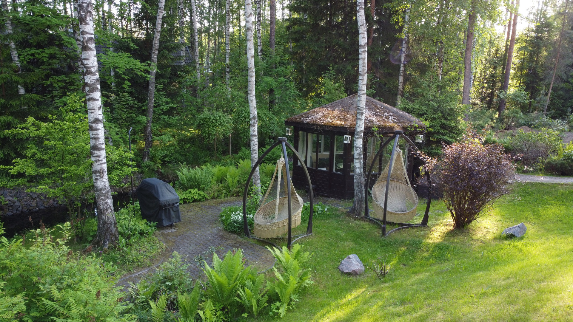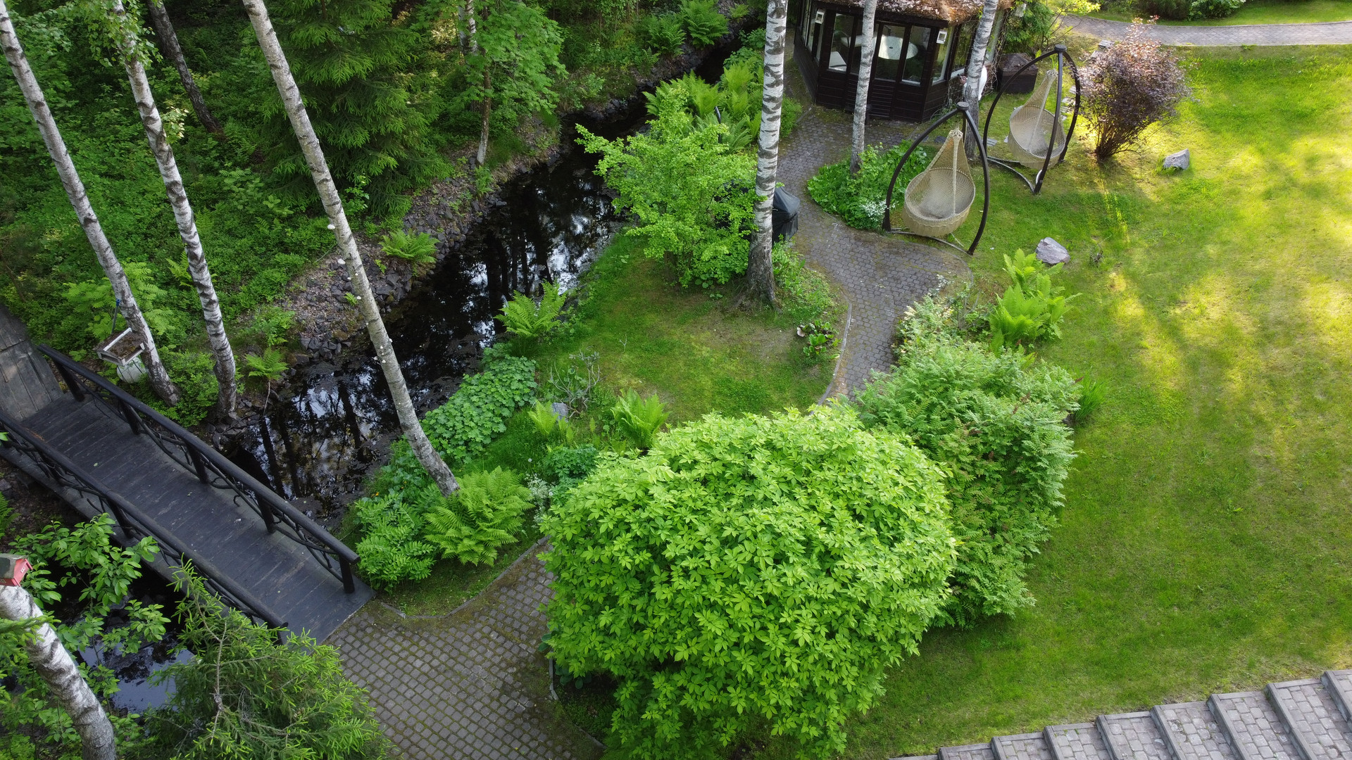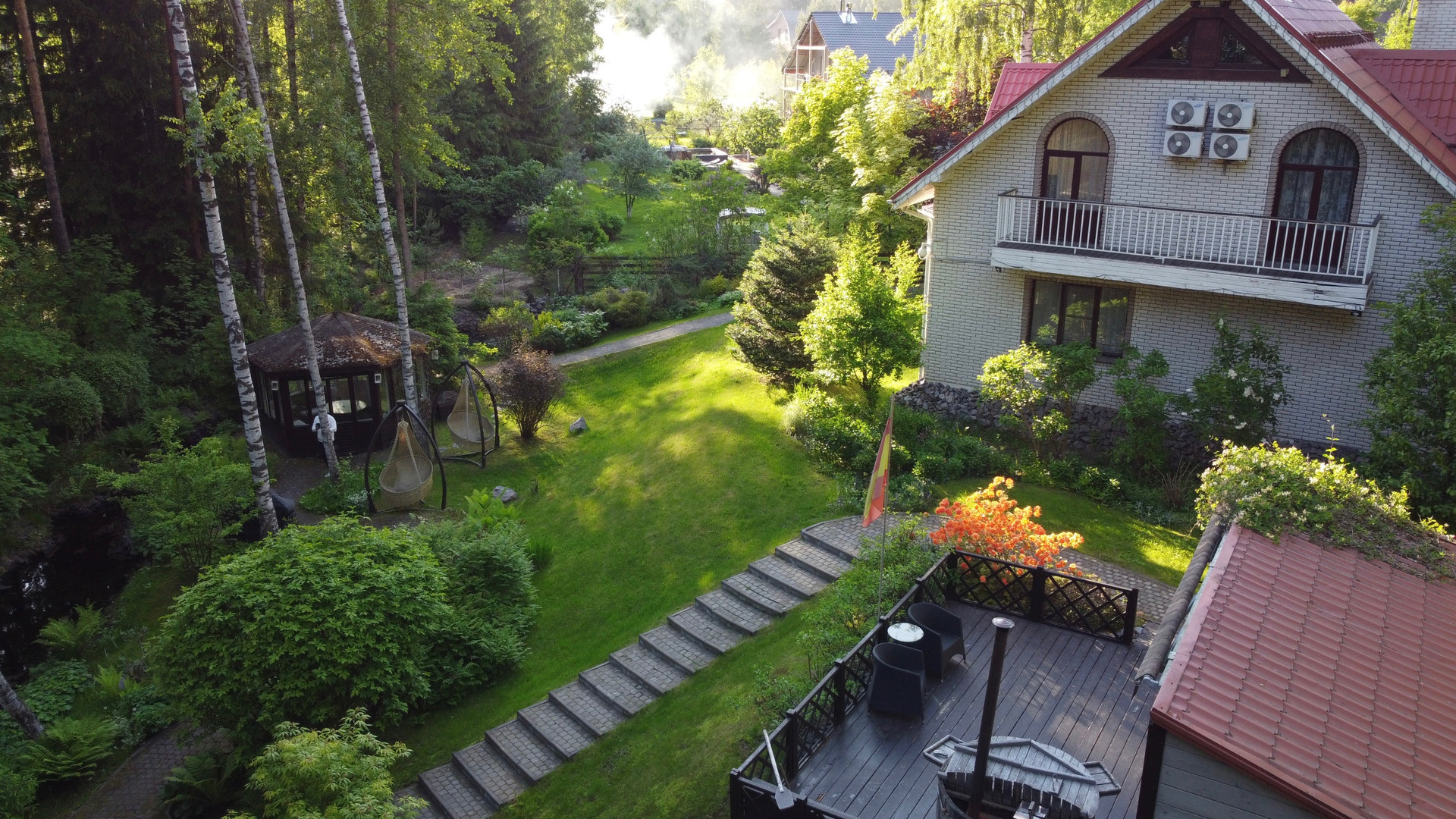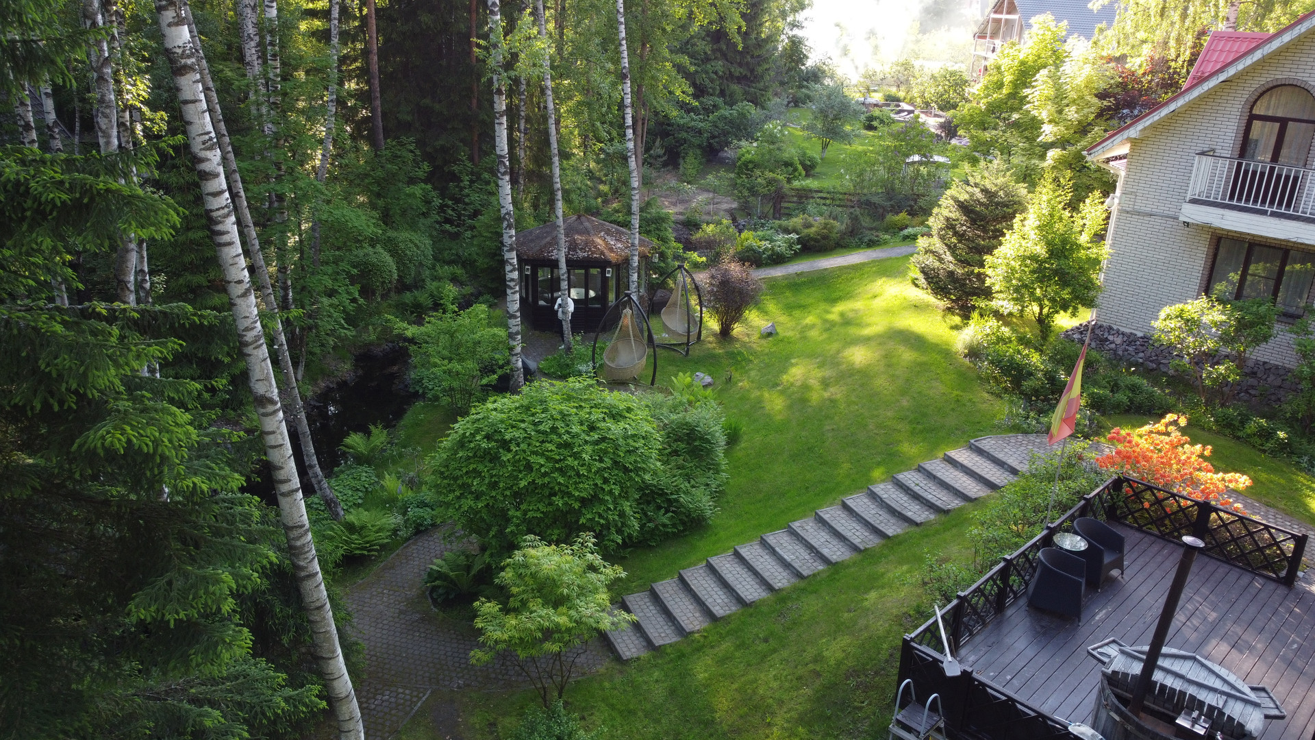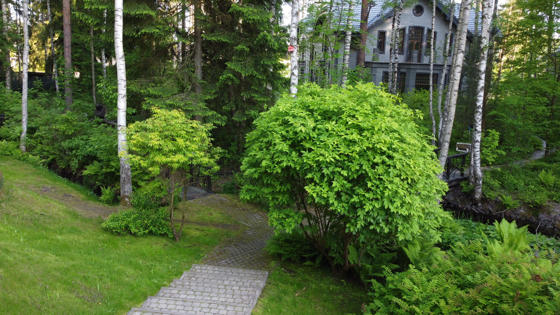 Дом расположен на возвышенности и скрыт от соседей собственным густым лесом. Участок украшают хвойные деревья и ландшафтный газон, оборудованный автоматической системой полива. По территории проходит ручей на берегу которого построена закрытая мангальная зона. Через ручей возведен мост. Пешеходные дорожки покрыты антискользящим покрытием.