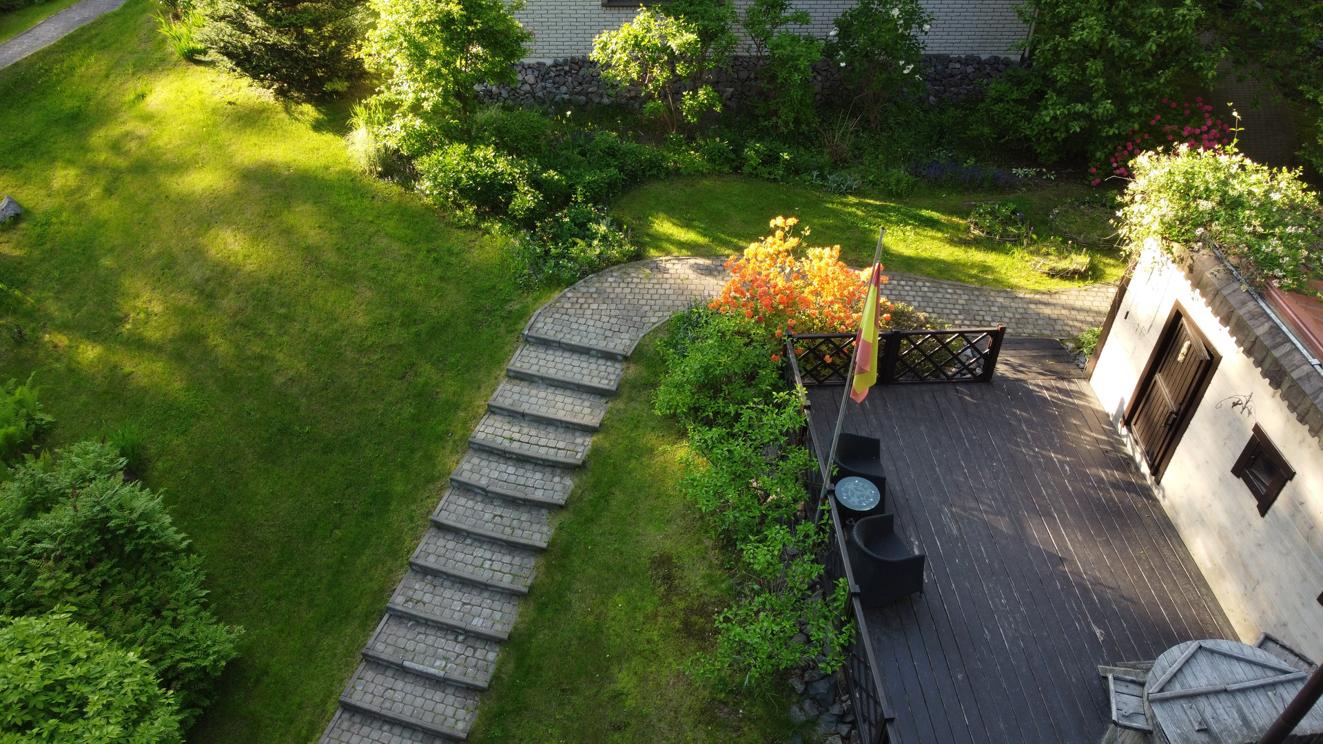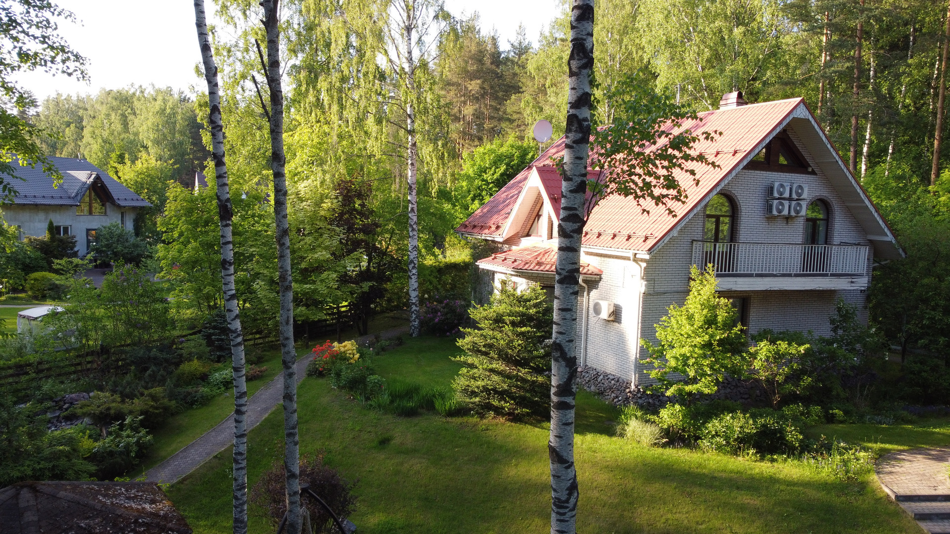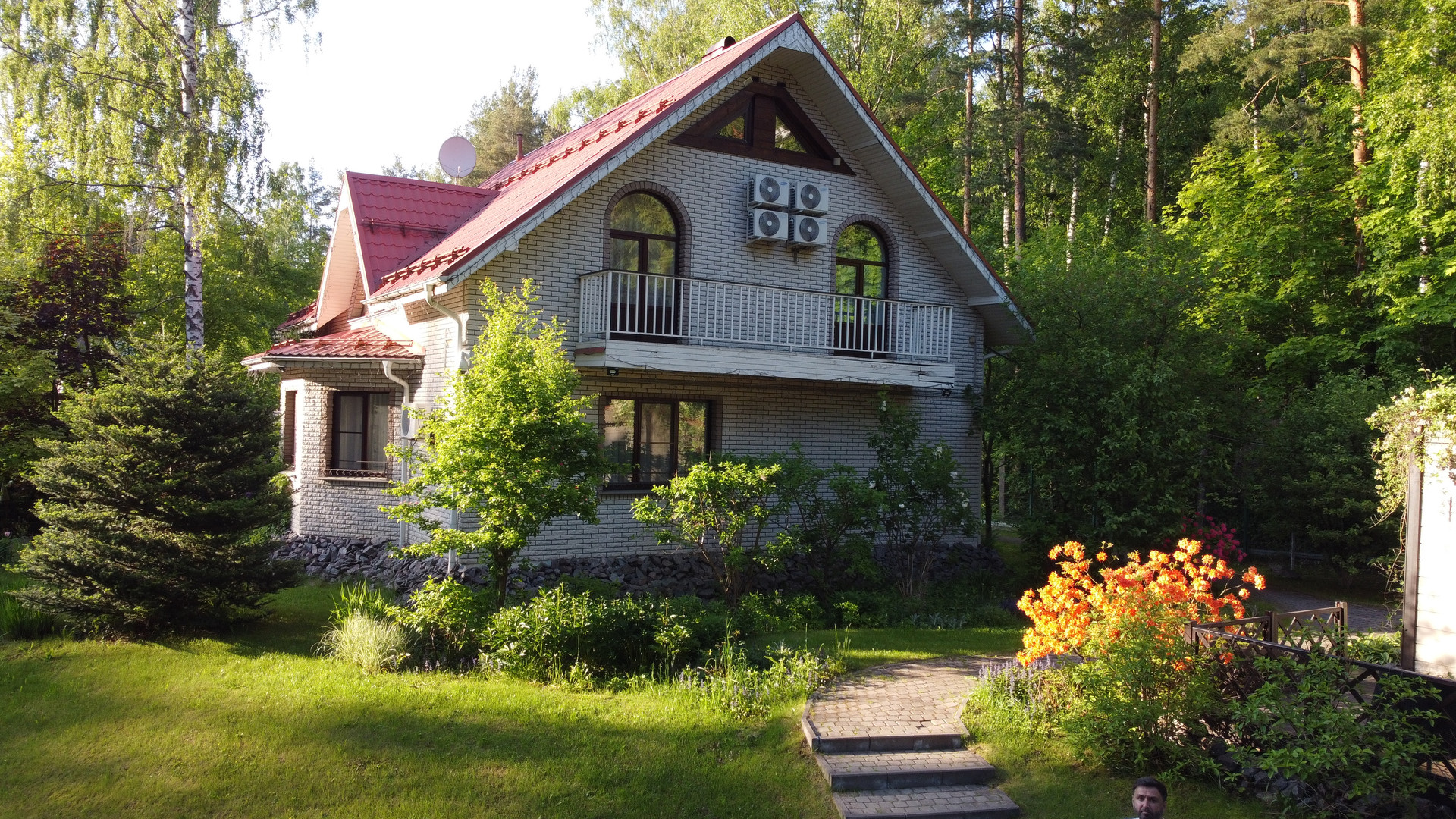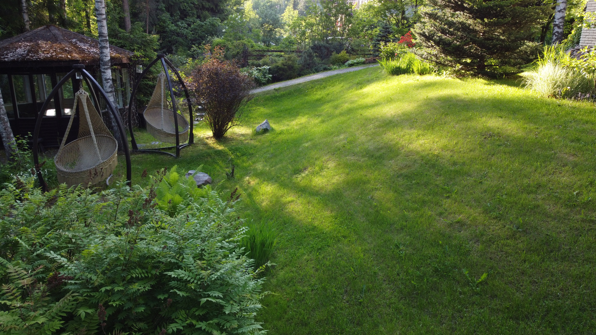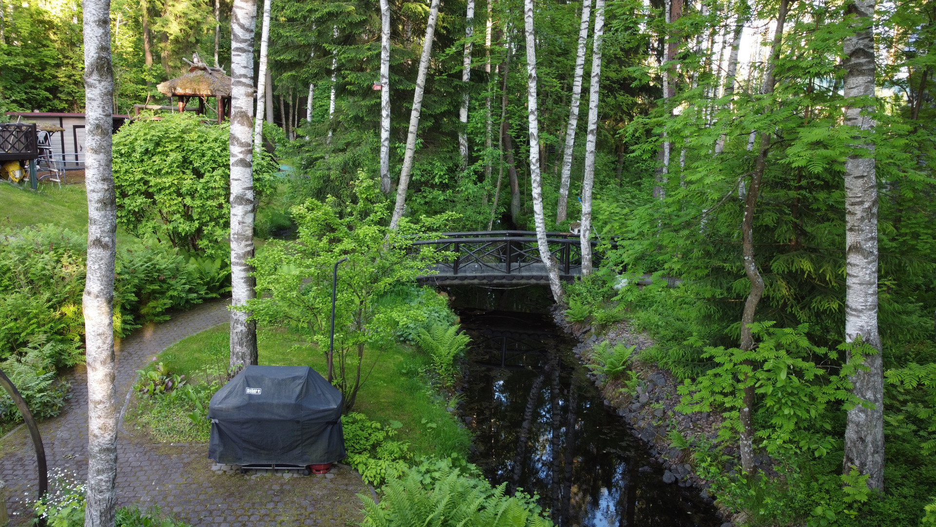 Дом расположен на возвышенности и скрыт от соседей собственным густым лесом. Участок украшают хвойные деревья и ландшафтный газон, оборудованный автоматической системой полива. По территории проходит ручей на берегу которого построена закрытая мангальная зона. Через ручей возведен мост. Пешеходные дорожки покрыты антискользящим покрытием.