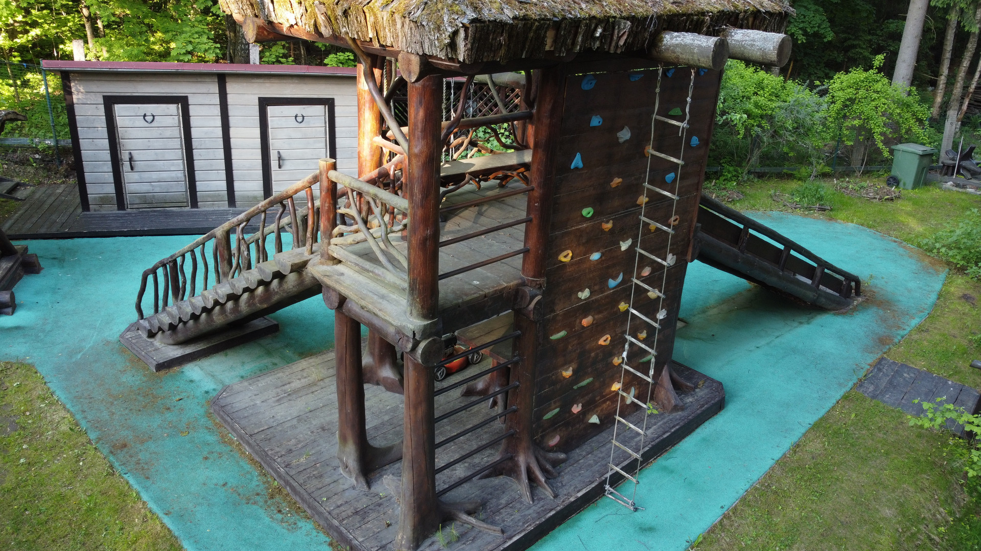 Построена баня с купелью, каждый, кто хоть раз бывал в русской бане и пробовал окунуться в купель знают, какой приятный эффект и польза от этой процедуры. Обустроена большая детская территория, это сооружение не только захватит внимание ребёнка, но и поспособствует его физическому и умственному развитию.