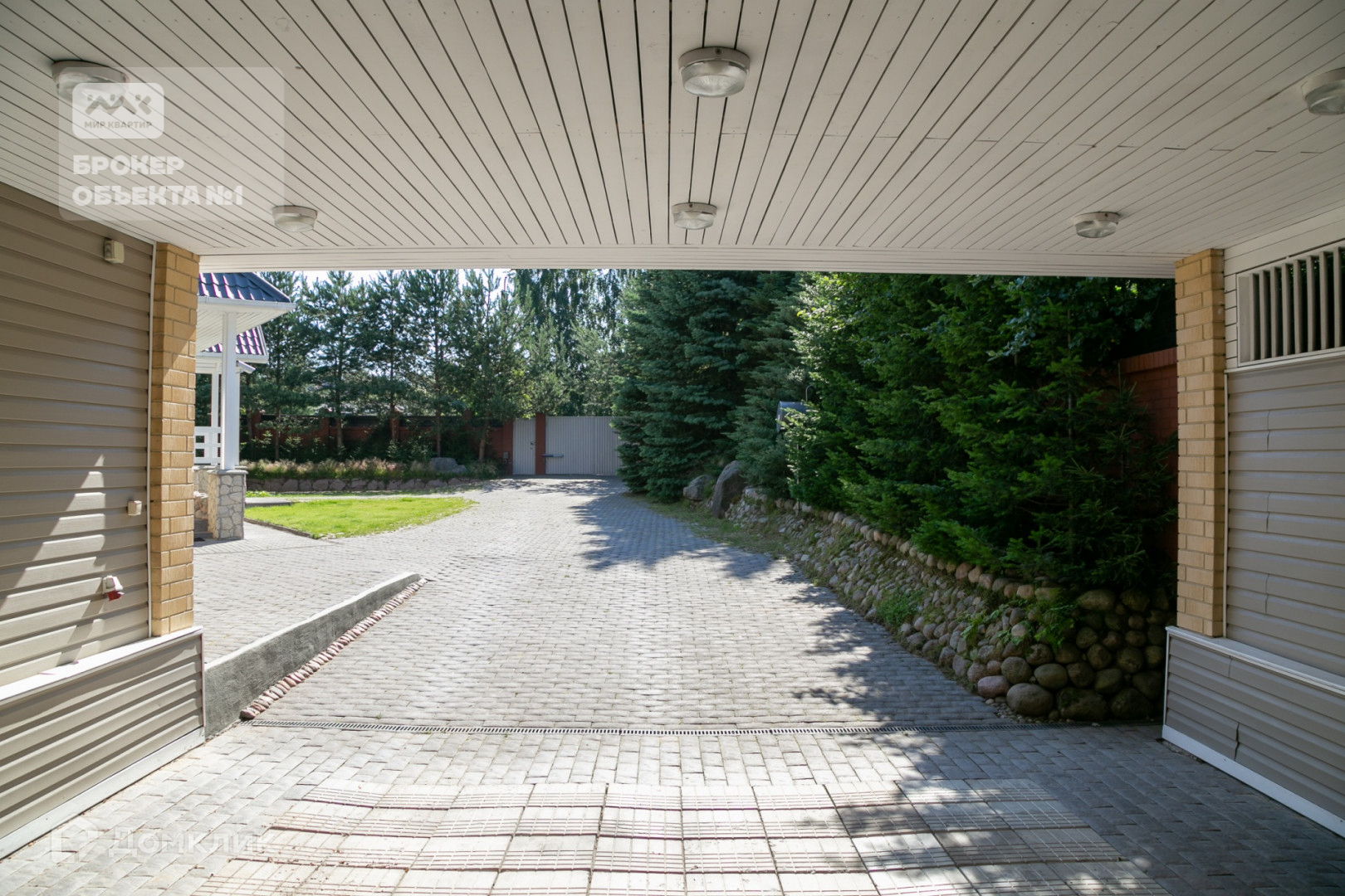 В отдельное строение вынесены: котельная (котел Buderus 90 квт, работает на газе и дизельном топливе), крытая стоянка на две машины, гараж.