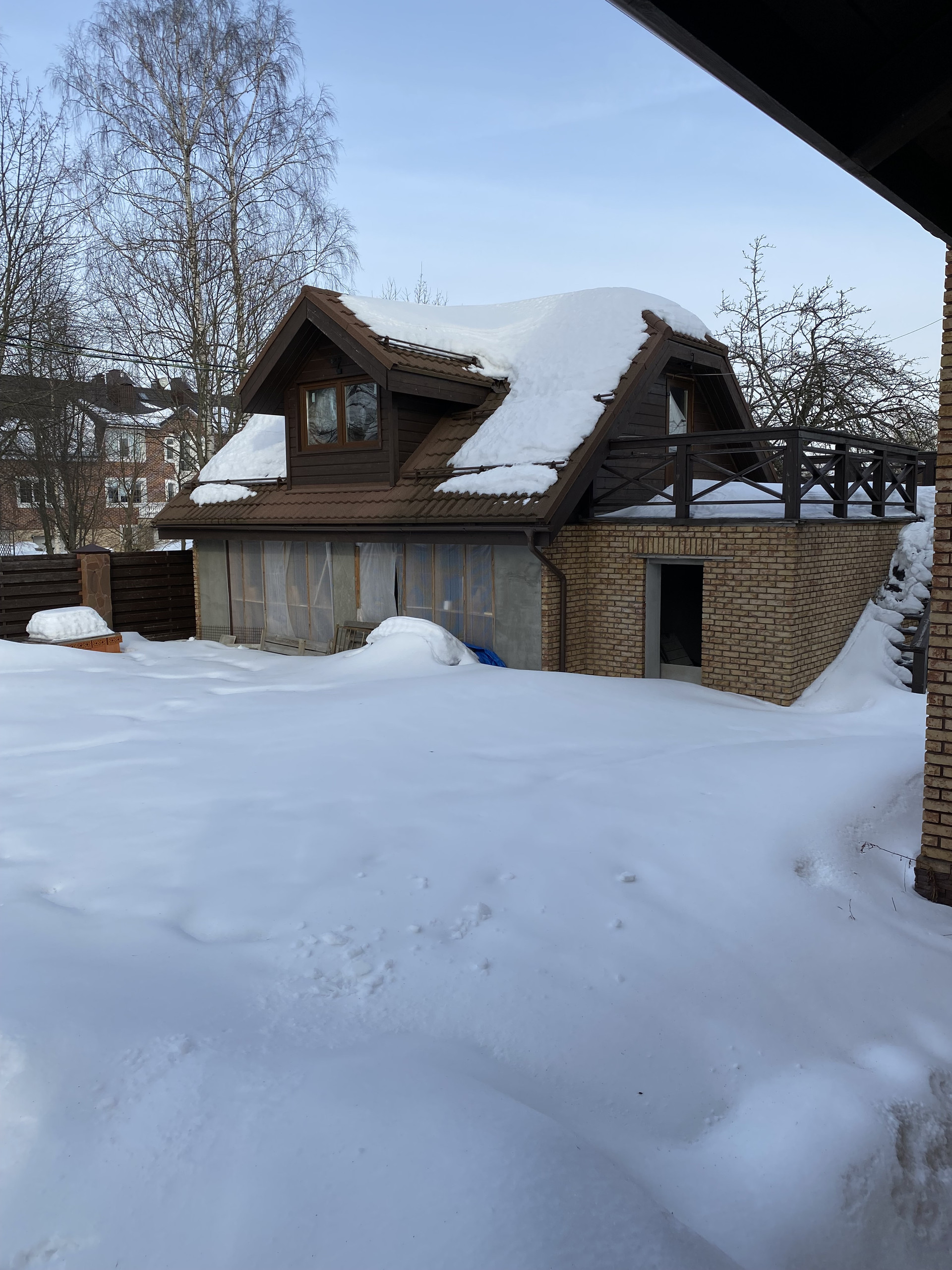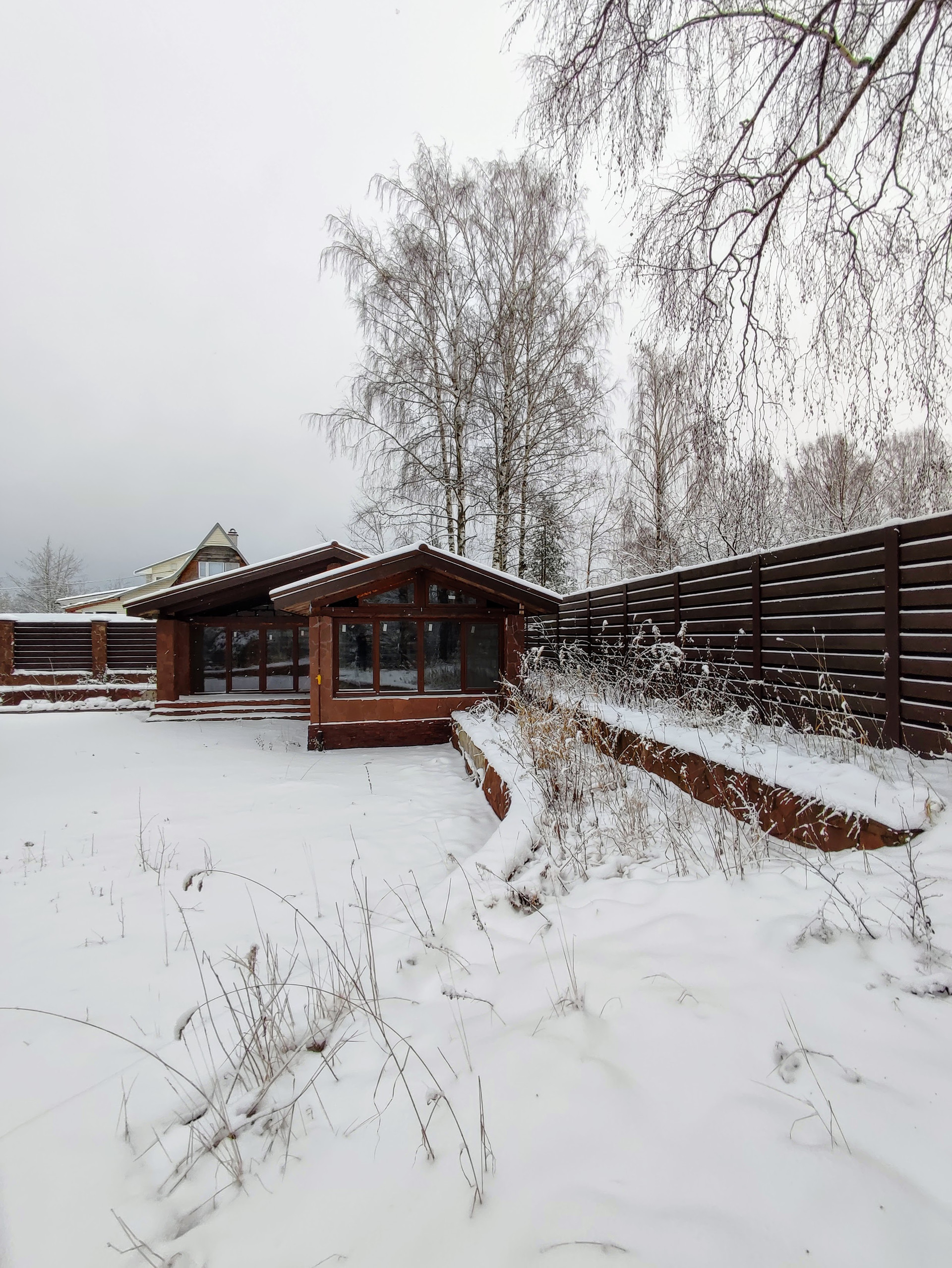 На участке стоят зимний дом площадью 267 кв м, гараж на 2 автомобиля и домик для барбекю.