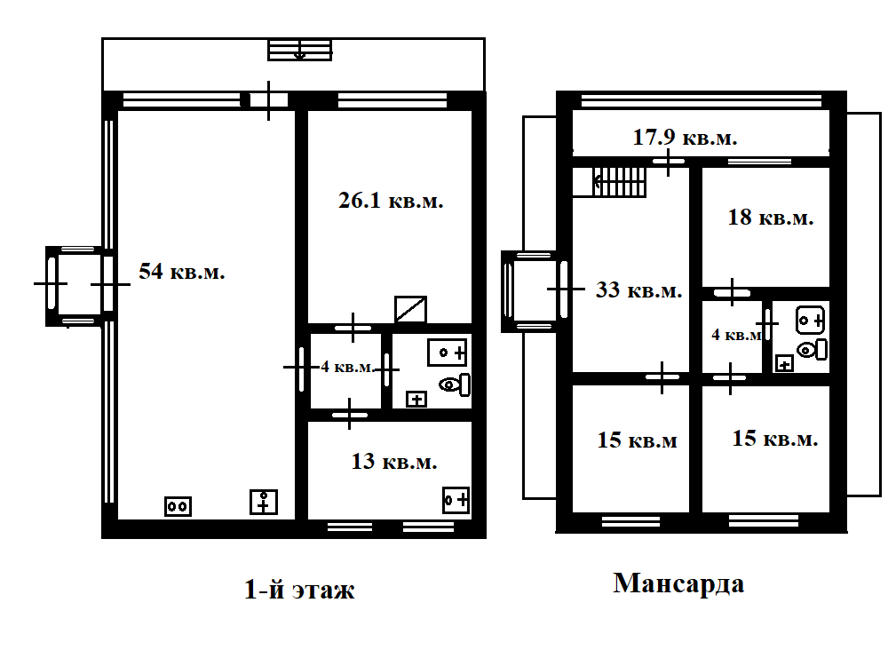 • 1й этаж: кухня-гостиная 54 кв.м., комната 26.1 кв.м. с действующим камином, душевая с туалетом 4.7 кв.м., комната 13 кв.м. под котельную (тех. Помещение), терраса 20 кв.м.