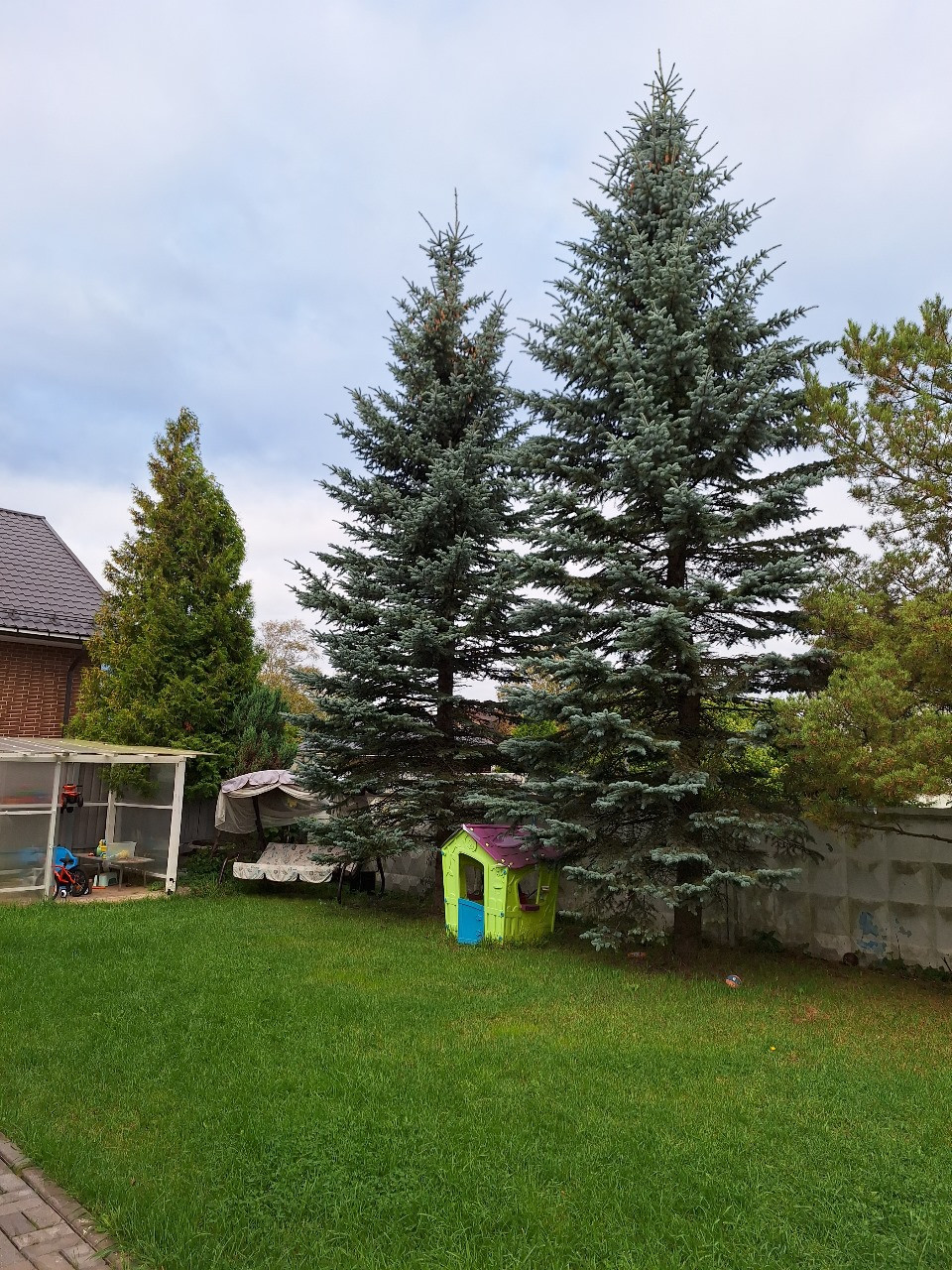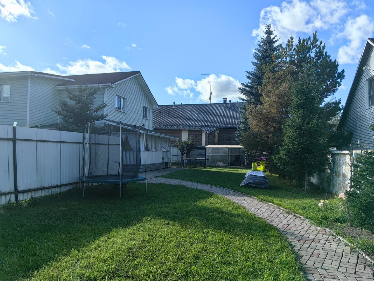 На участках: открытое патио со столом и стульями, предусмотрено оборудование для крепления гамака, мангальная зона, ели, туи, елки, навес для игр детей в солнечные дни, а также 3 хоз.помещения.