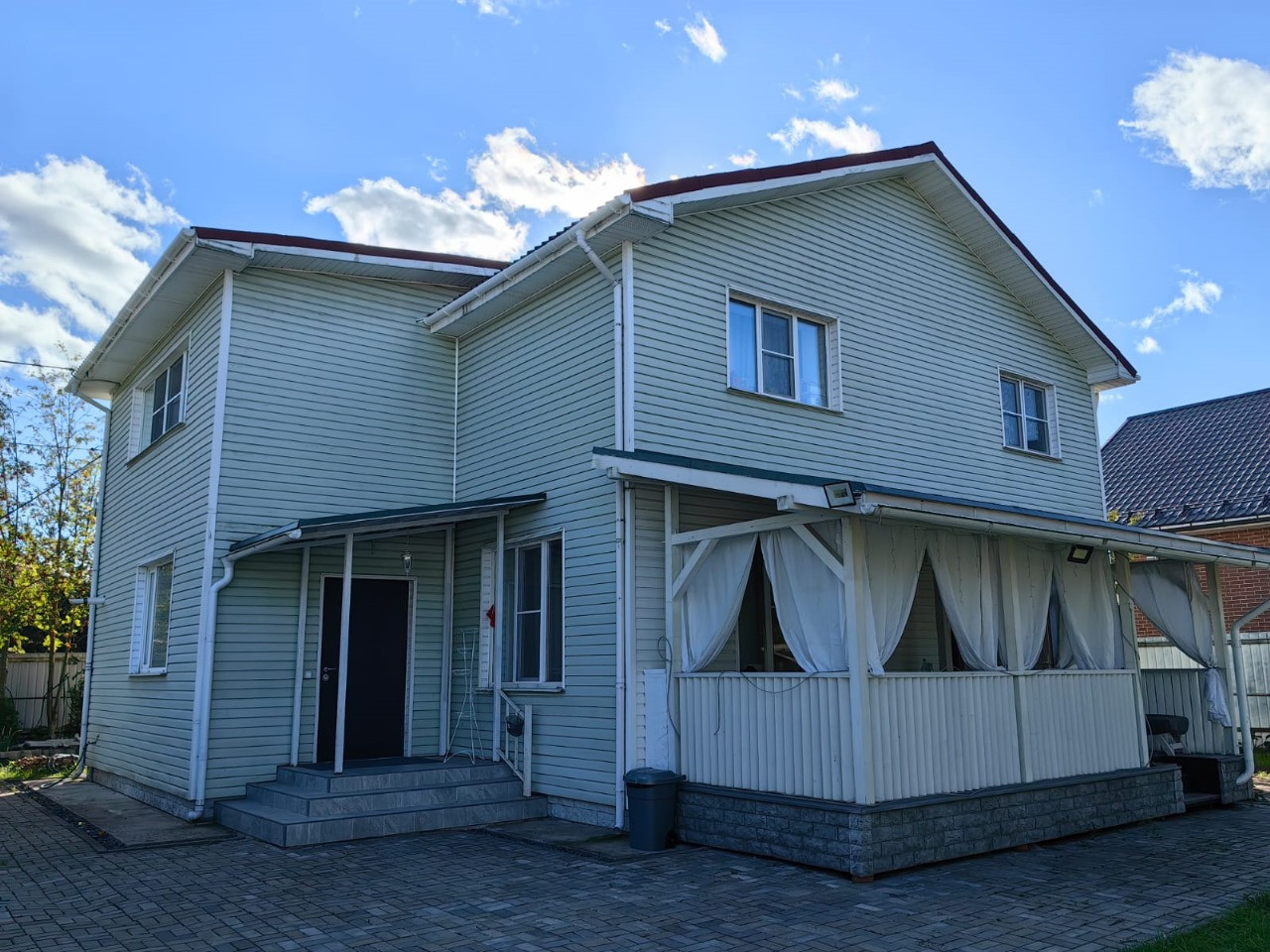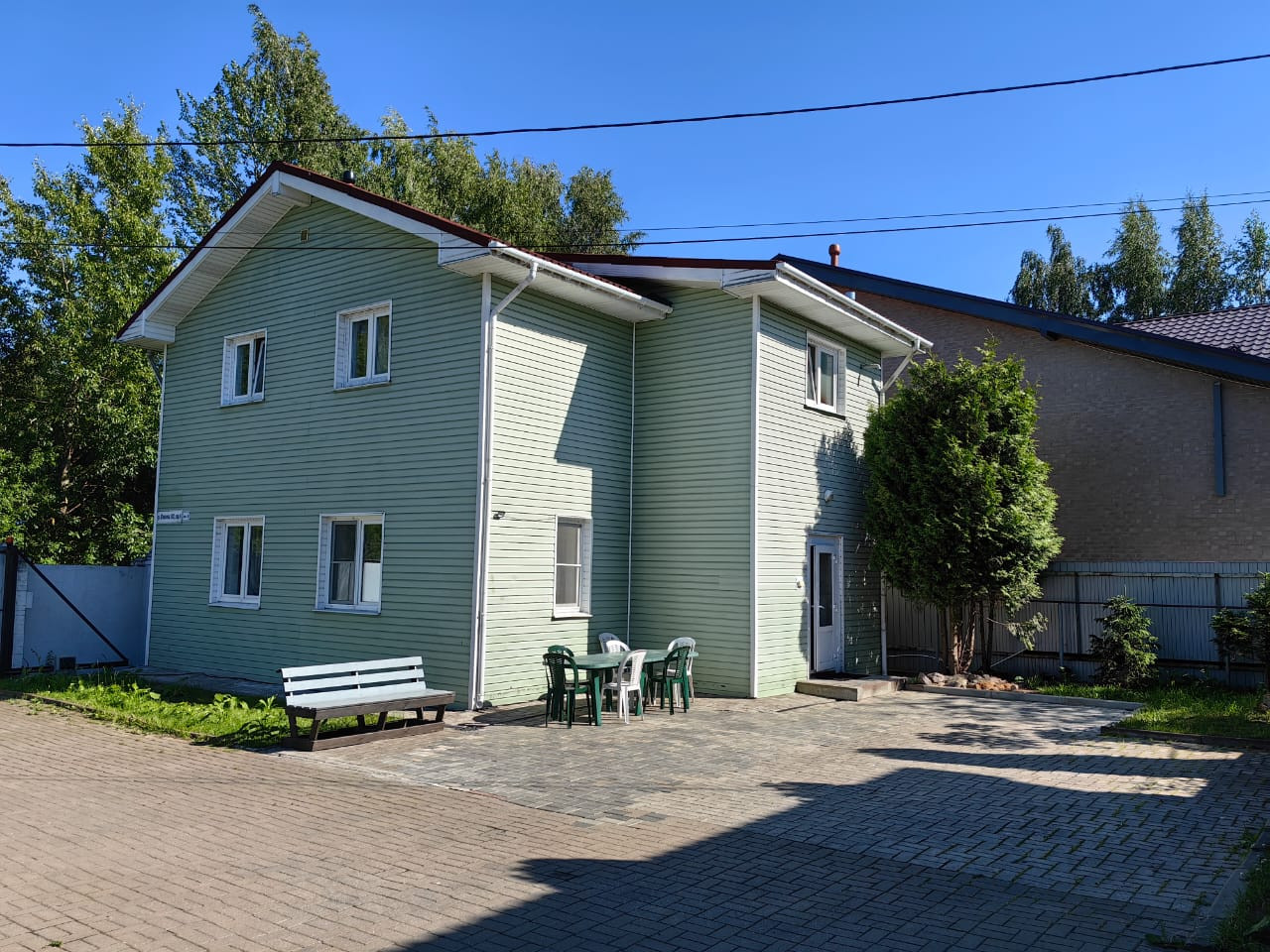 Участок (11 соток) разделен забором (4 и 7 сотки), у каждого дома своя территория и свои подъездные ворота (откатные, на пульте).