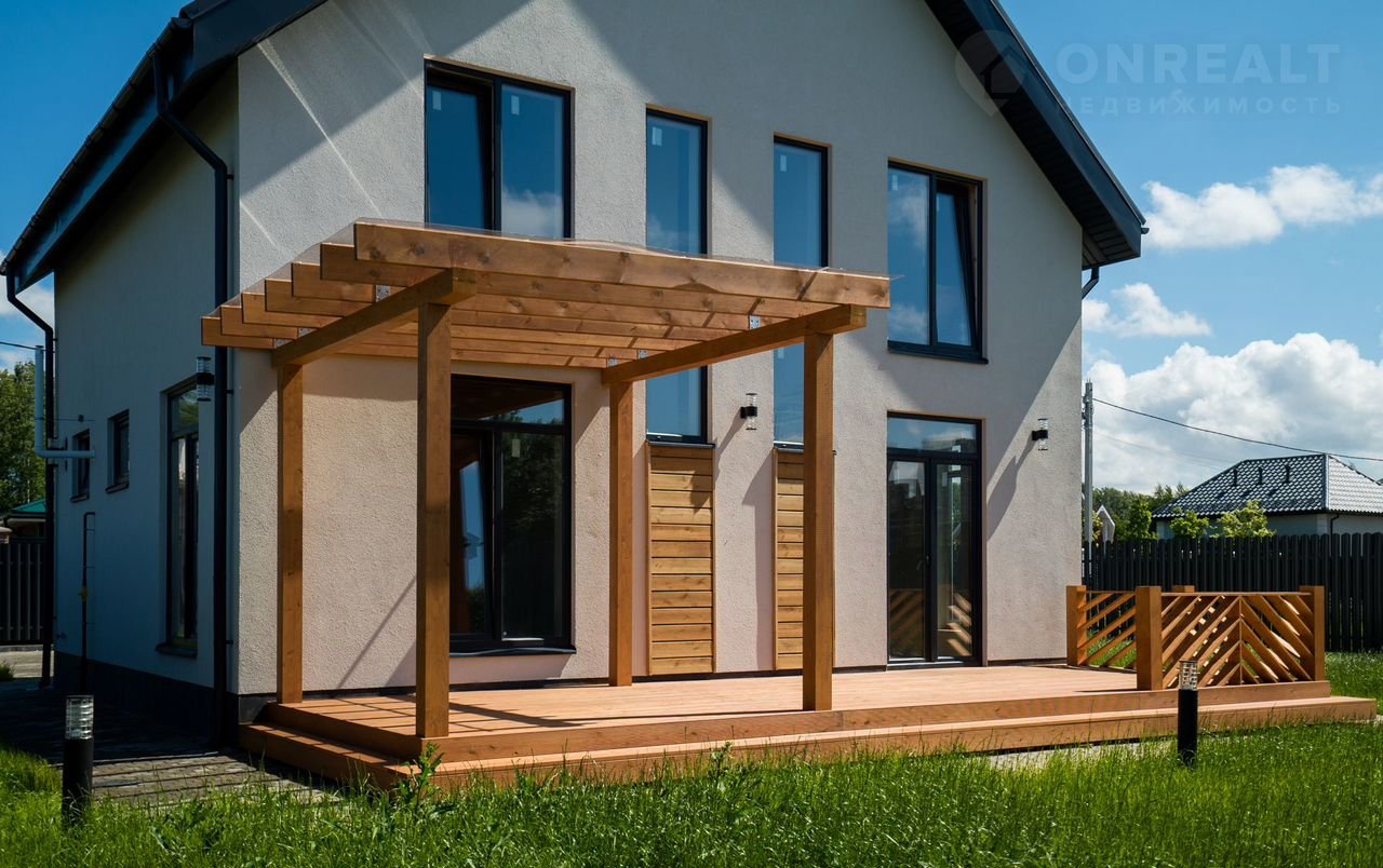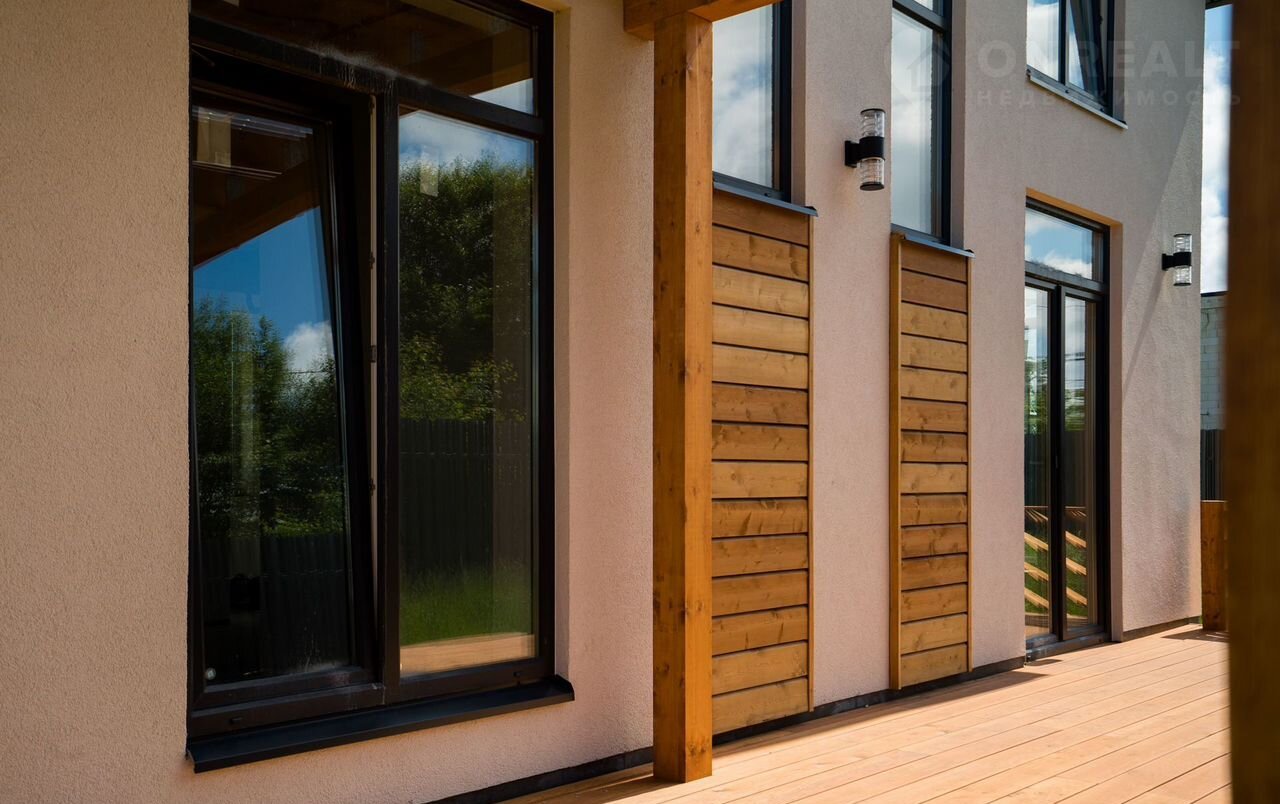 В доме просторная кухня-гостиная 30м², 4 спальни, 2 санузла - есть все для для современной комфортной жизни семьи. Панорамные окна, видовой балкон и просторная красивая функциональная терраса из бруса 28,8 м²
