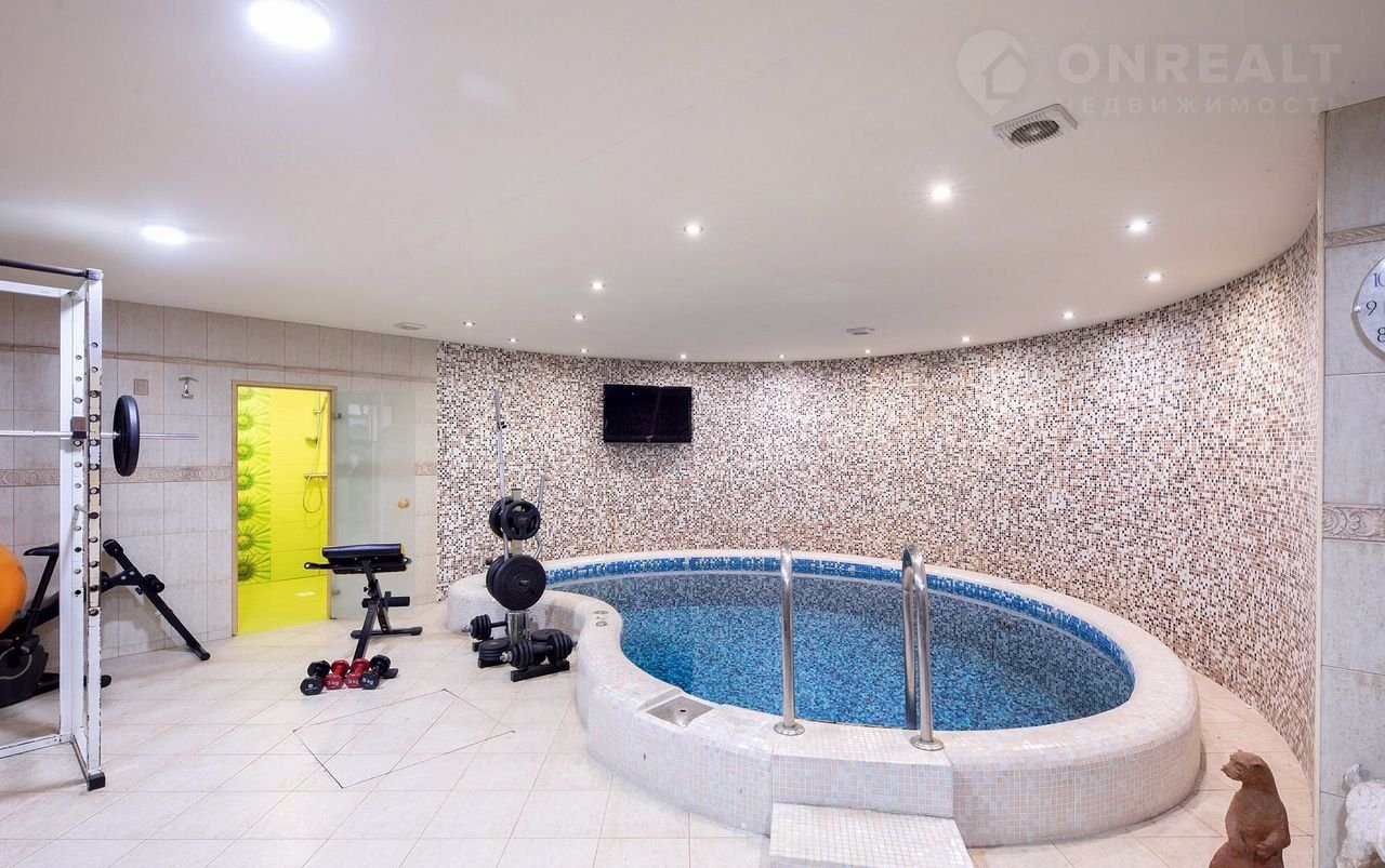 Один открытый располагается на улице, второй в доме в цоколе, там же расположена сауна и тренажерный зал .