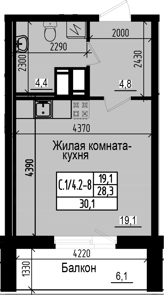 Общая площадь 28.3 м2