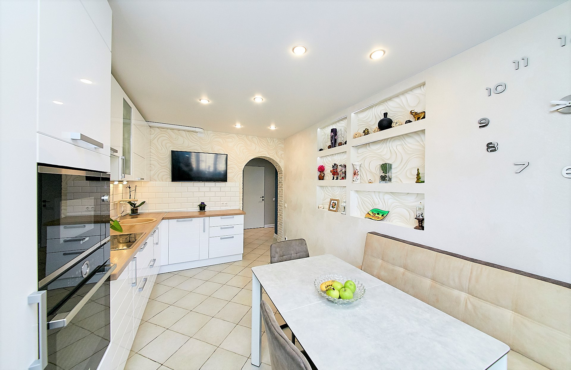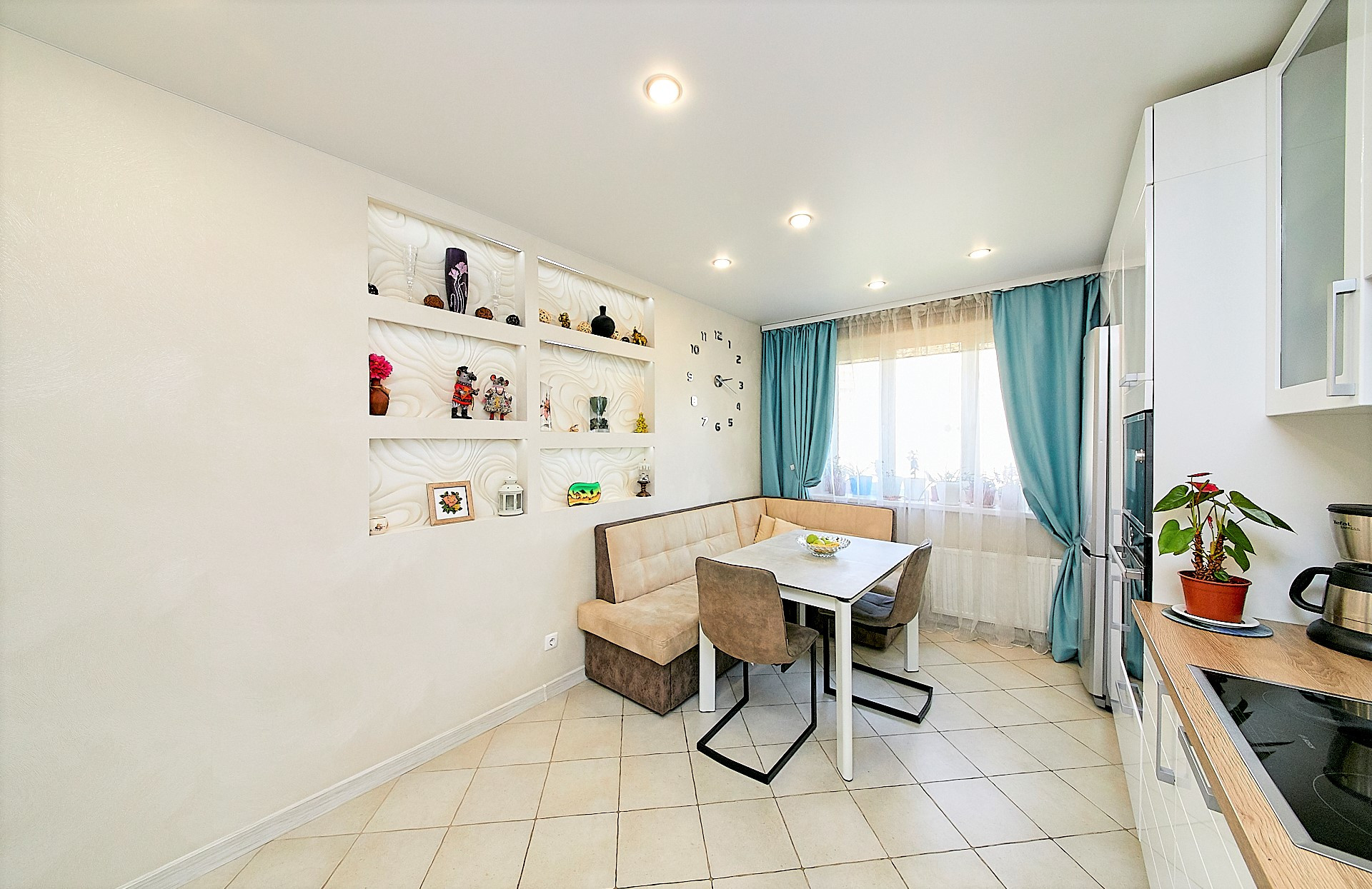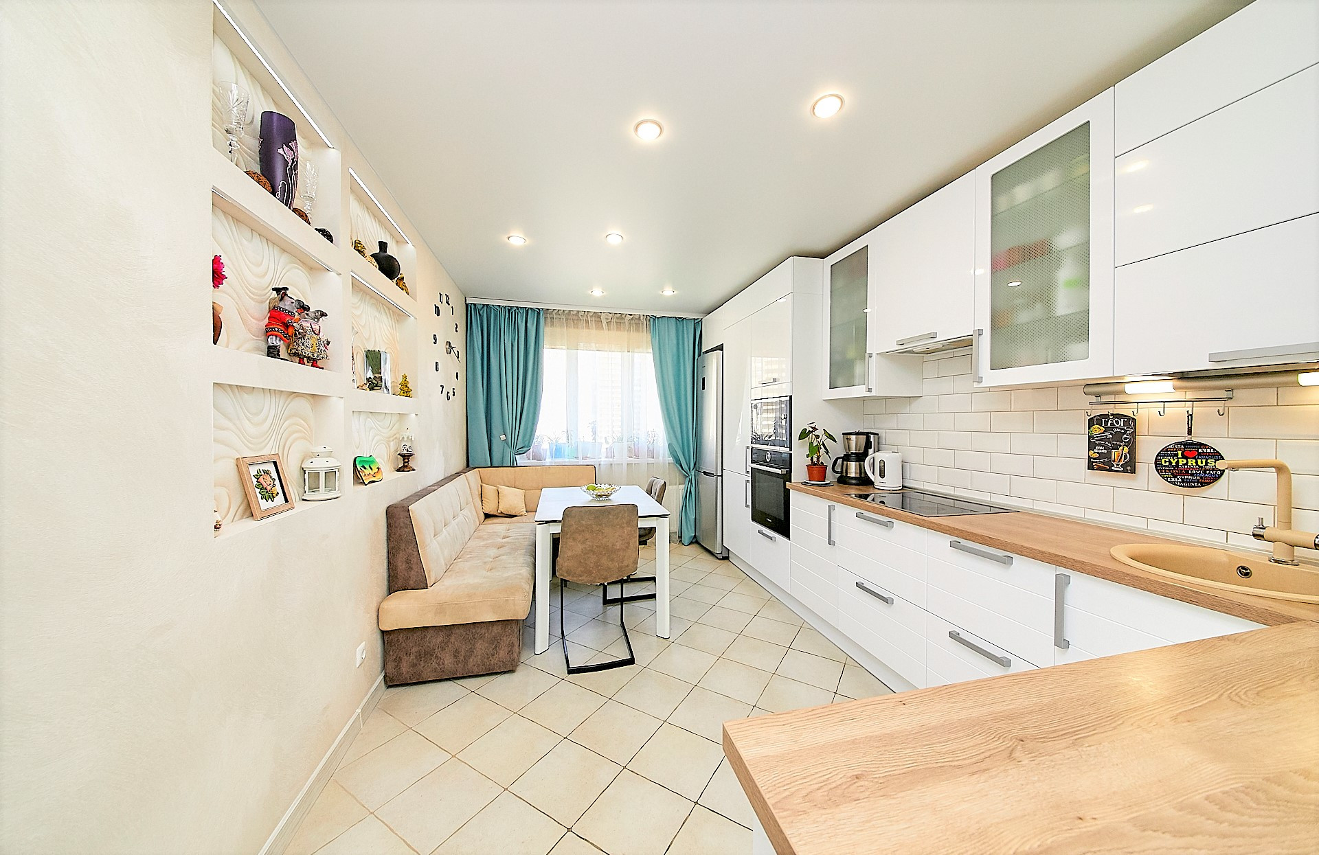 - Очень просторная кухня правильной формы 14,1 кв.м. с дорогим кухонным гарнитуром и встроенной техникой