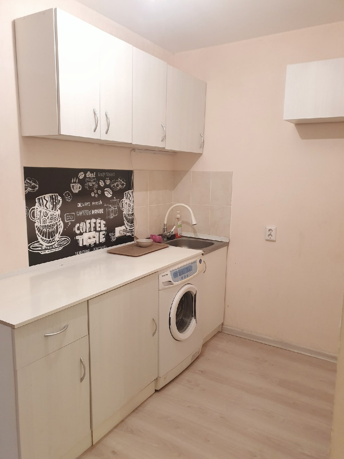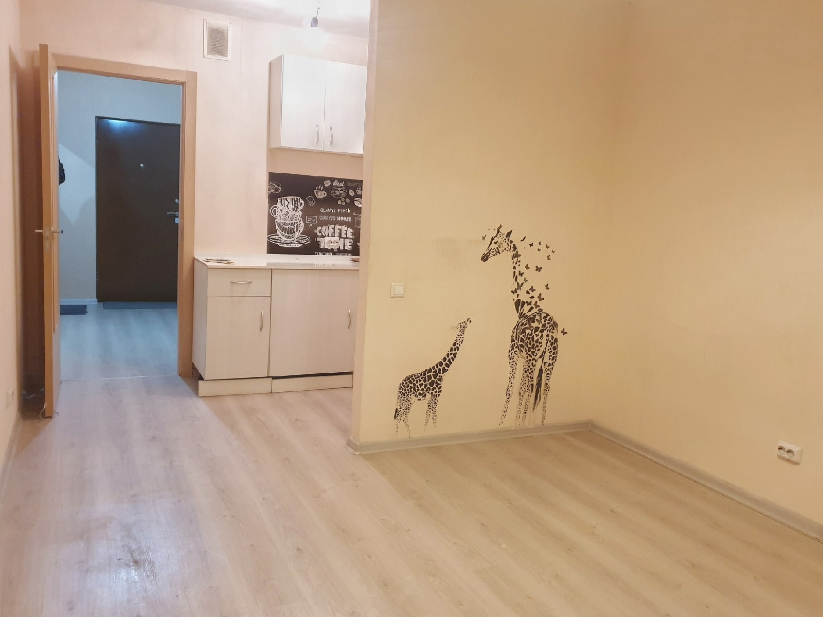 Просторная студия. Ниша в прихожей. Кухня отделена перегородкой. Совмещенный санузел. Высота потолков 2,7 м. Окна студии выходят во двор. Рядом есть детский сад и строится большая современная школа.