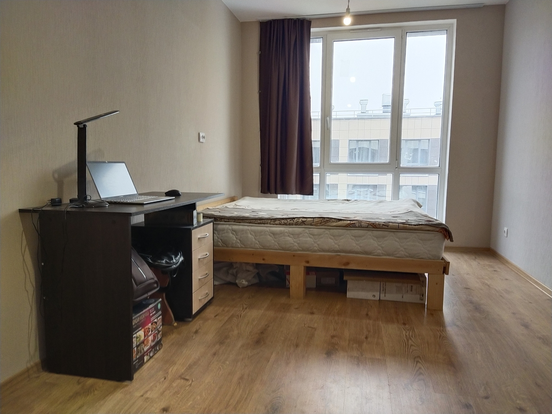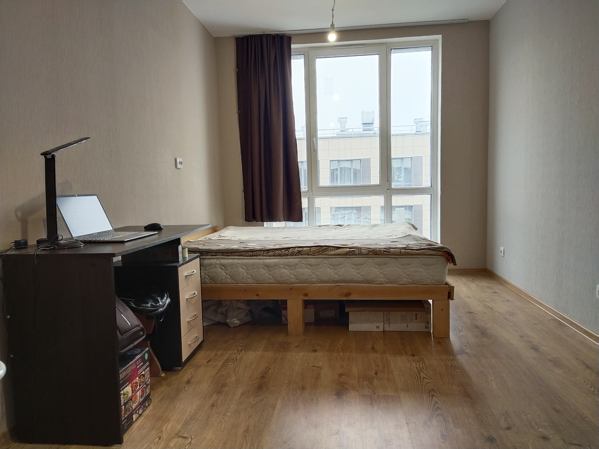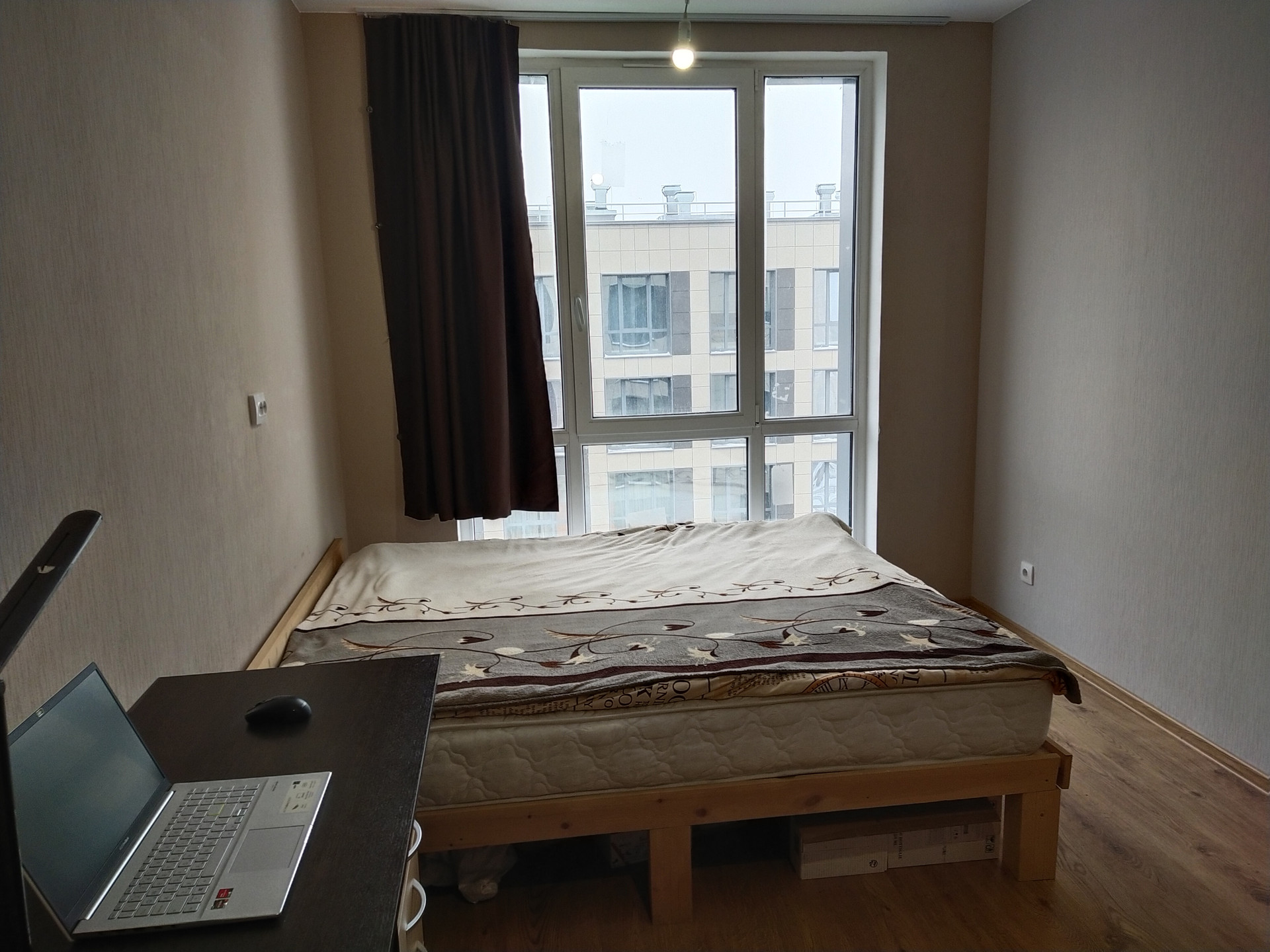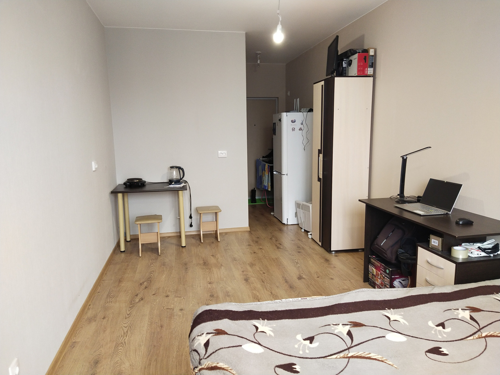При продаже в подарок остаются: большая двухспальная кровать, 2 х 2 м, письменный стол, шкаф, холодильник, стиральная машина, кухонный стол.