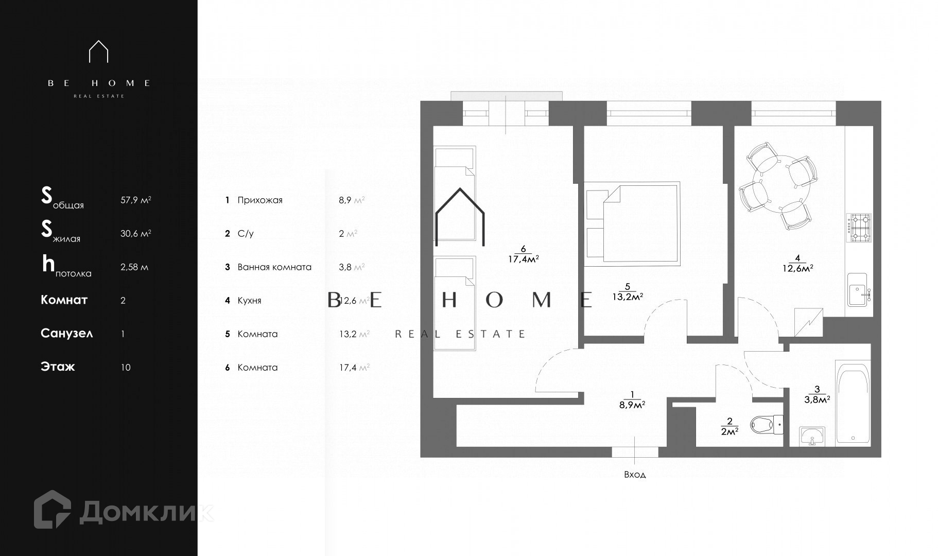Общая площадь 57.9 м2