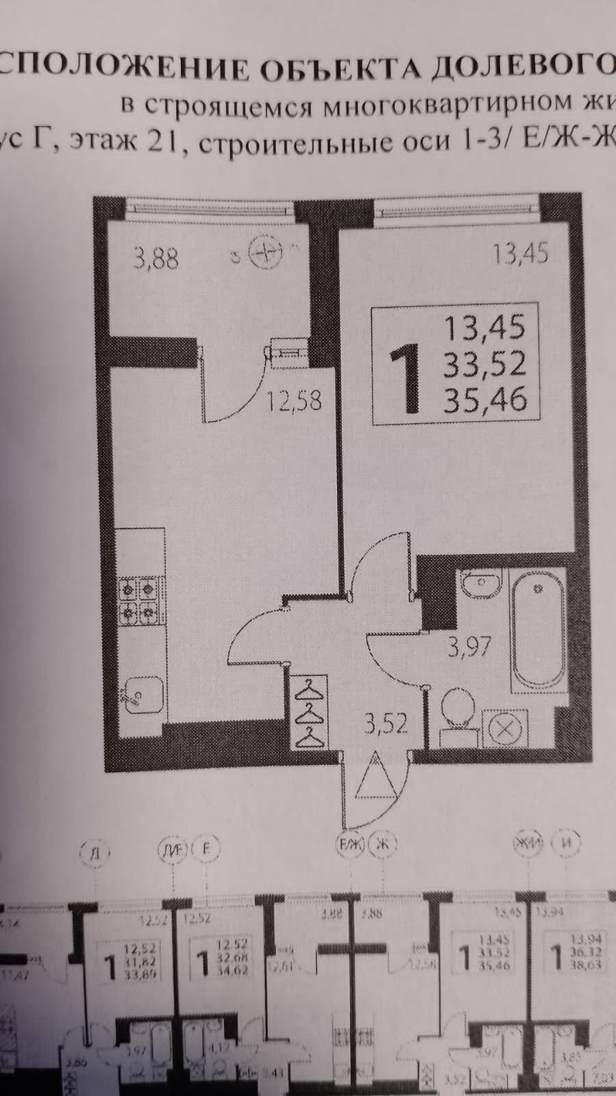 Кухня-гостиная - 12,58 кв.м. с выходом на лоджию - 3,88 кв.м.; комната - 13,45; с/у - 3,97; прихожая - 3,52.