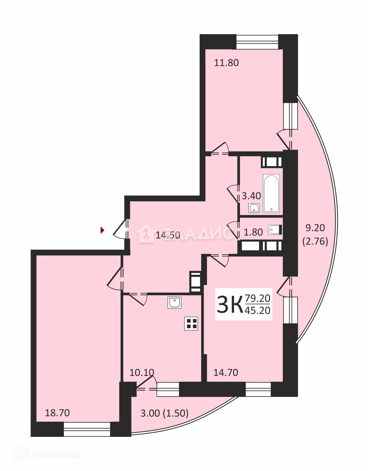 Жилая площадь 45.2 м2