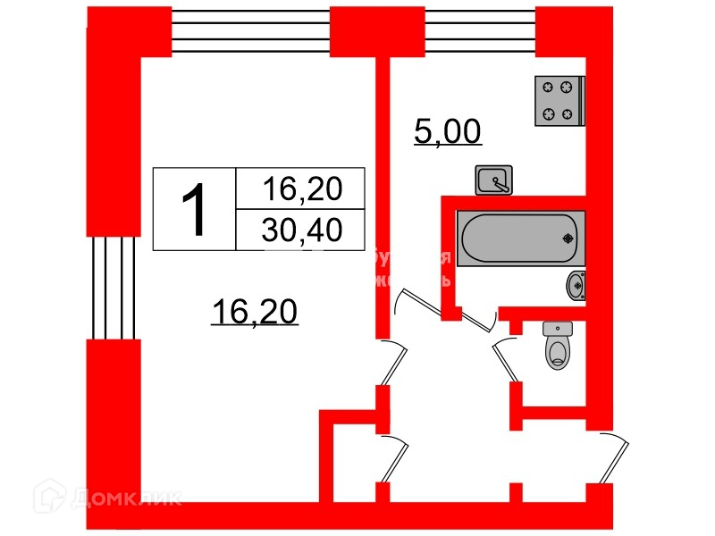 Общая площадь 30.4 м2