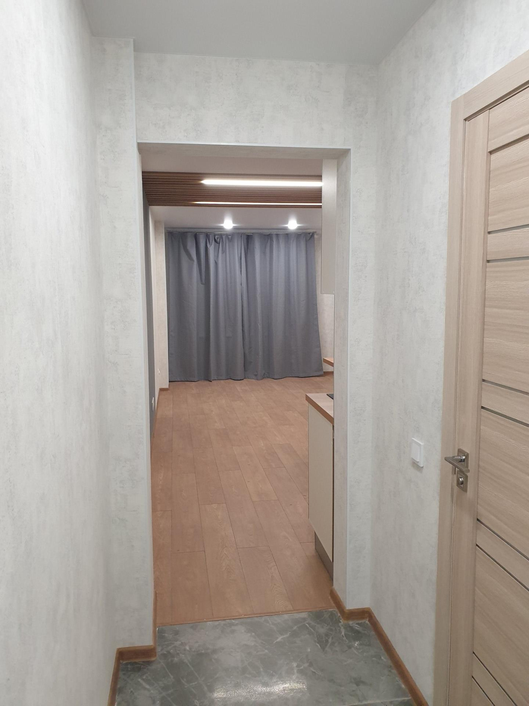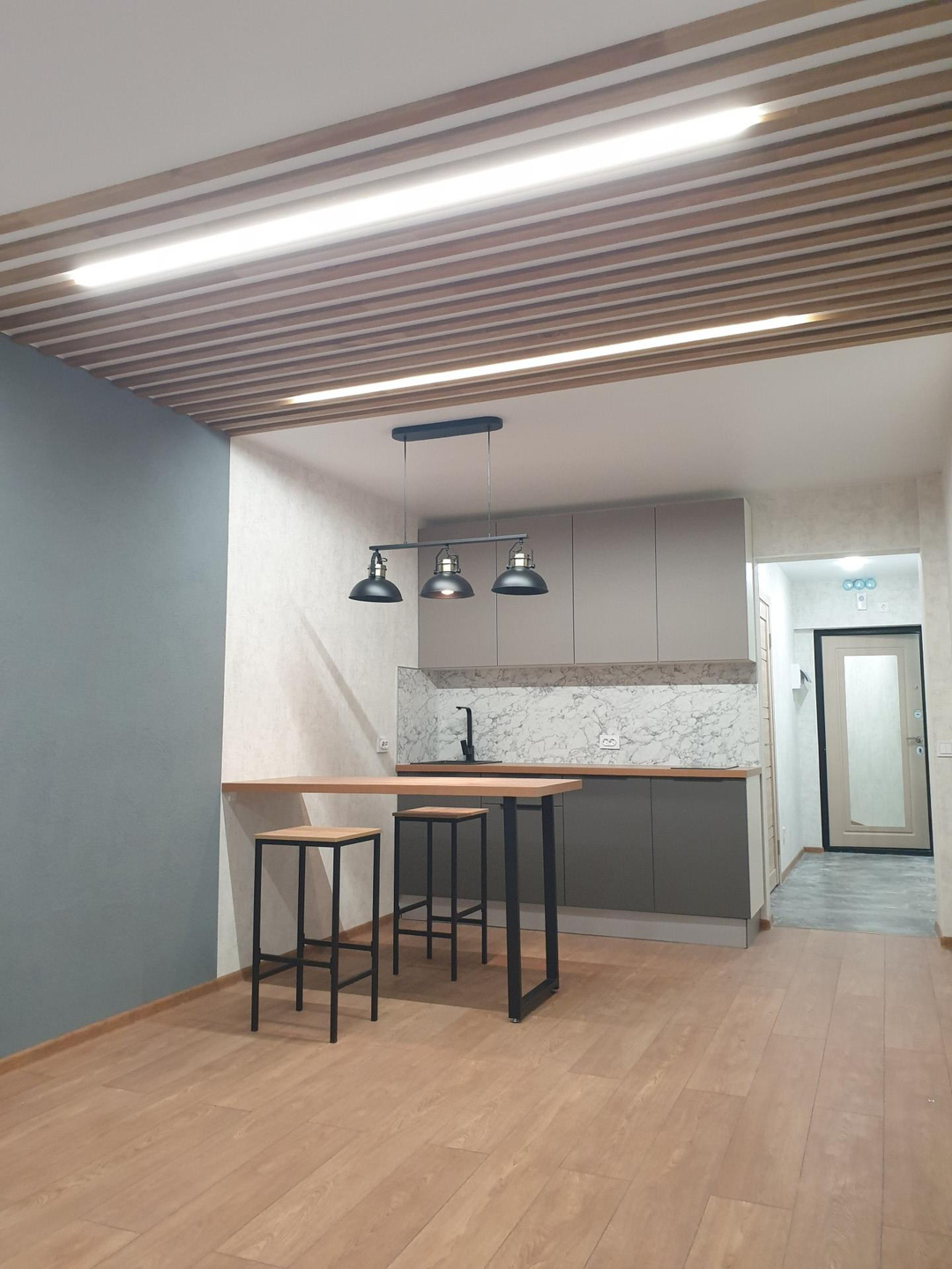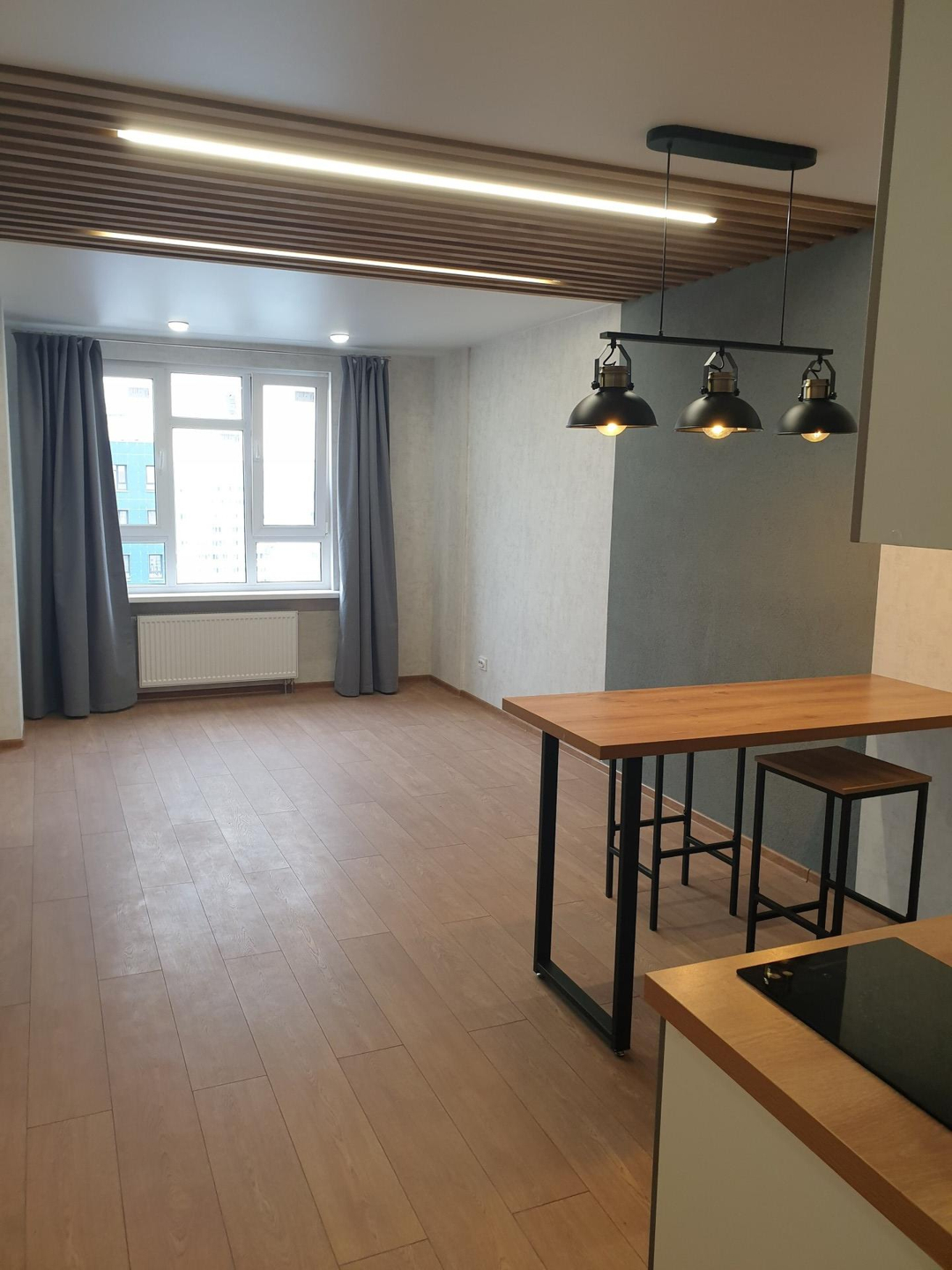 Студия от собсвенника, ипотека, без маткапитала, никто не прописан. В квартире выполнен качественный дизайнерский ремонт: декоративная штукатурка, натяжные потолки, потолочная рейка, барная стойка. Во всех зонах три режима освещения, в комнате управляется как с пульта, так и с выключателя. Кухня изготовлена на заказ, раковина - искусственный камень, варочная панель Krona.  Санузел совмещенный, душевая кабина, инсталляция, зеркало с подсветкой,  накладная раковина, стиральная машина Hi
