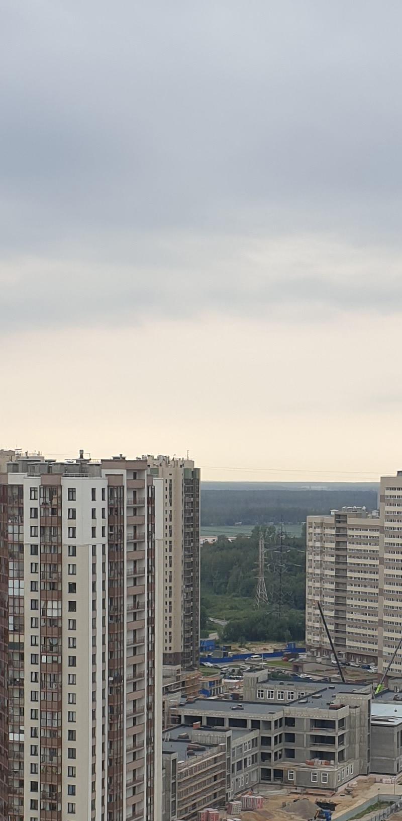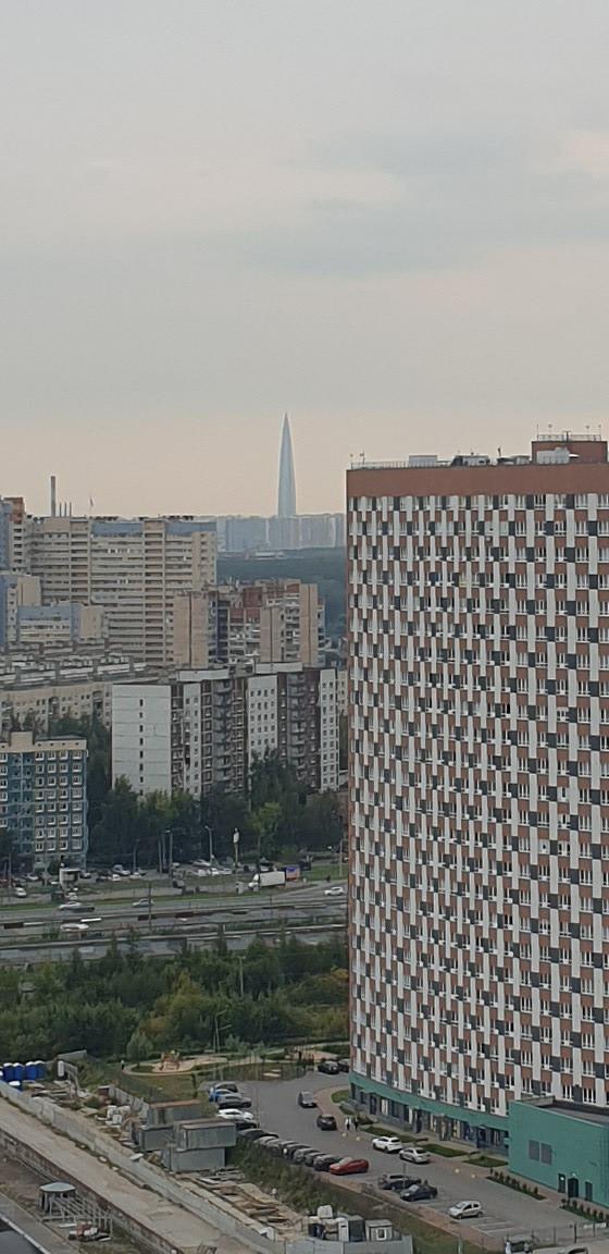 Западная сторона, видно озеро и башню Газпрома. Метро в пешей доступности, во дворе детский сад и площадка, развитая инфраструктура.