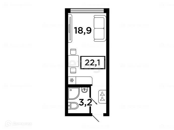 Общая площадь студии 22,1 м2