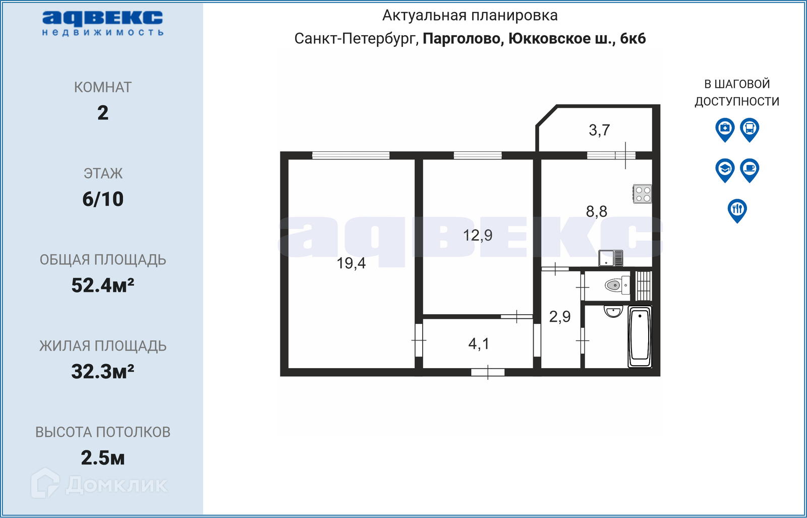Общая площадь 52.4 м2