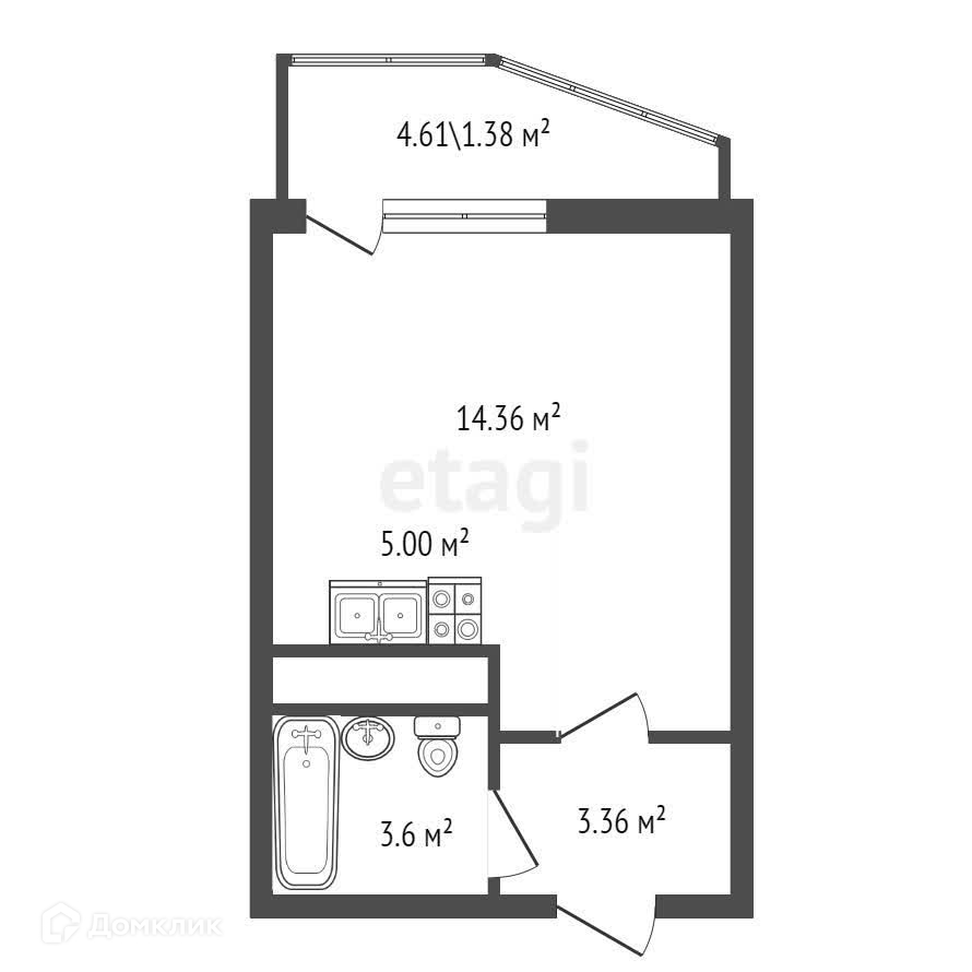 Планировка позволяет сделать зонирование помещения, превращающую студию в однокомнатную квартиру.