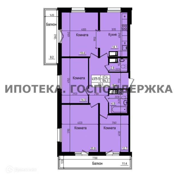 Жилая площадь 67.4 м2