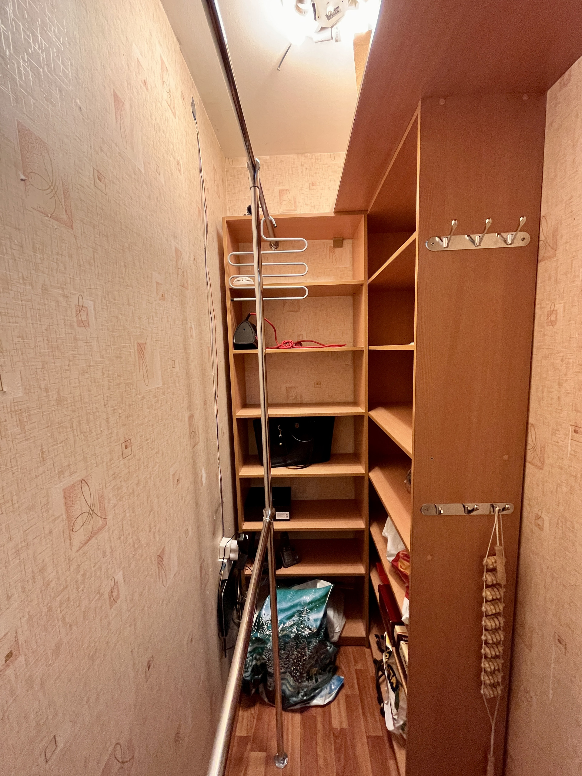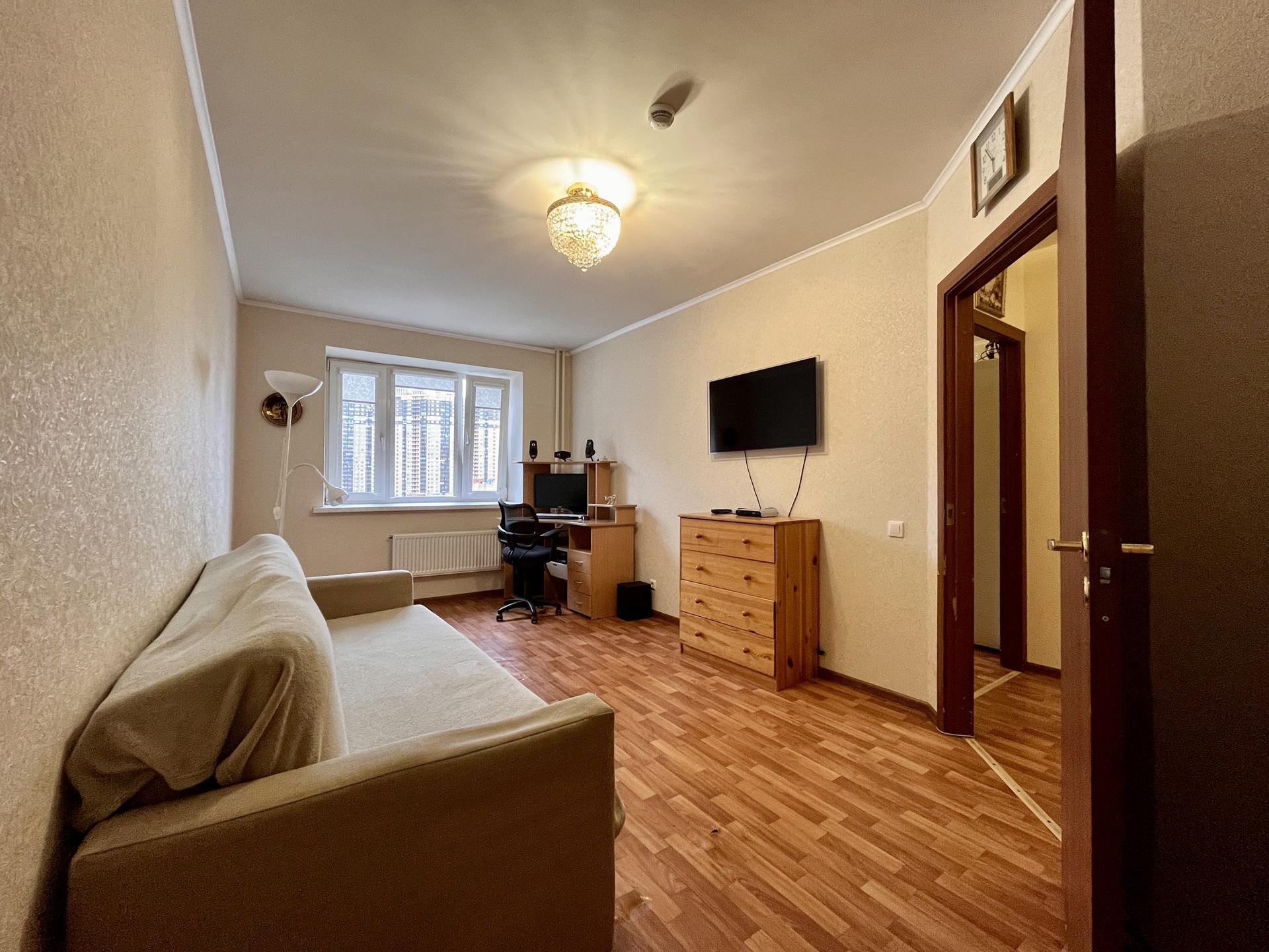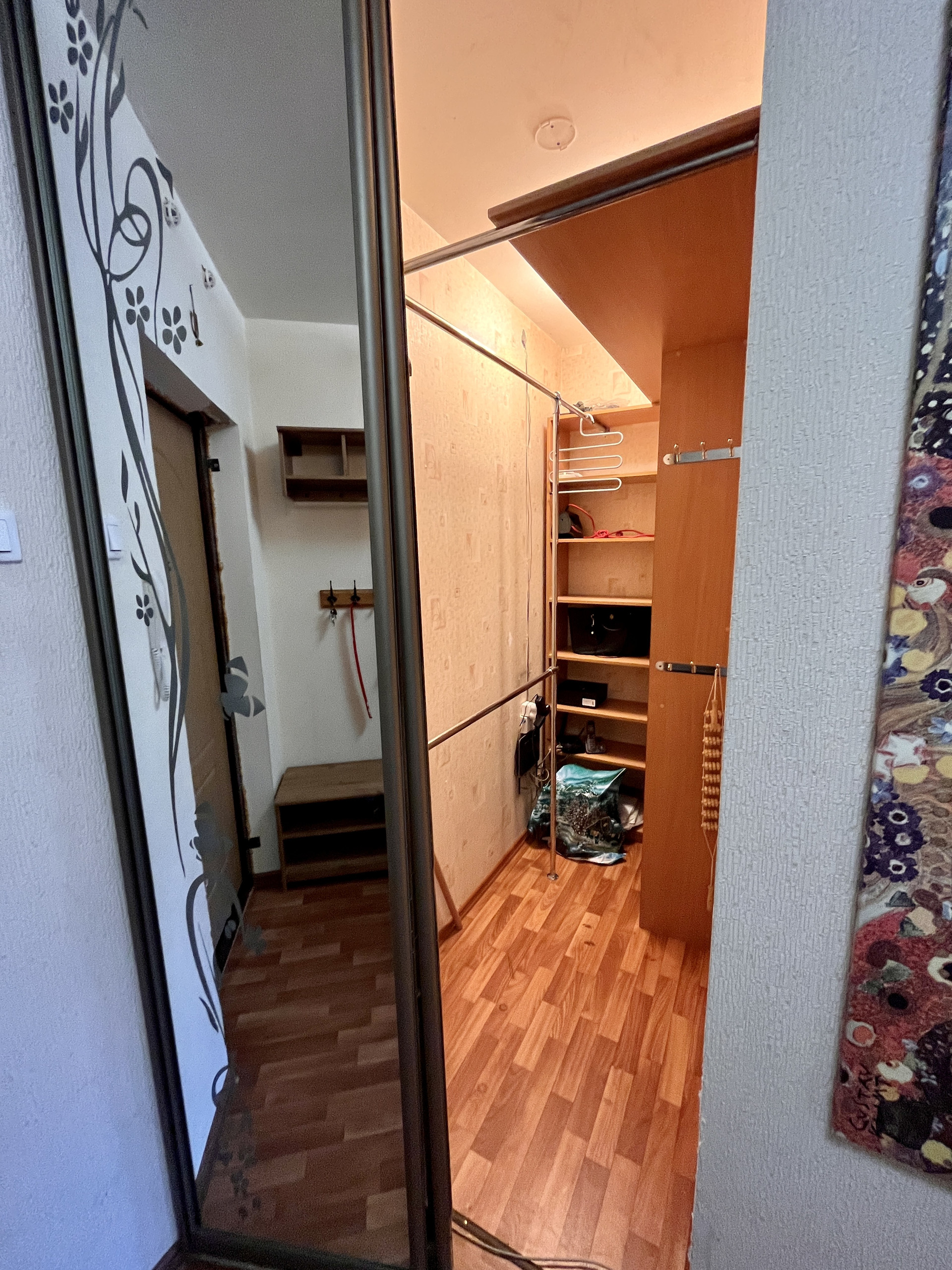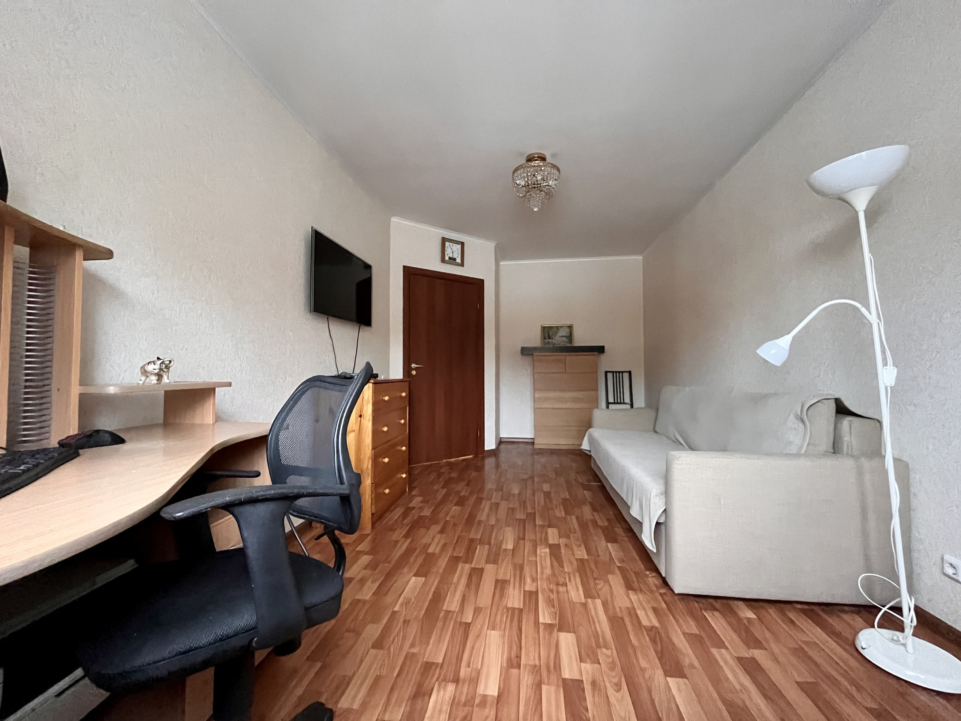 Квартира с отличной планировкой. При входе в квартиру отгорожен тамбур и установлена дополнительная дверь. Все согласовано с пожарной службой. У входа в квартиру есть место для хранения. В квартире, в коридоре, организована гардеробная комната с рейлингами для одежды и полками для хранения. Жилая комната площадью 15,3 м2 оборудована мебелью и техникой, имеет нишу под встроенный шкаф или спальное место. Окна комнаты выходят в тихий внутренний двор. Расстояние до соседних домов большое.