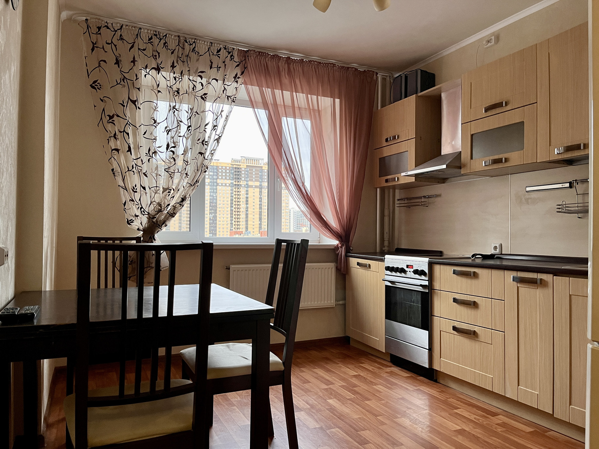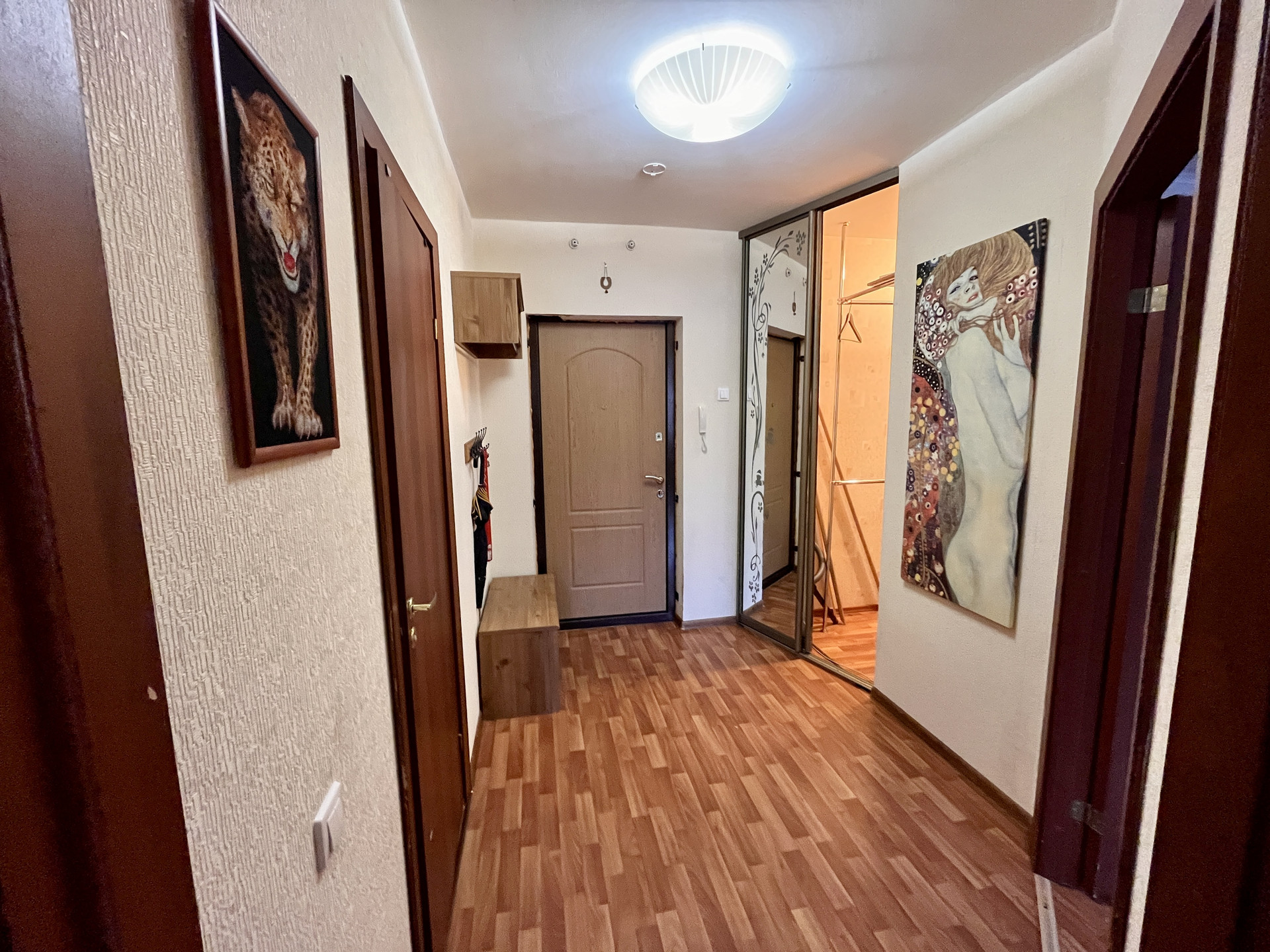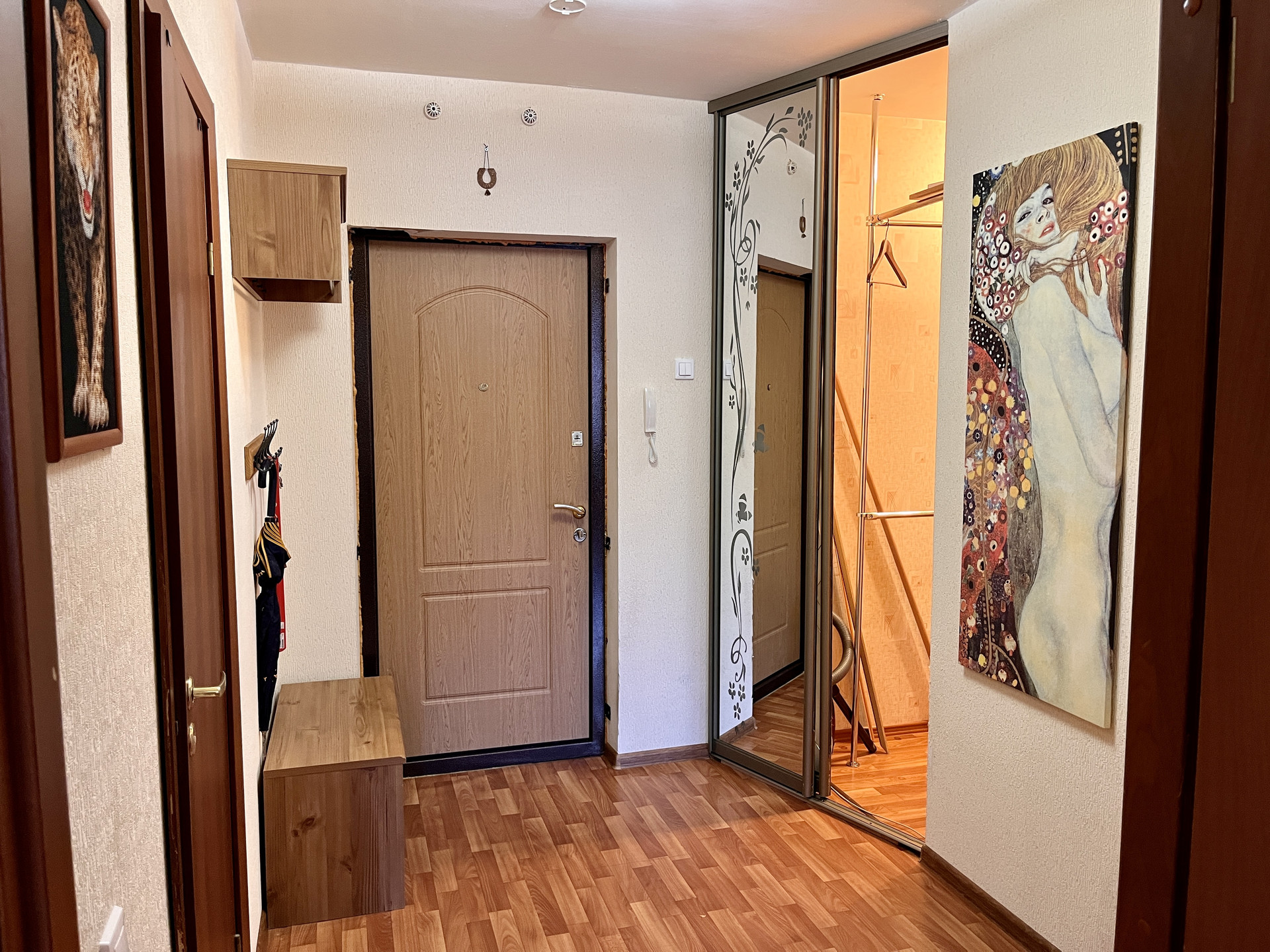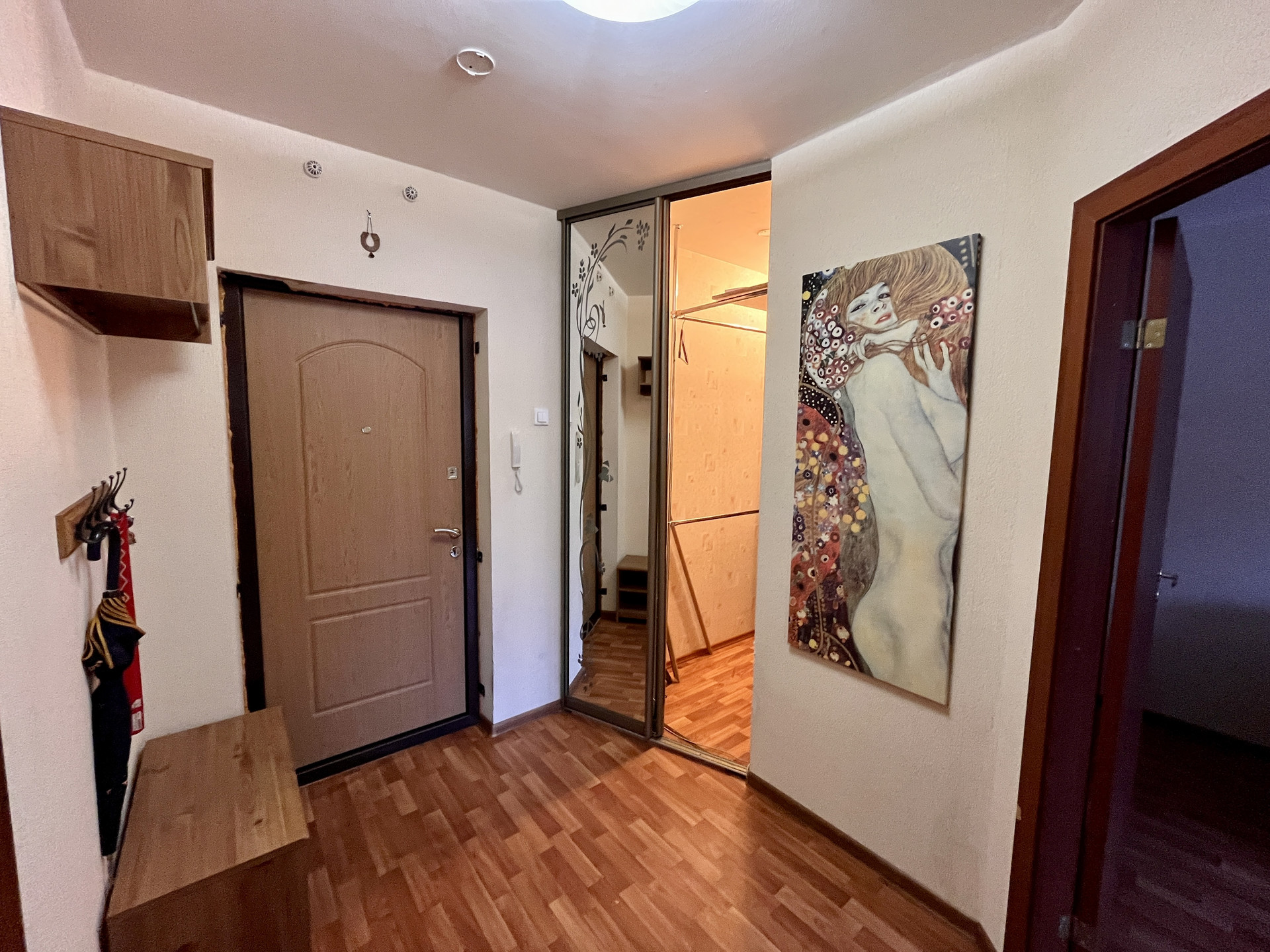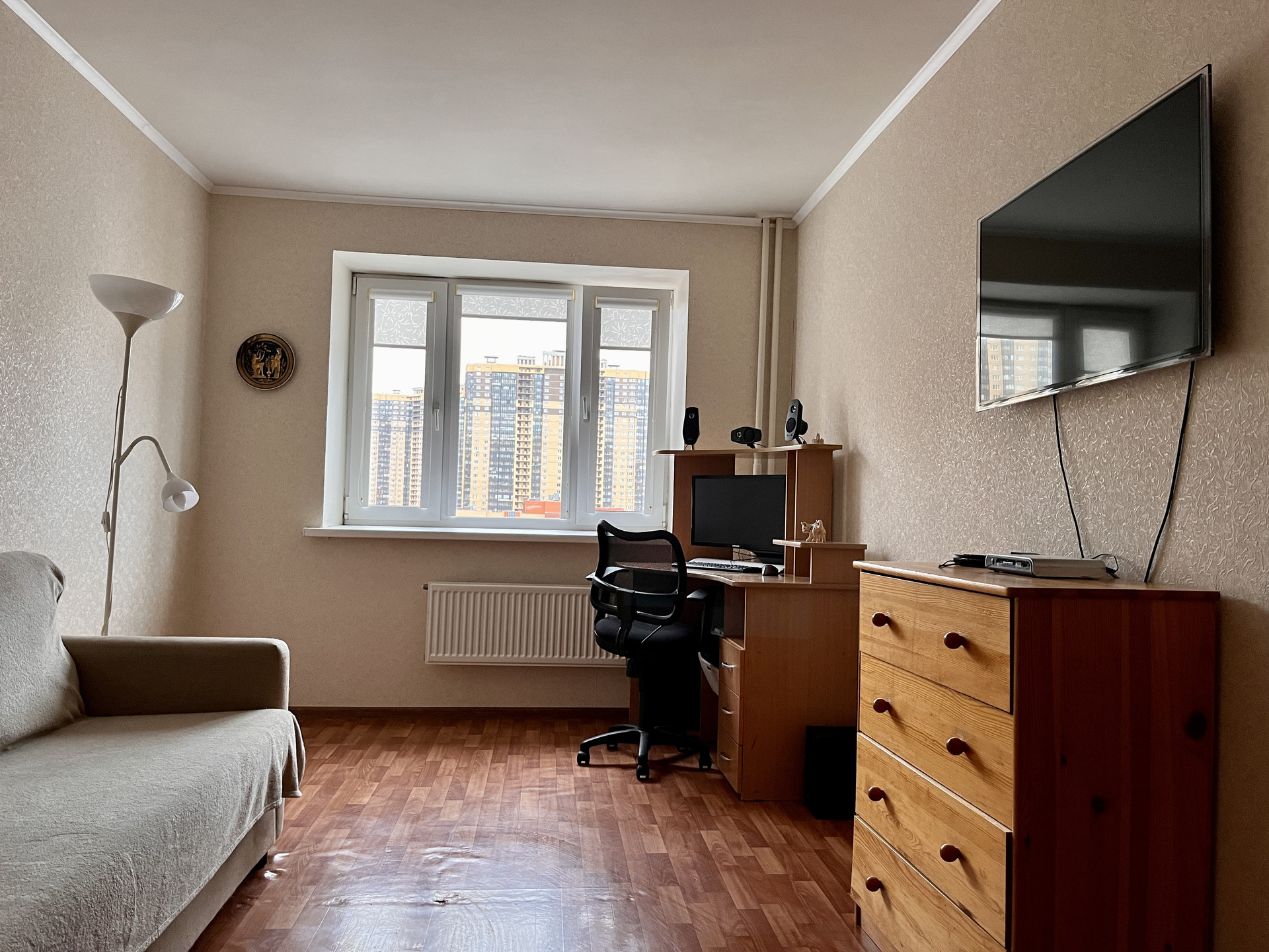 Квартира с отличной планировкой. При входе в квартиру отгорожен тамбур и установлена дополнительная дверь. Все согласовано с пожарной службой. У входа в квартиру есть место для хранения. В квартире, в коридоре, организована гардеробная комната с рейлингами для одежды и полками для хранения. Жилая комната площадью 15,3 м2 оборудована мебелью и техникой, имеет нишу под встроенный шкаф или спальное место. Окна комнаты выходят в тихий внутренний двор. Расстояние до соседних домов большое.