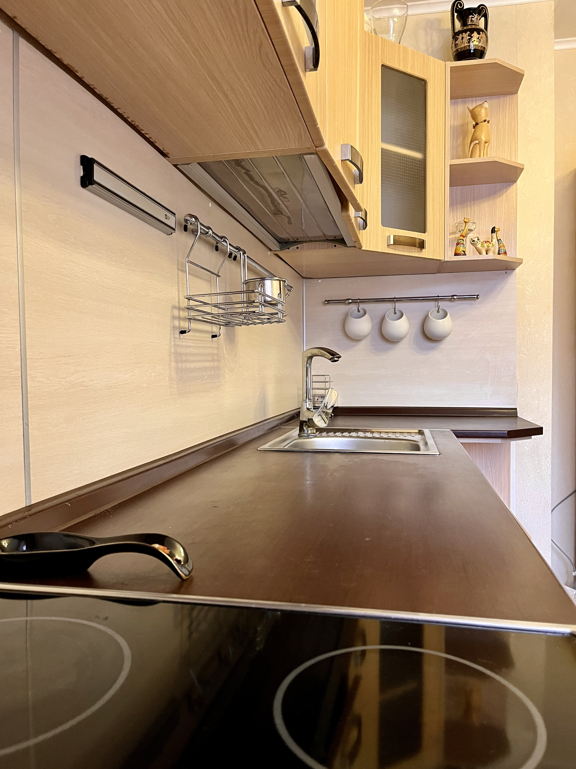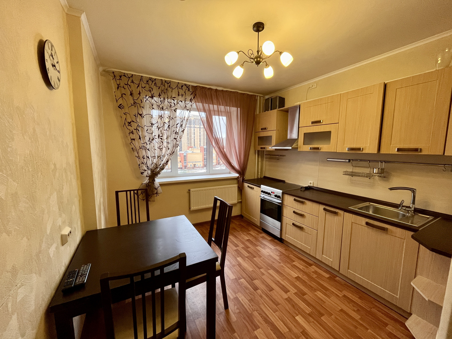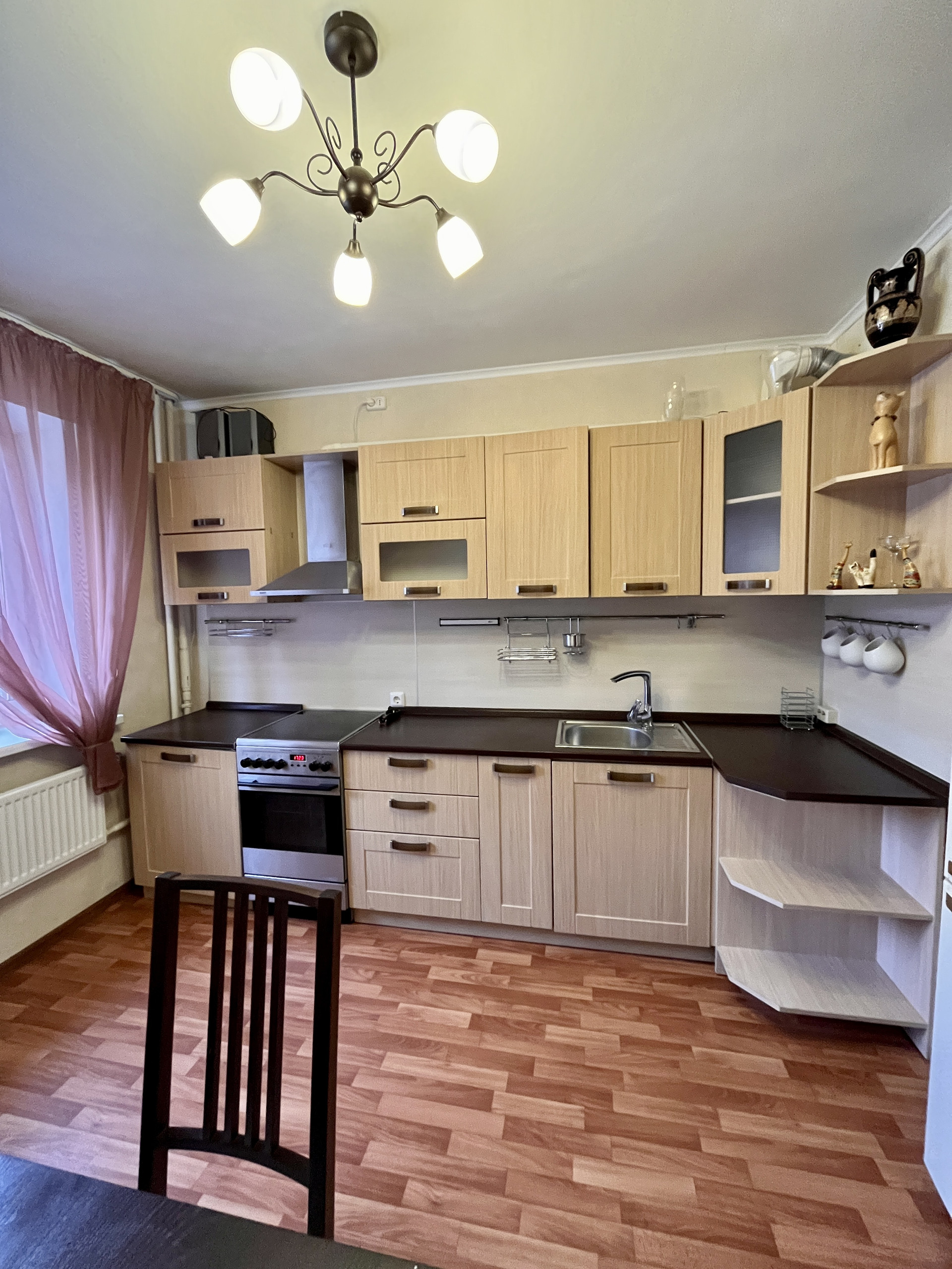 Кухня квадратной формы, площадью 10,9 м2 оборудована всей необходимой кухонной мебелью и техникой. Все в отличном состоянии. Вся мебель и техника по желанию остается покупателю.