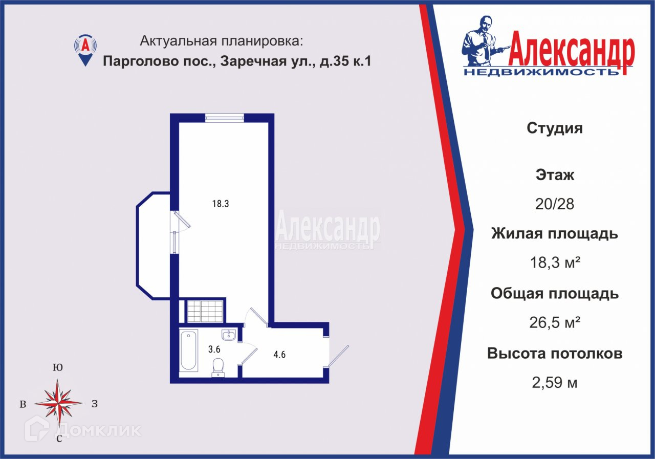 Квартира студия, 26.5 м2, этаж 20 / 28, на продажу в посёлке Парголово, Заречная улица, 35к1литА