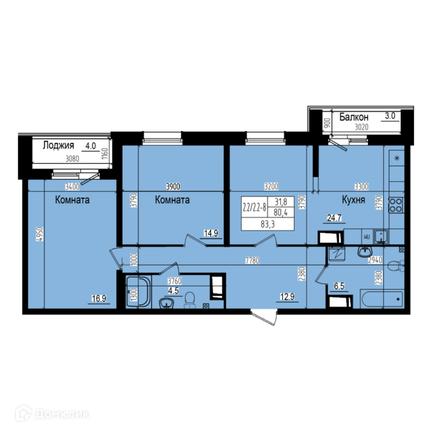 Общая площадь 83.3 м2