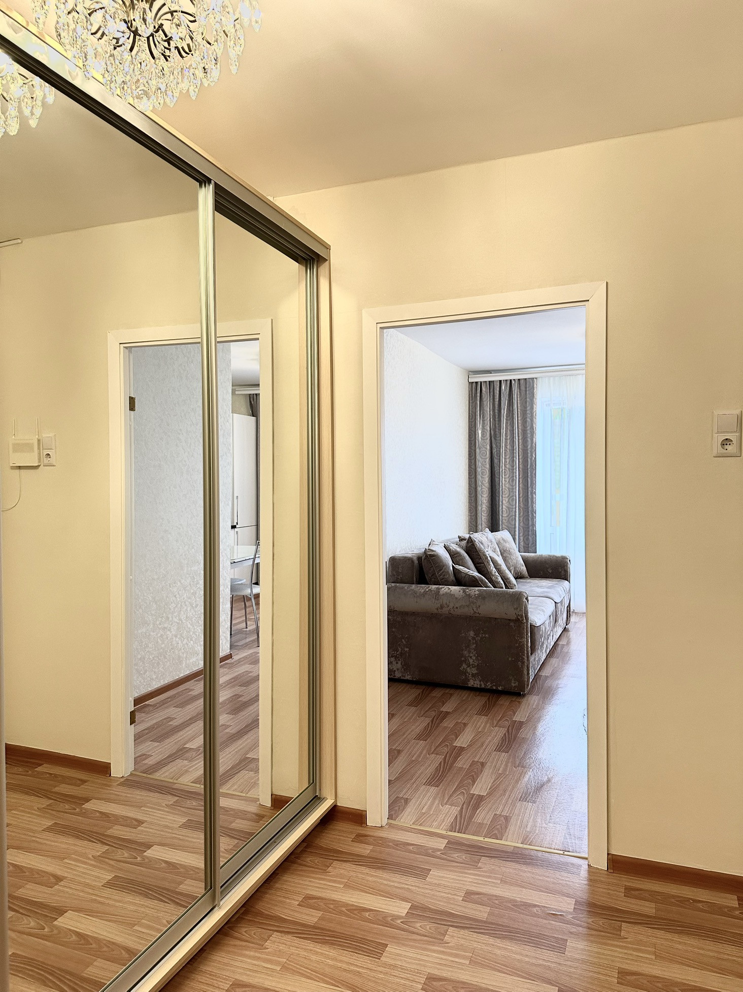 - мебель (диван с раздвижным спальным местом, кухонный гарнитур, просторный шкаф-купе длиною в 2.5 метра, стол и стулья)