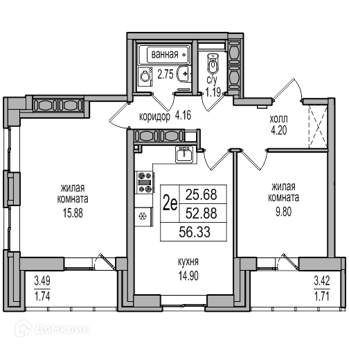 Общая площадь 56 м2