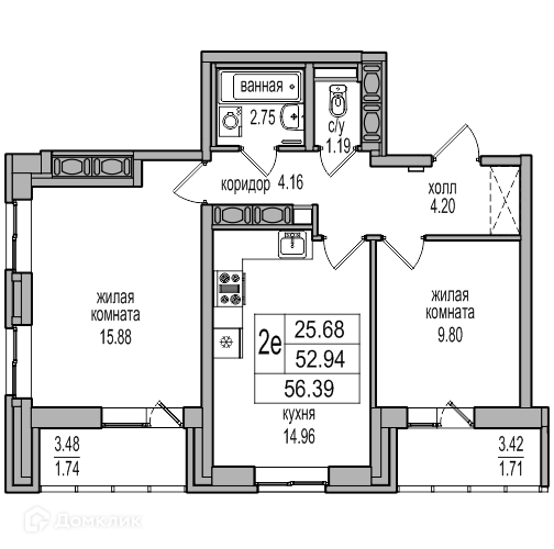 Жилая площадь 25.68 м2