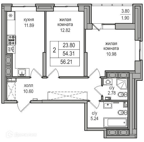 Общая площадь 55.5 м2