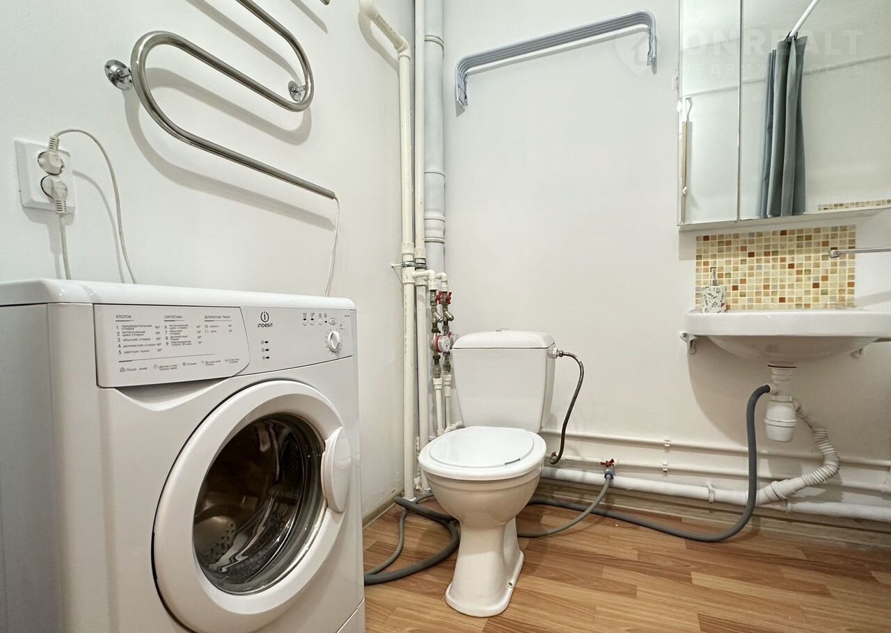 В совмещенный санузел 4,4 квадратных метра вместилась ванна, туалет, стиральная машина, раковина. Все в рабочем состоянии. Установлен вытяжной вентилятор.