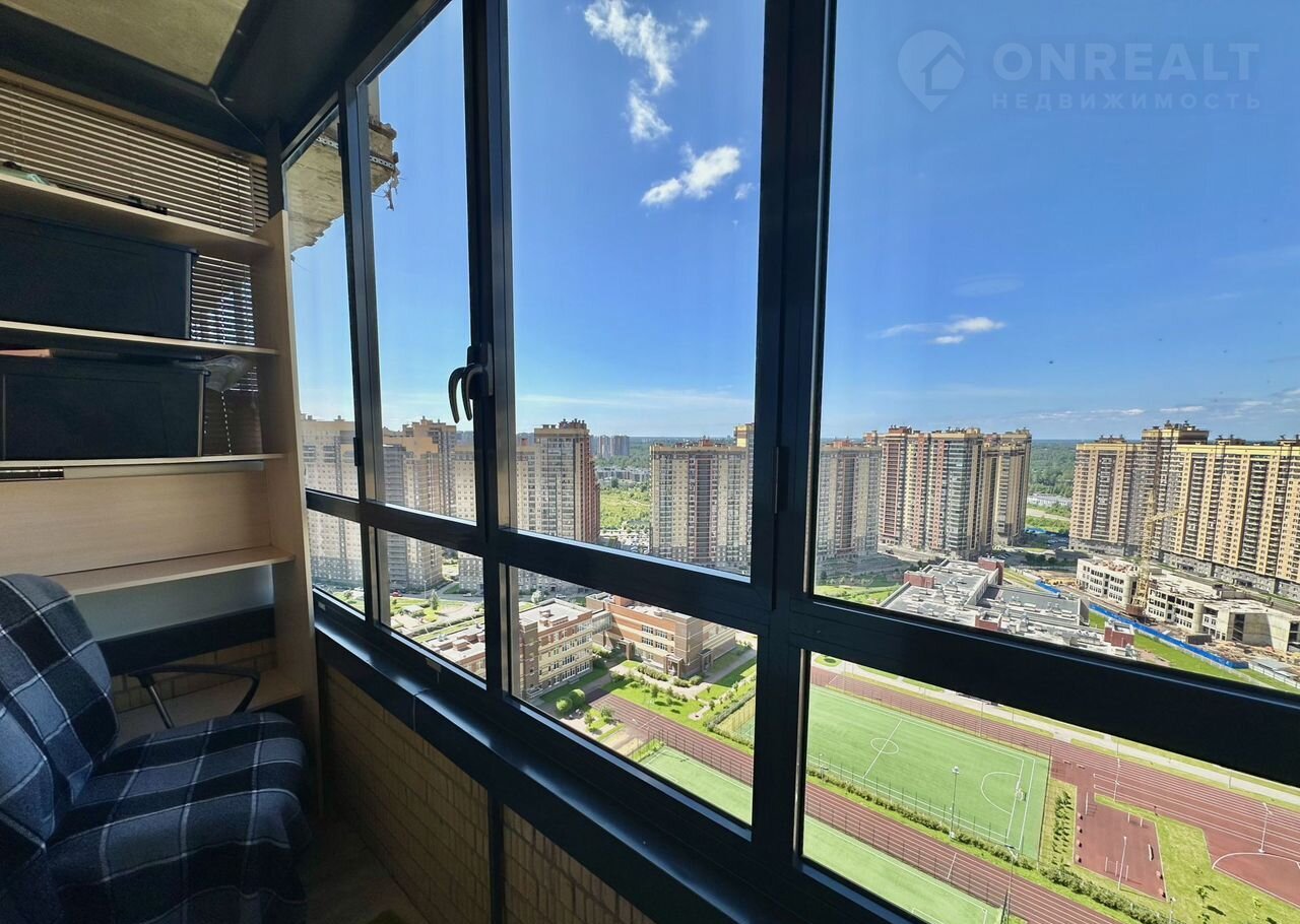 Выход на балкон площадью 2,8 квадратных метра из комнаты. С него открывается прекрасный вид на закатное солнце и вечнозеленый Шуваловский парк. На балконе можно организовать дополнительное хранение или при желании рабочее время. Для этого балкон нужно будет утеплить.