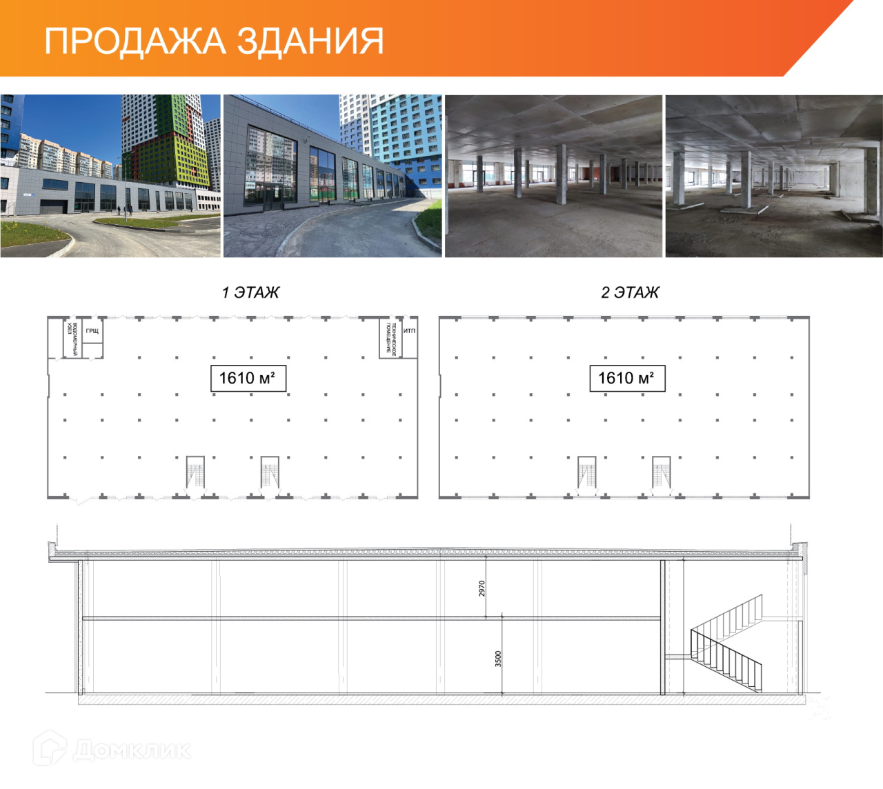 Блок из шести помещений площадью 630 м2 каждое.