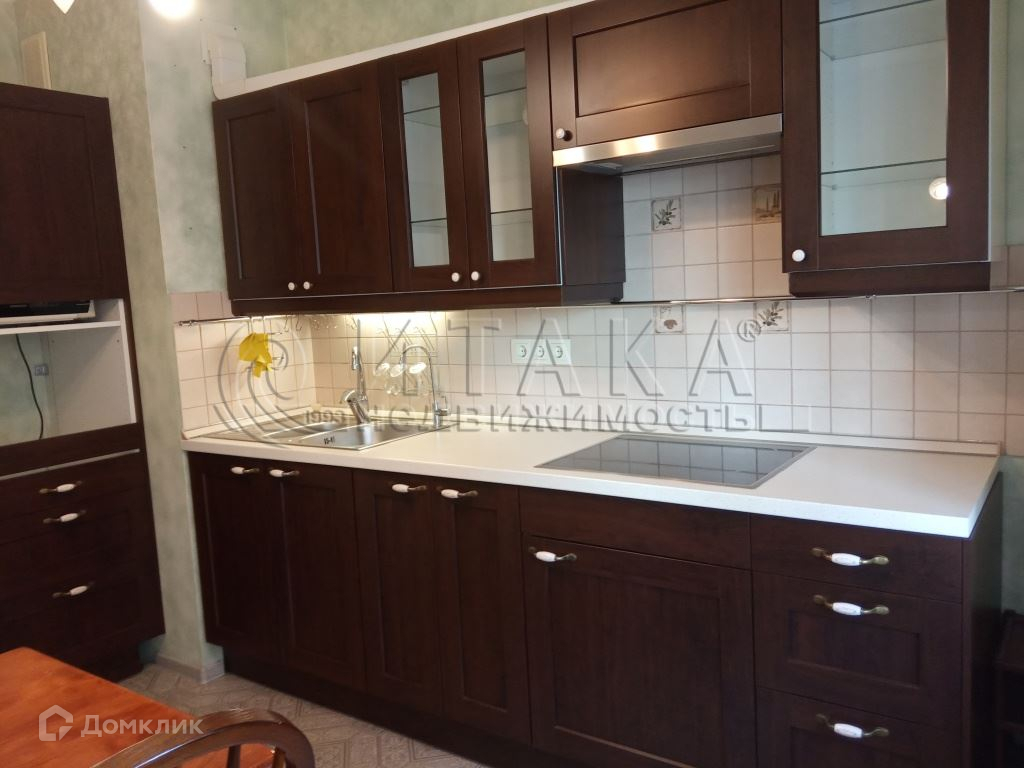 На кухне- кухонный мебельный гарнитур, двухкамерный холодильник, плита со стеклокерамич. варочн. поверх-тью, вытяжка, микроволновка, стол и стулья, ЖК телевизор. В квартире есть гардеробная комната.