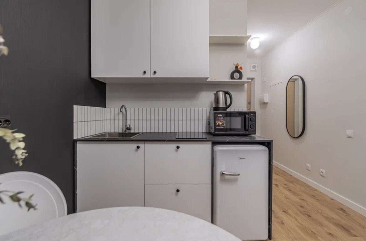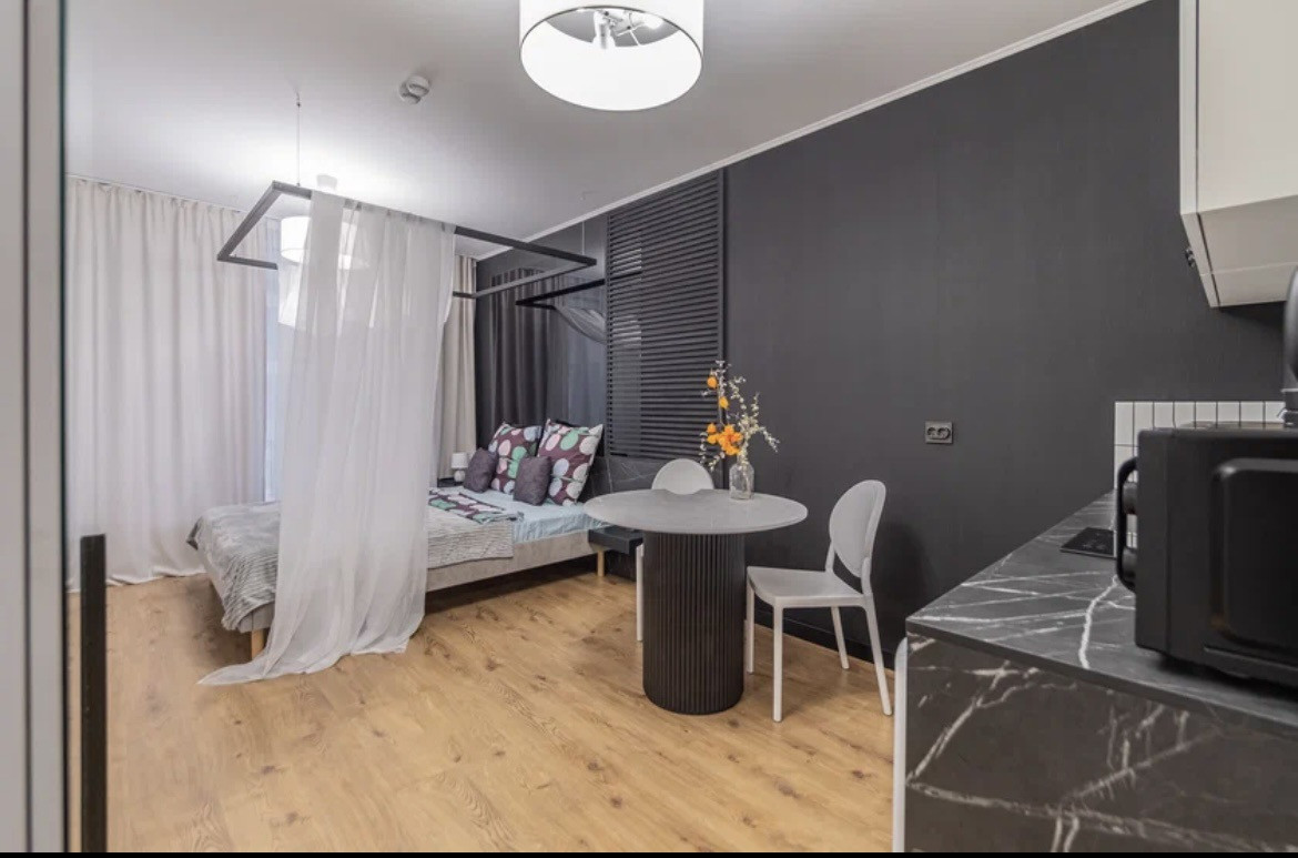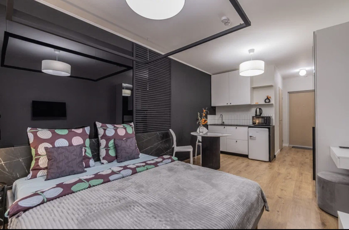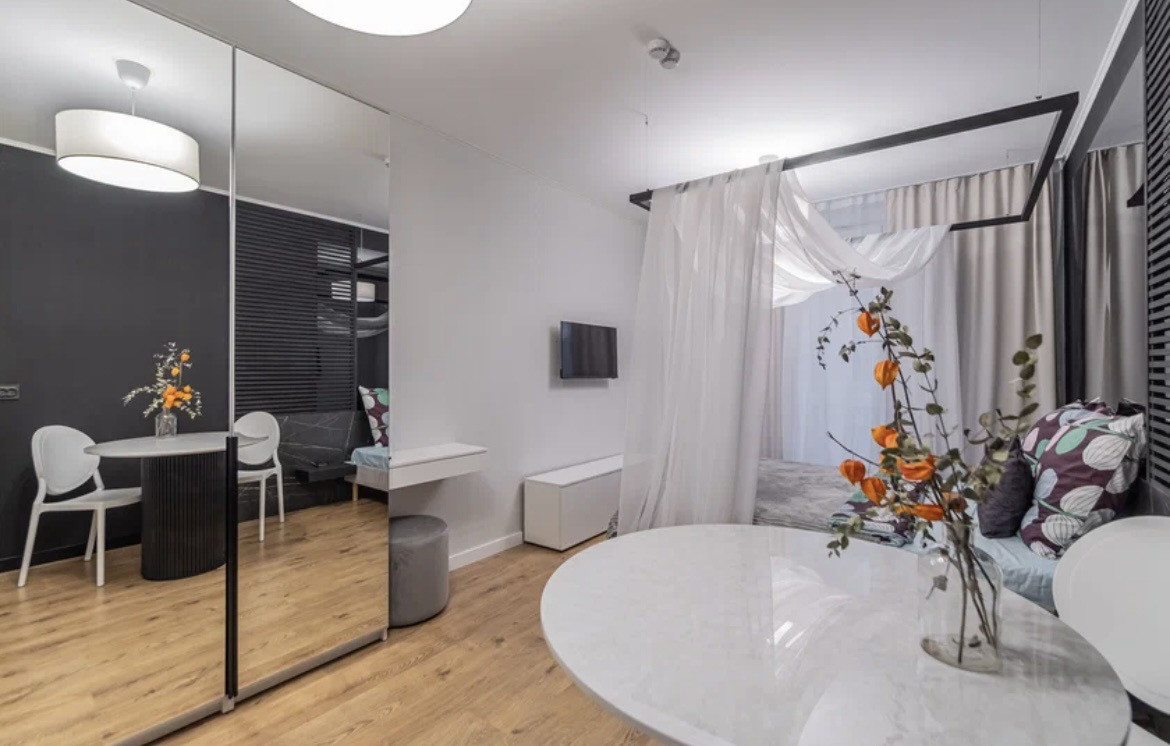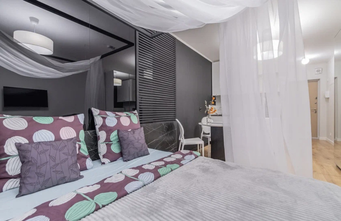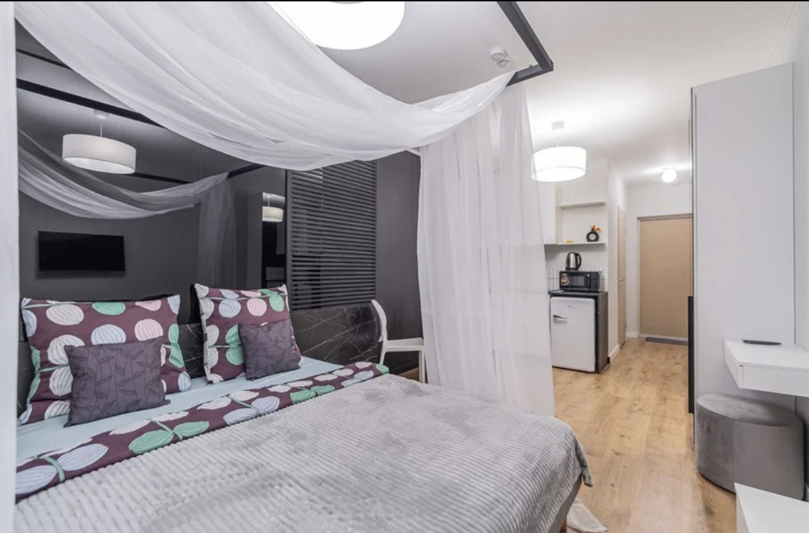 К Вашим услугам просторные дизайнерские апартаменты 25 квадратов со спальней и балдахином совмещенной с кухонной и обеденной зоной в апарт-отеле "Start"