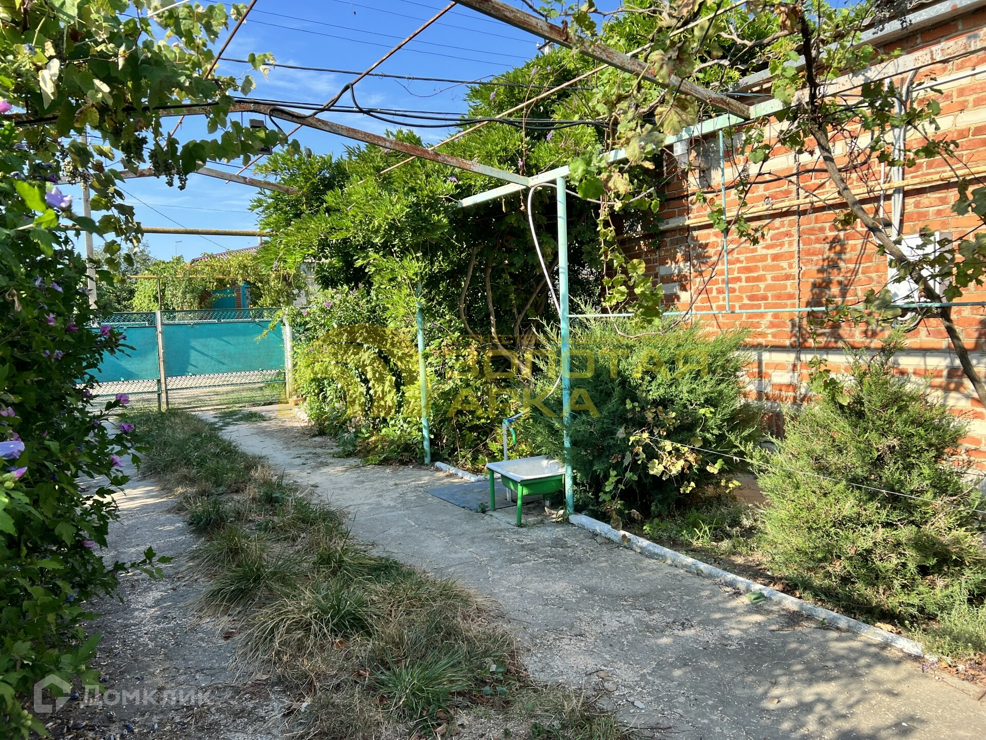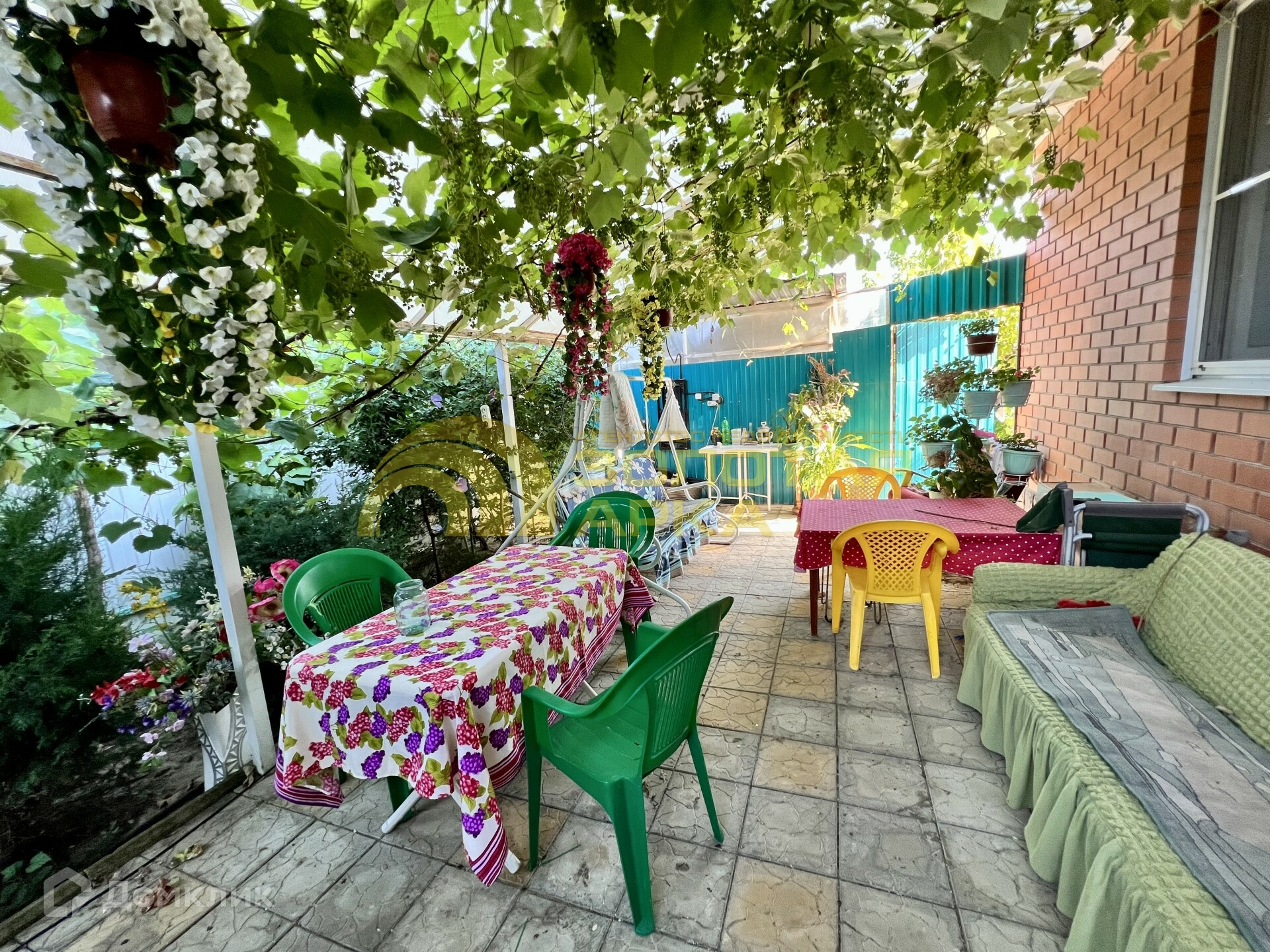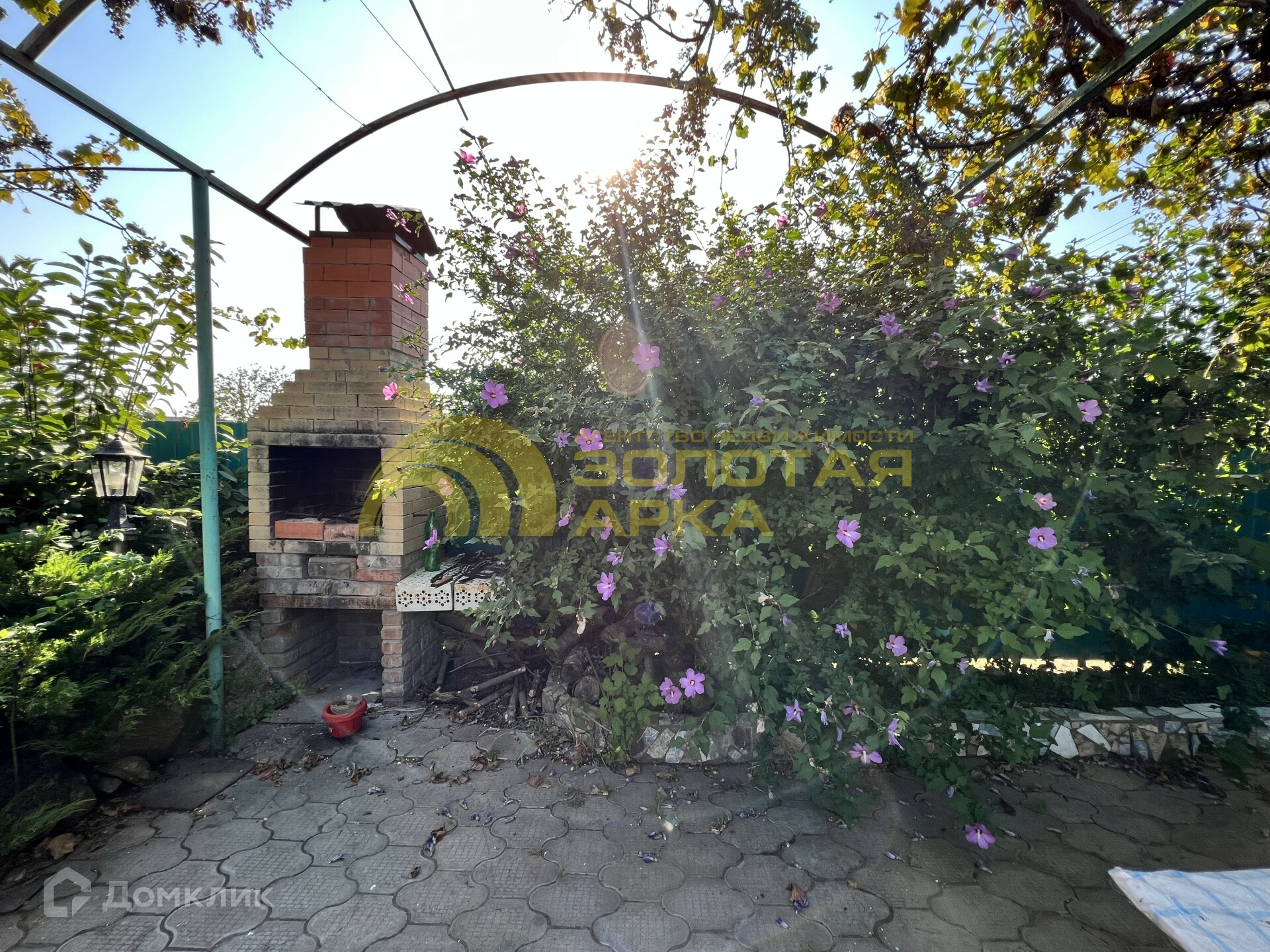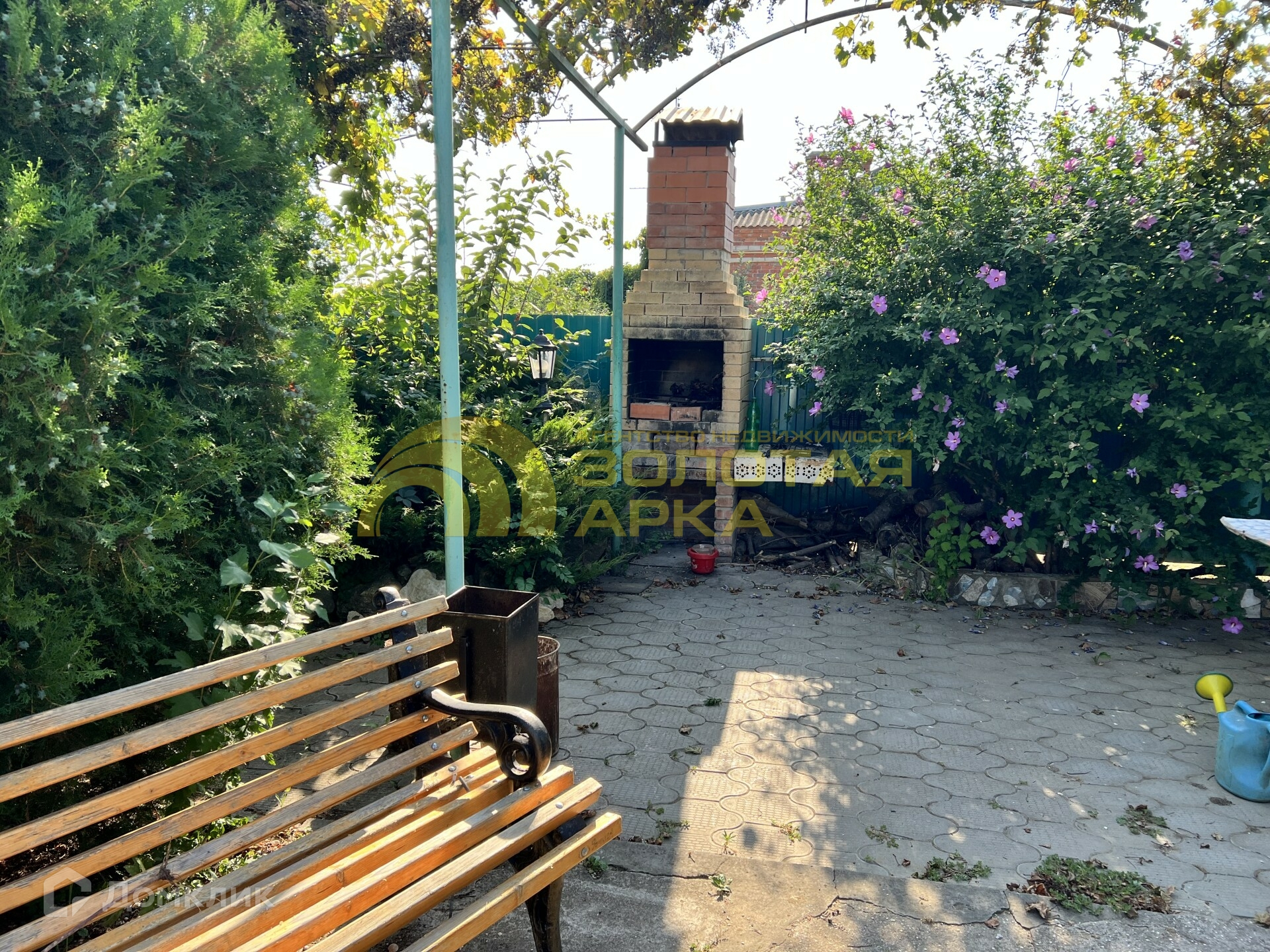 Закрытая территория с зоной для отдыха:мангал, детская площадка, беседка. Везде высажены декоративные кустарники, цветы.