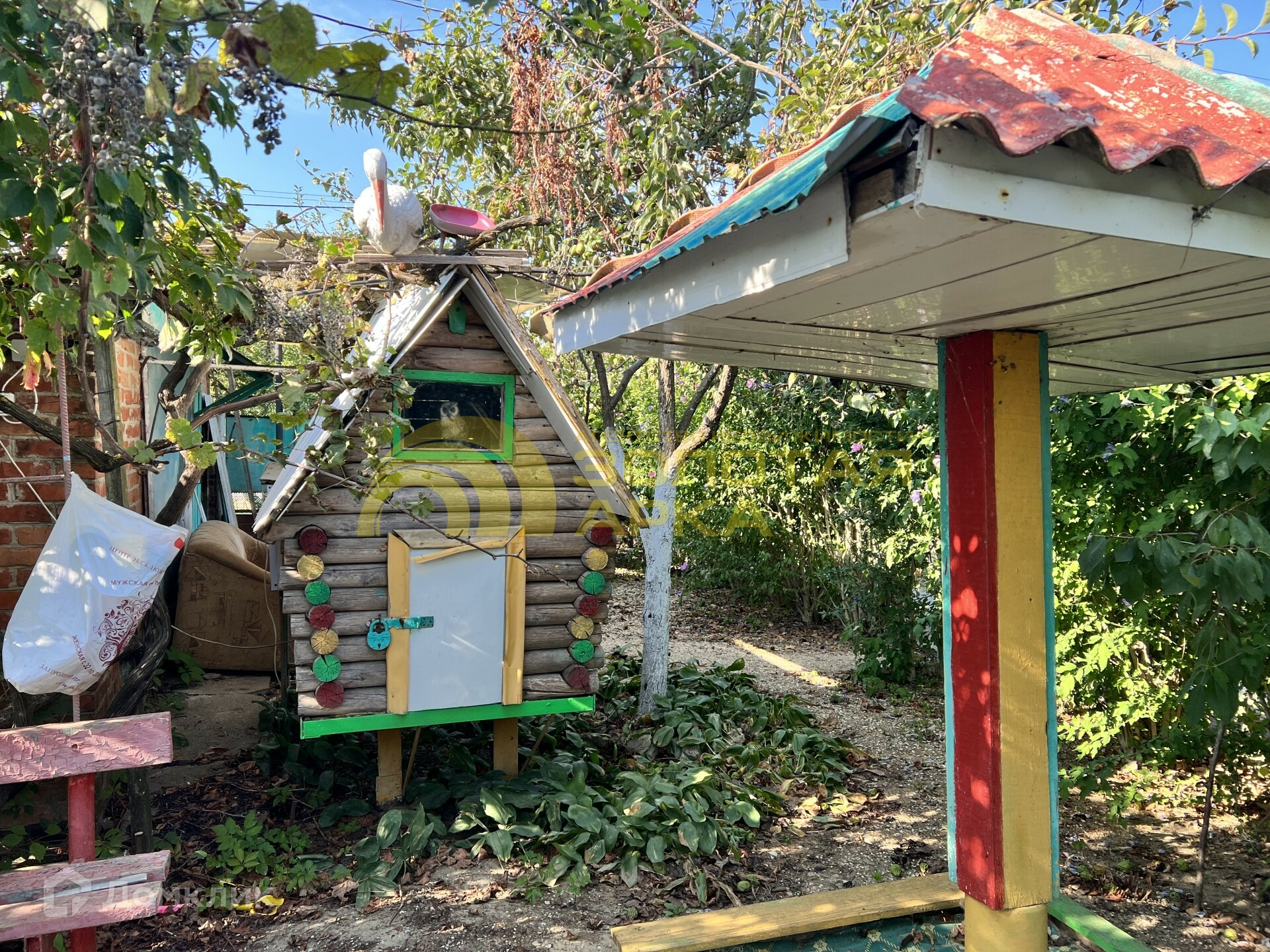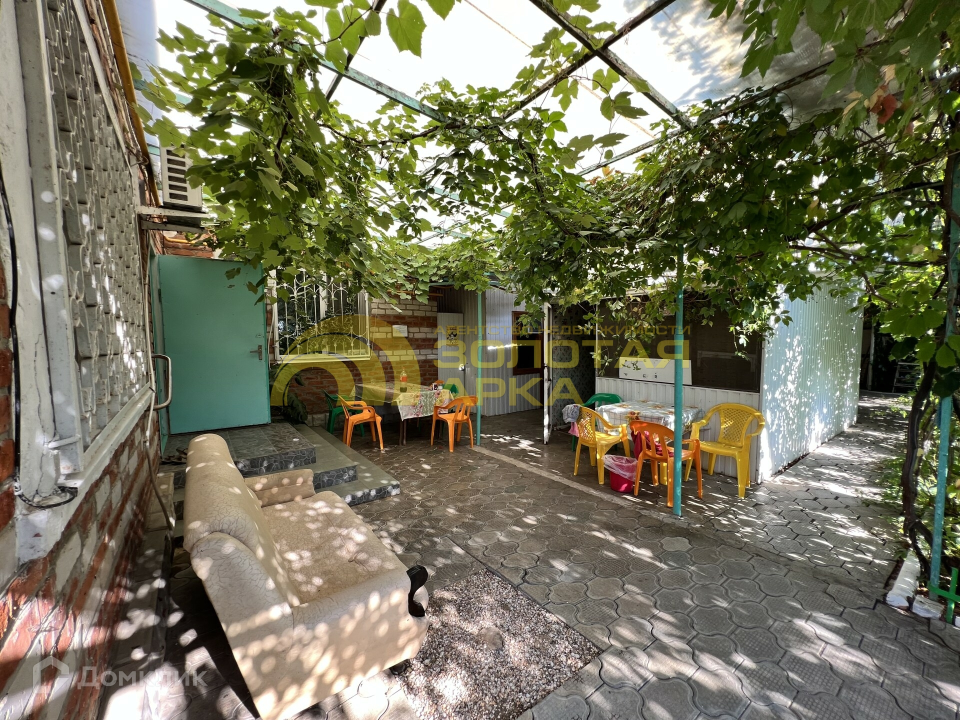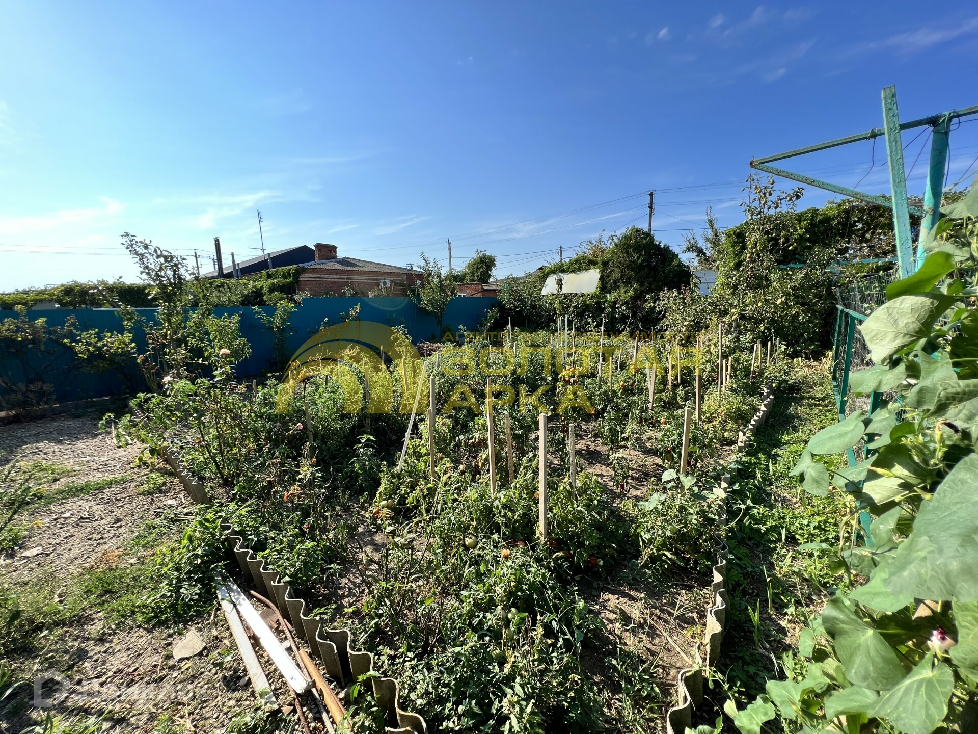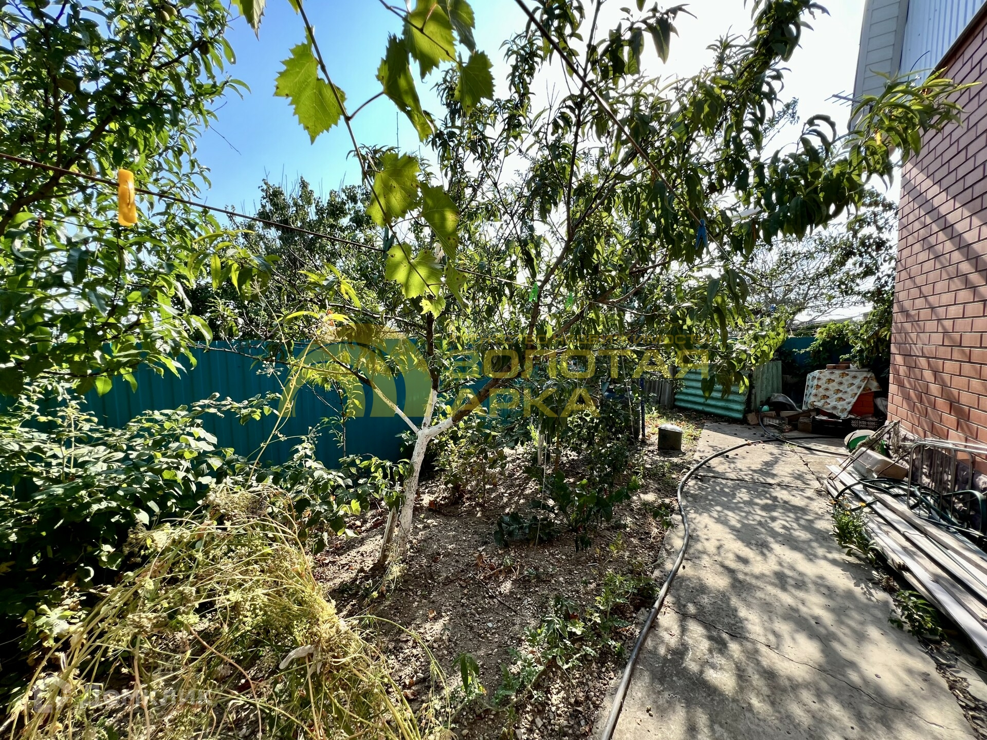 Закрытая территория с зоной для отдыха:мангал, детская площадка, беседка. Везде высажены декоративные кустарники, цветы.