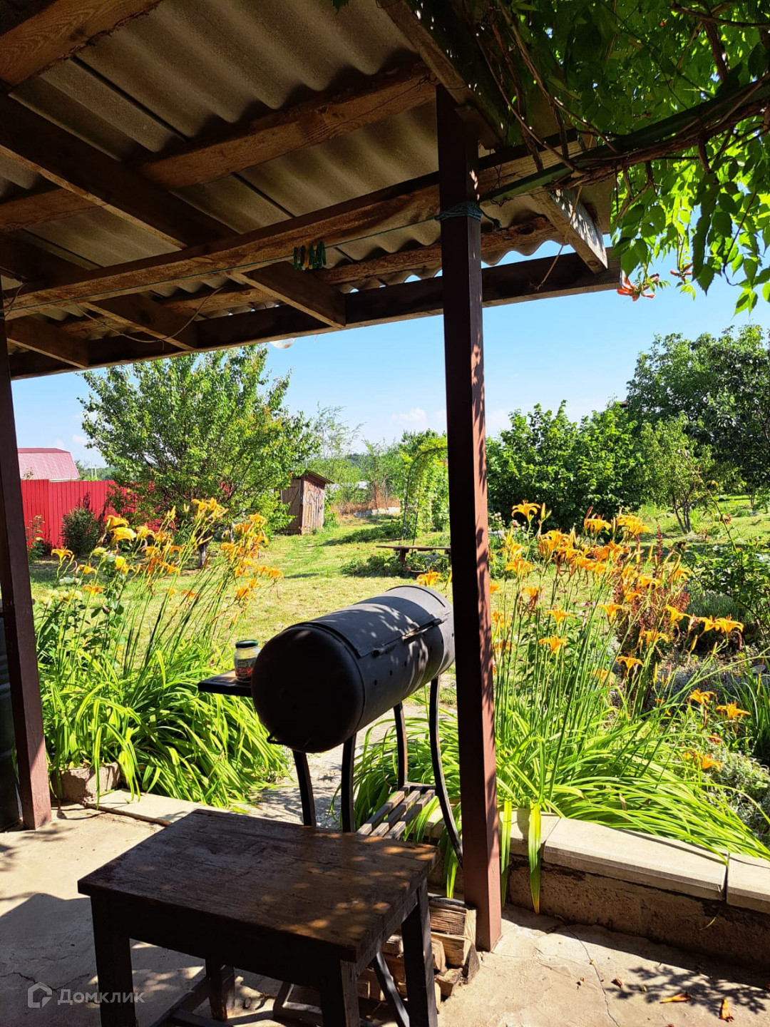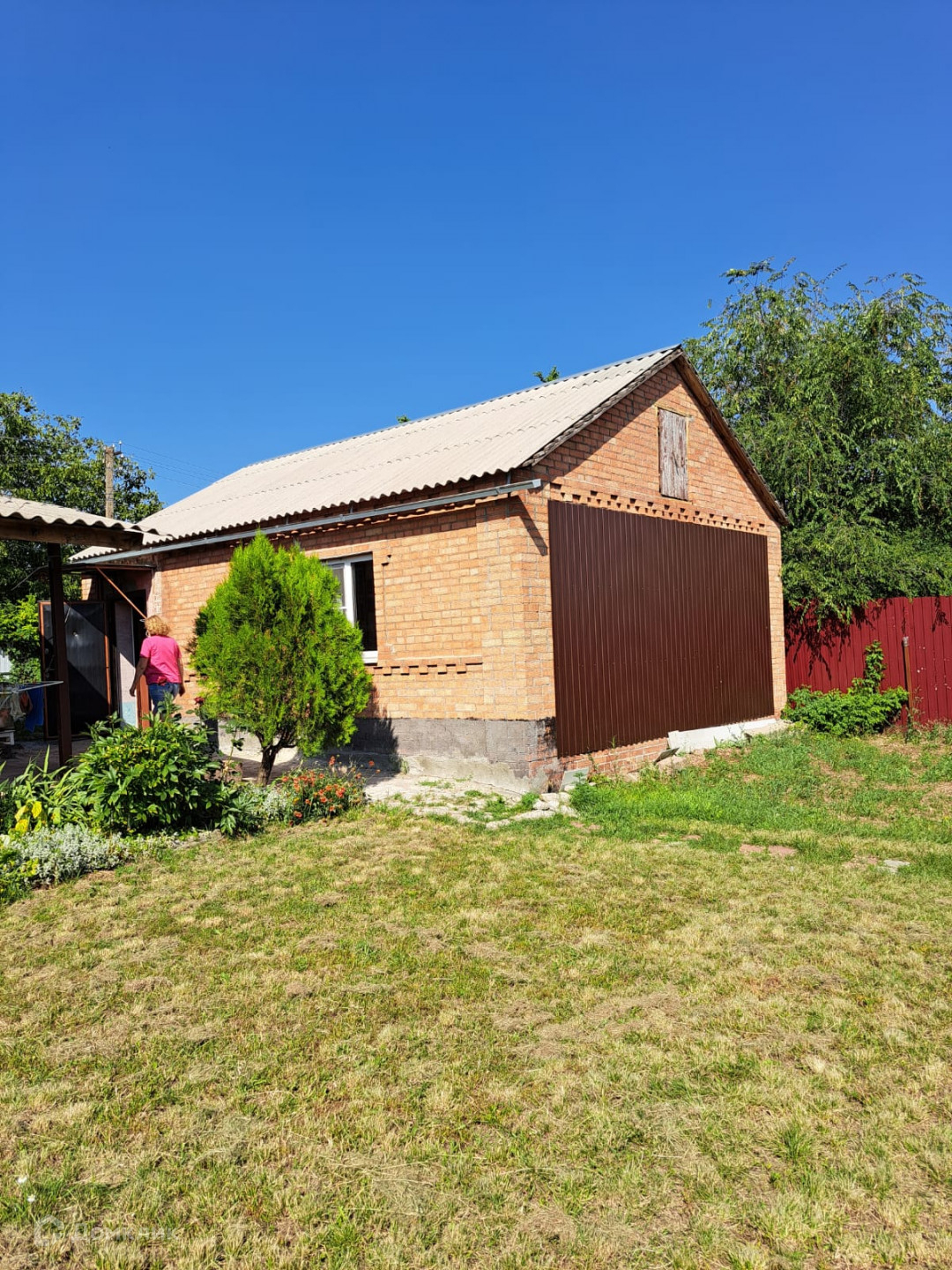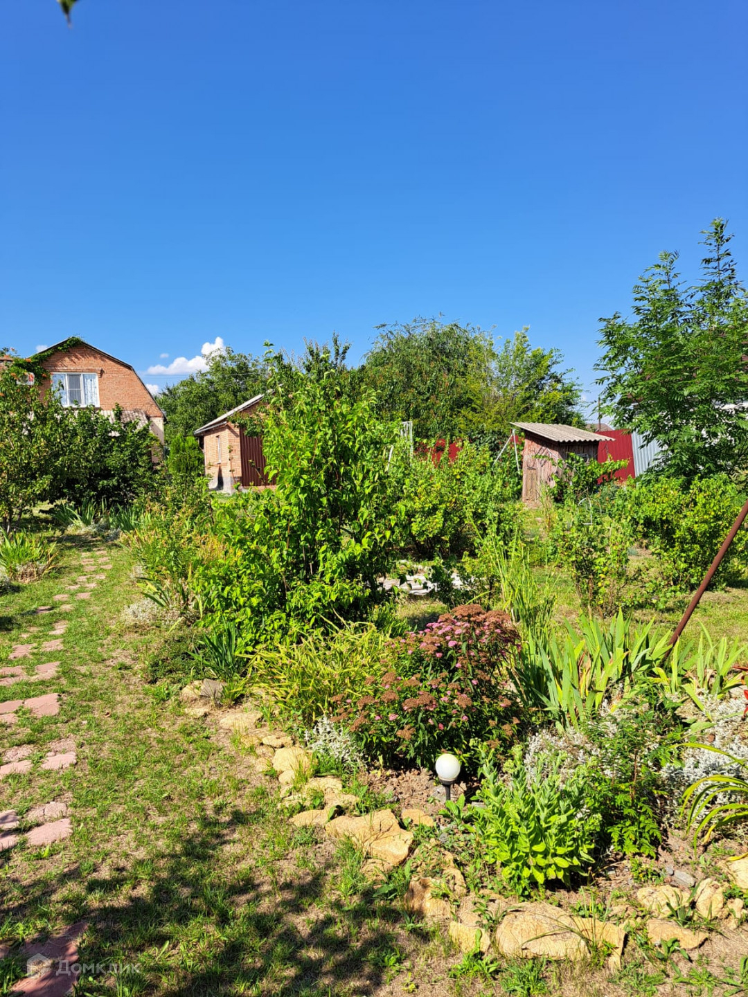 Во дворе плодовые деревья, кустарники, виноград, клумбы с цветами и хвойными растениями.