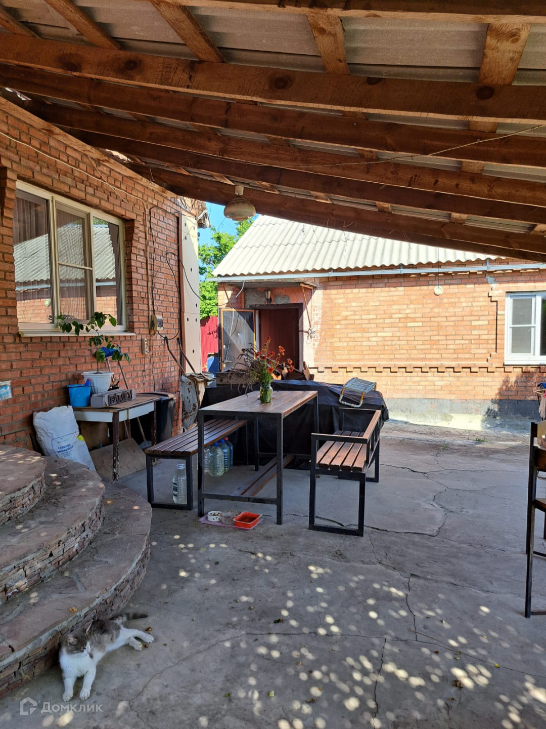 Двор выложен плиткой.