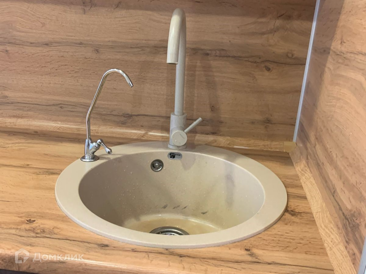 Кухня – на полу линолеум в цвет ламината, установлен дорогой гарнитур, который был сделан под заказ, встроенная бытовая техника — это электрический духовой шкаф «Леран», газовая варочная панель «Горение», посудомоечная машина «Хаер», отдельный водонагреватель «Фермекс». Все это дополняет практичная стильная моечная и сантехника с фильтром для воды.