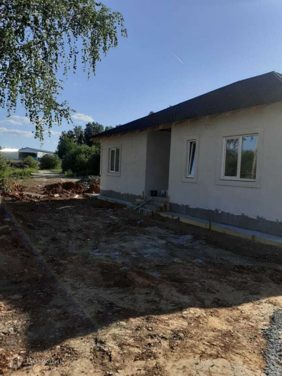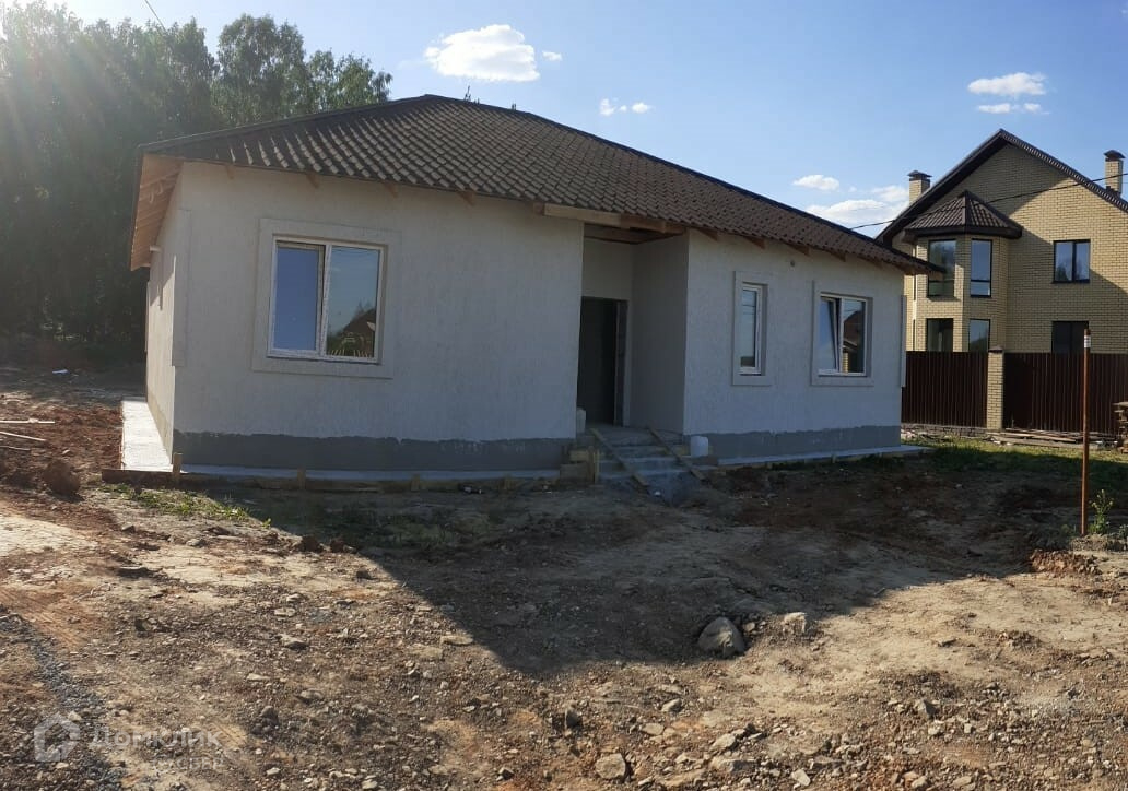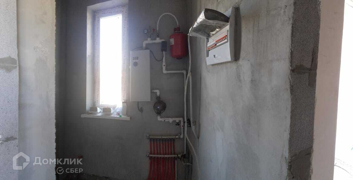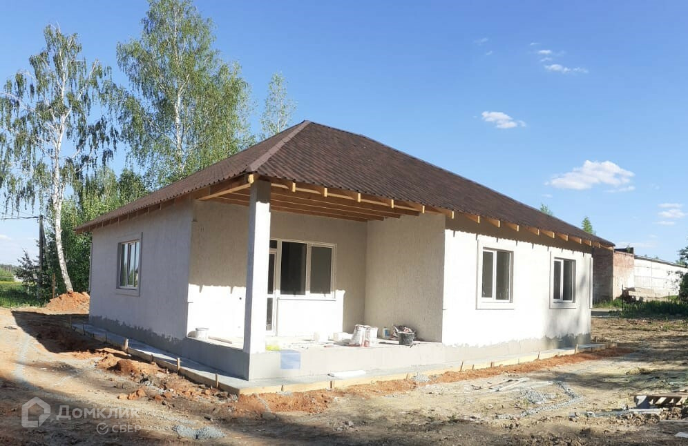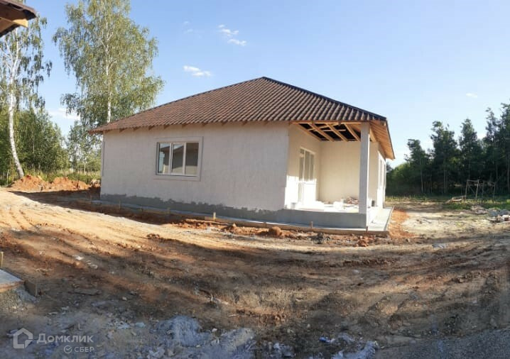 Дом сделан из блока, имеет электрическое отопление(котёл 12Квт), водяные тёплые полы. Проведён центральный водопровод, горячая и холодная вода, канализация (выгреб), по всему дому сделана электропроводка. Стены в доме отштукатурены под чистовую отделку. Перекрытия деревянные.На кухне проведена вентиляция, сделан кухонный шкаф. В доме размещены: котельная, тамбур, гардеробная, санузел, кухня-гостиная с тремя  окнами и выходом на террасу, три комнаты.